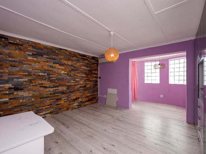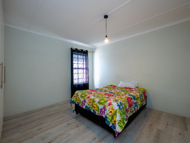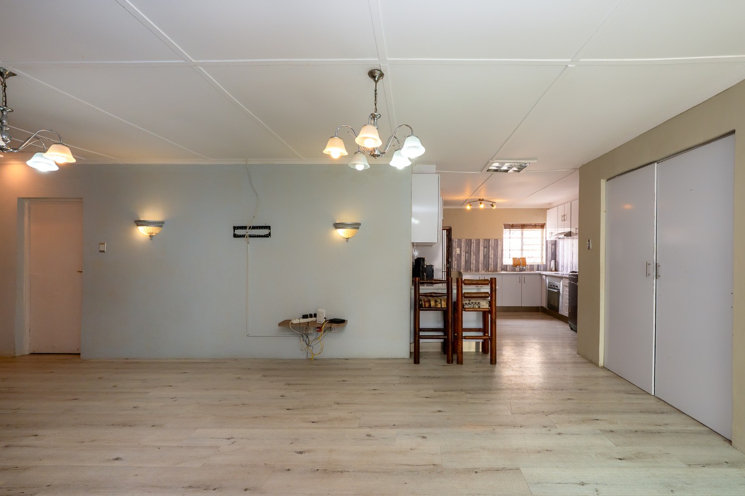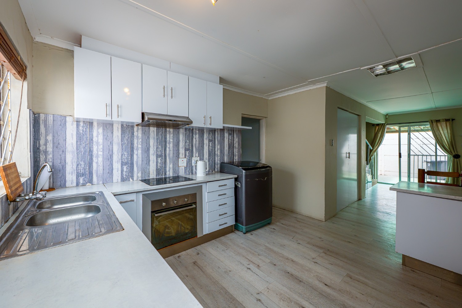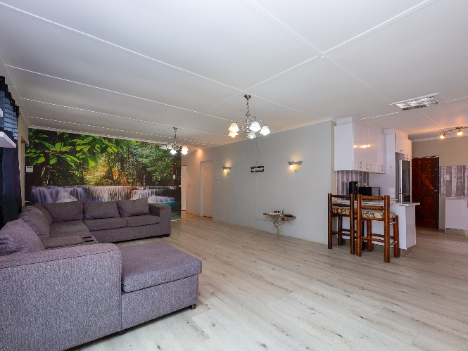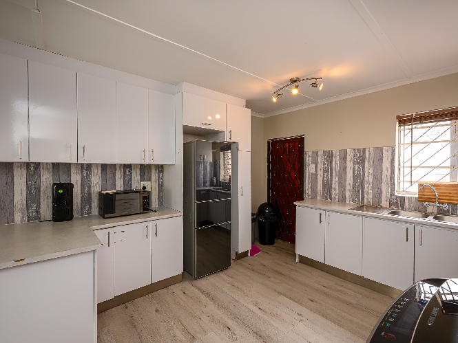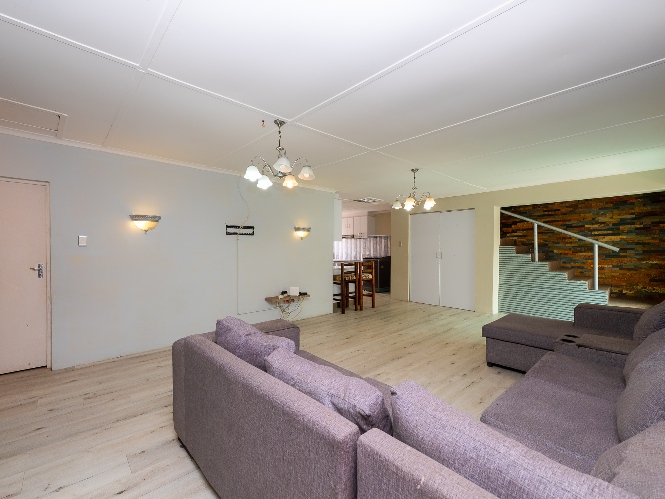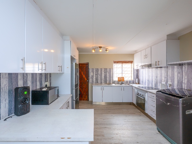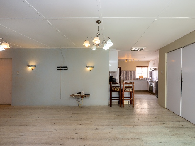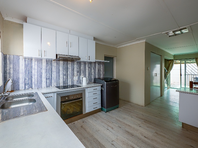 The ground floor features a large living room with ample space for a dining area and beautiful flooring that creates a warm and welcoming atmosphere. The modern impeccably designed kitchen is fitted with light-wood cupboards, an under-counter oven and hob, ample countertop space, one plumbing point, and space for a fridge.