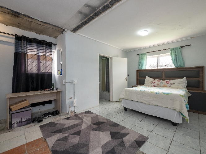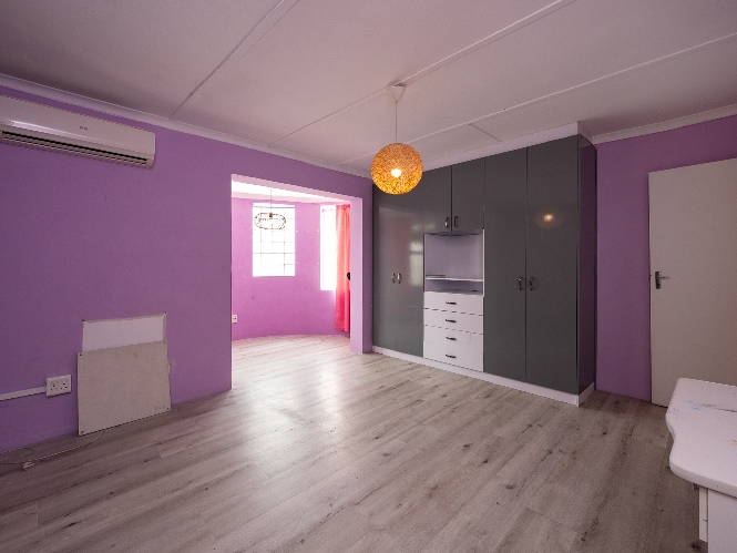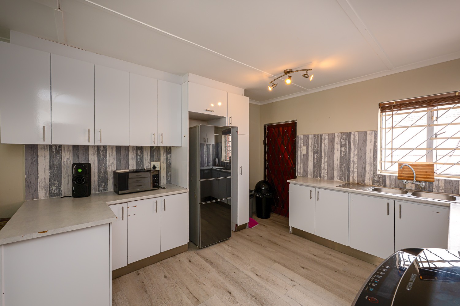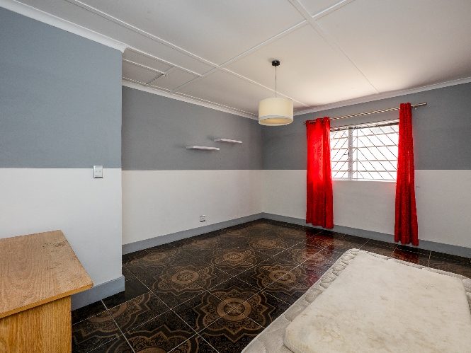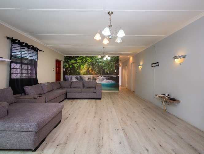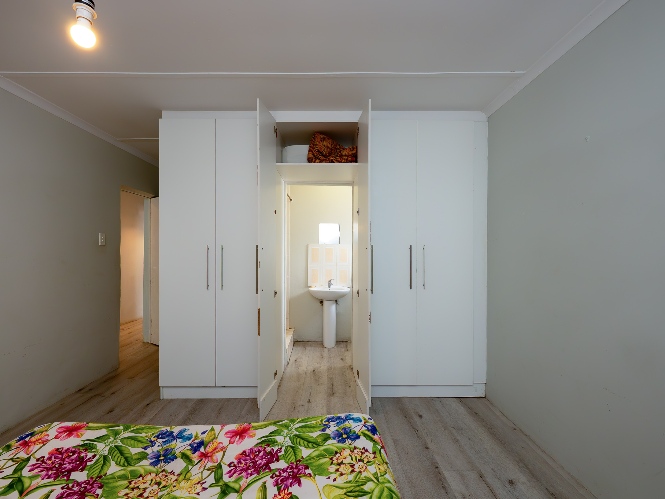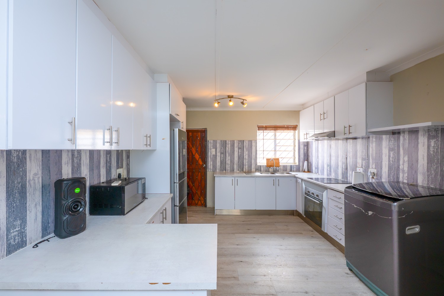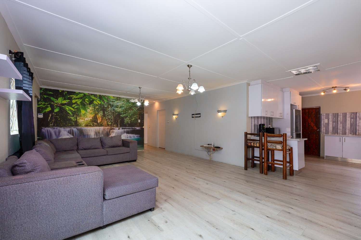 The ground floor features a large living room with ample space for a dining area and beautiful flooring that creates a warm and welcoming atmosphere. The modern impeccably designed kitchen is fitted with light-wood cupboards, an under-counter oven and hob, ample countertop space, one plumbing point, and space for a fridge.