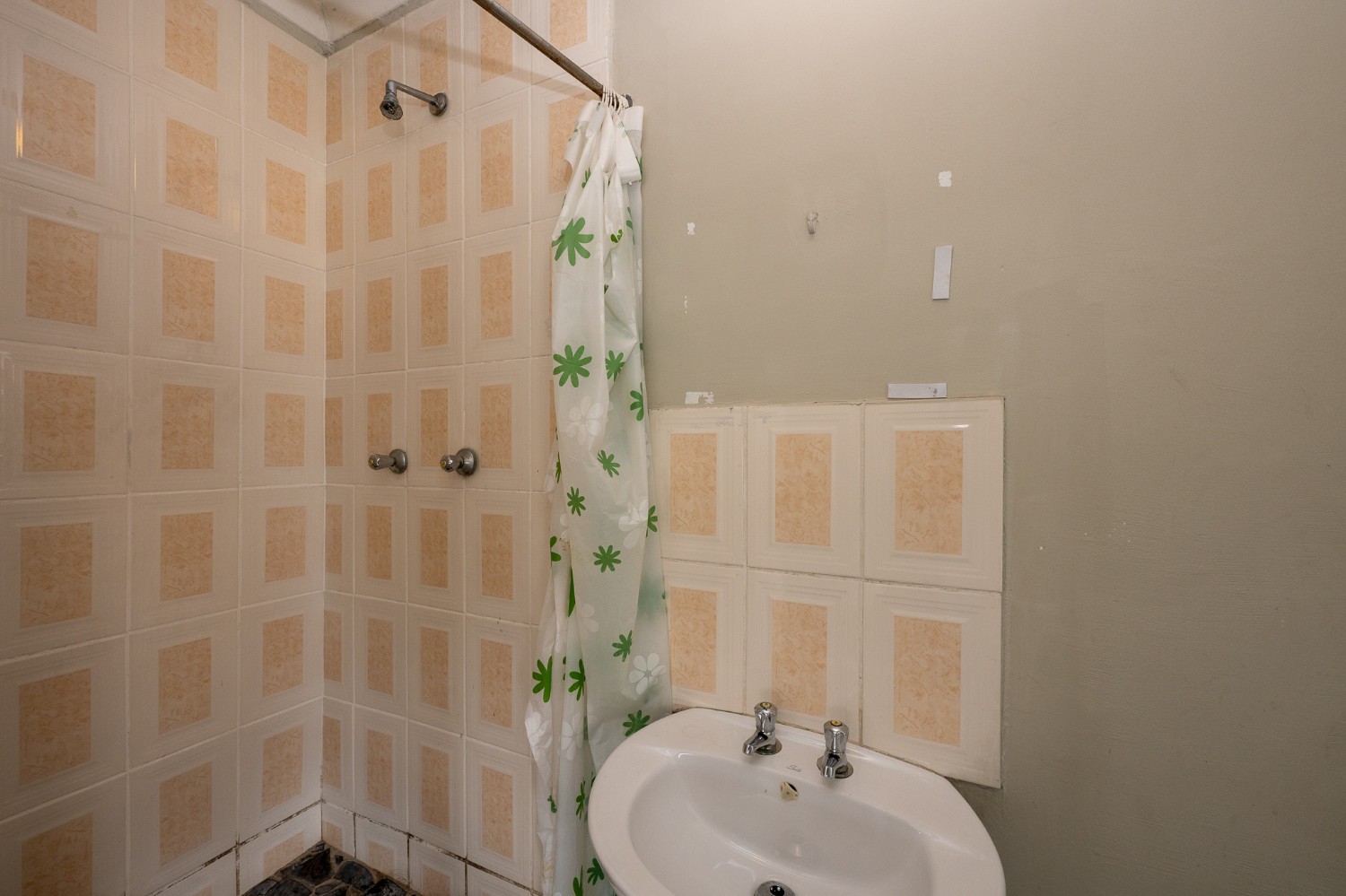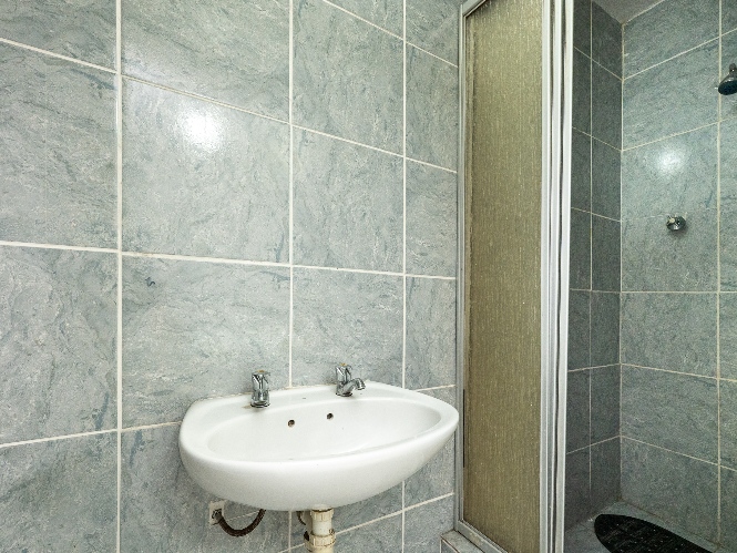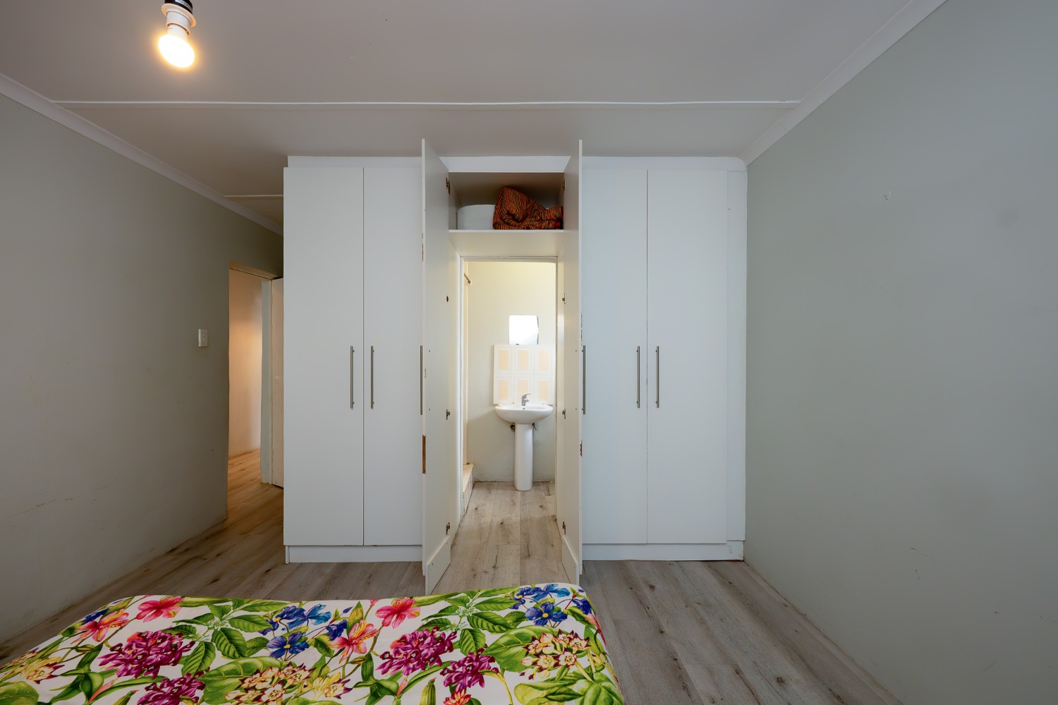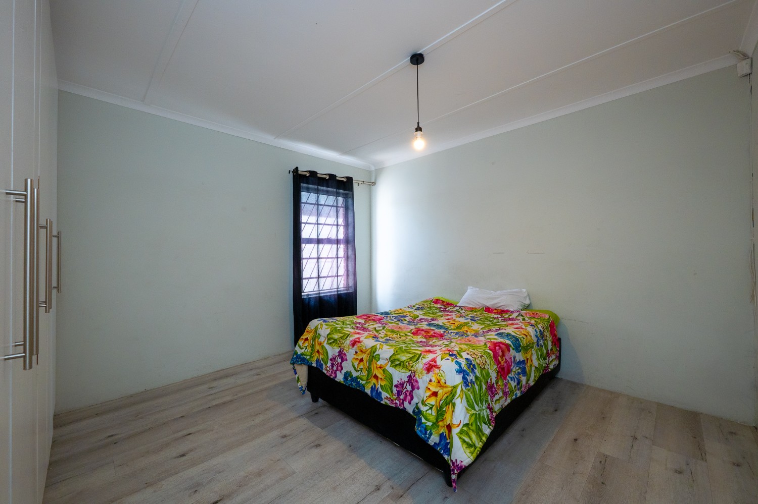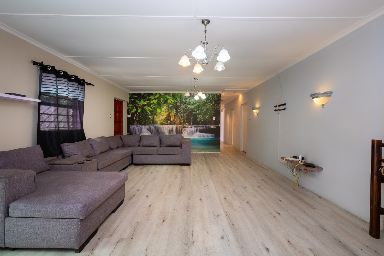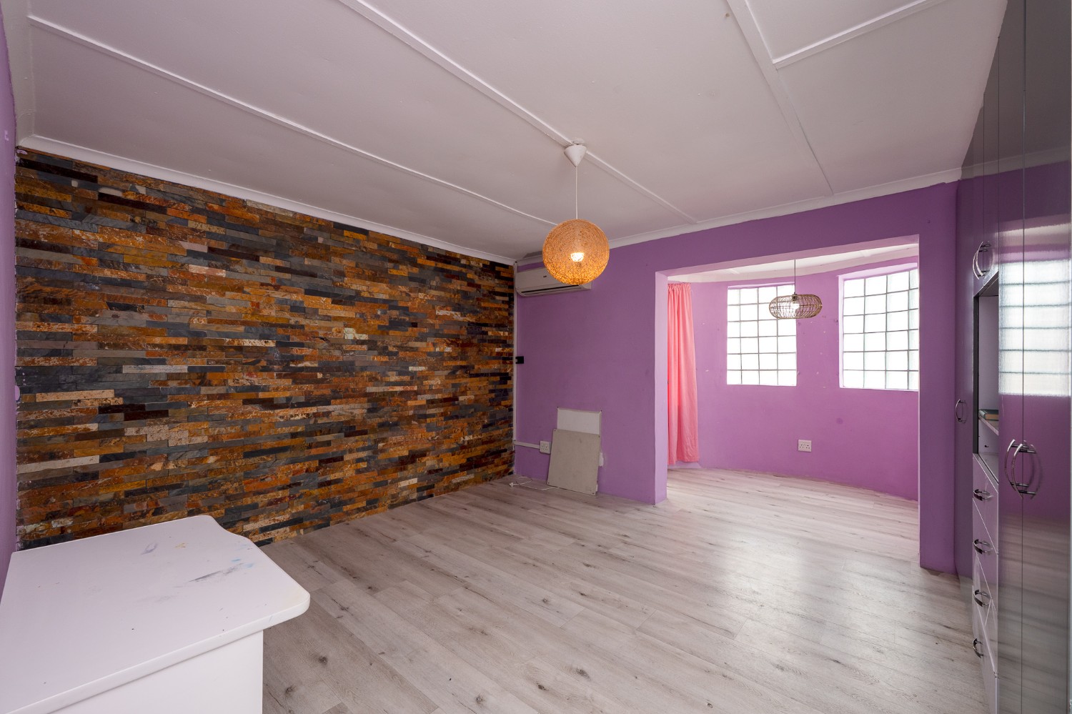 The ground floor features a large living room with ample space for a dining area and beautiful flooring that creates a warm and welcoming atmosphere. The modern impeccably designed kitchen is fitted with light-wood cupboards, an under-counter oven and hob, ample countertop space, one plumbing point, and space for a fridge.