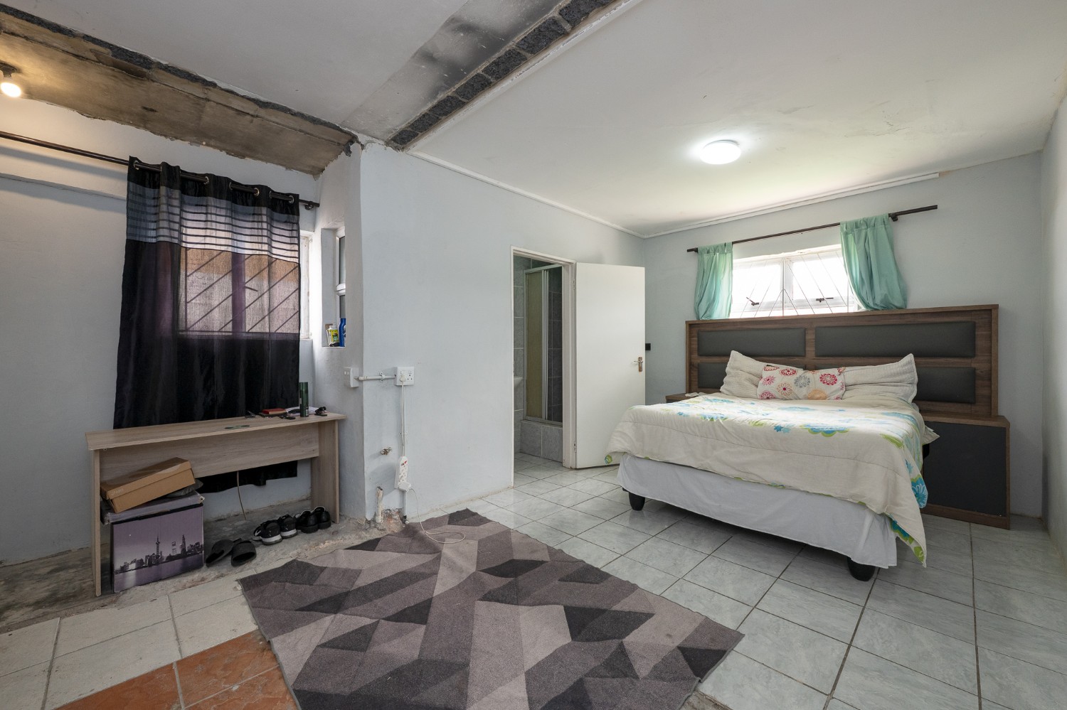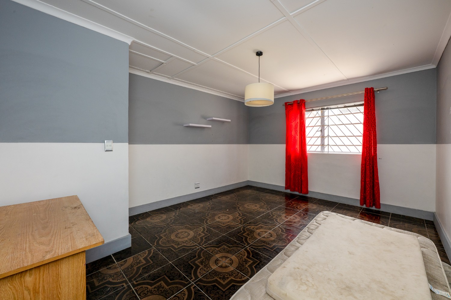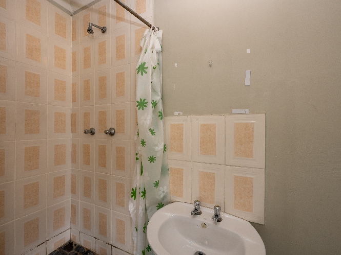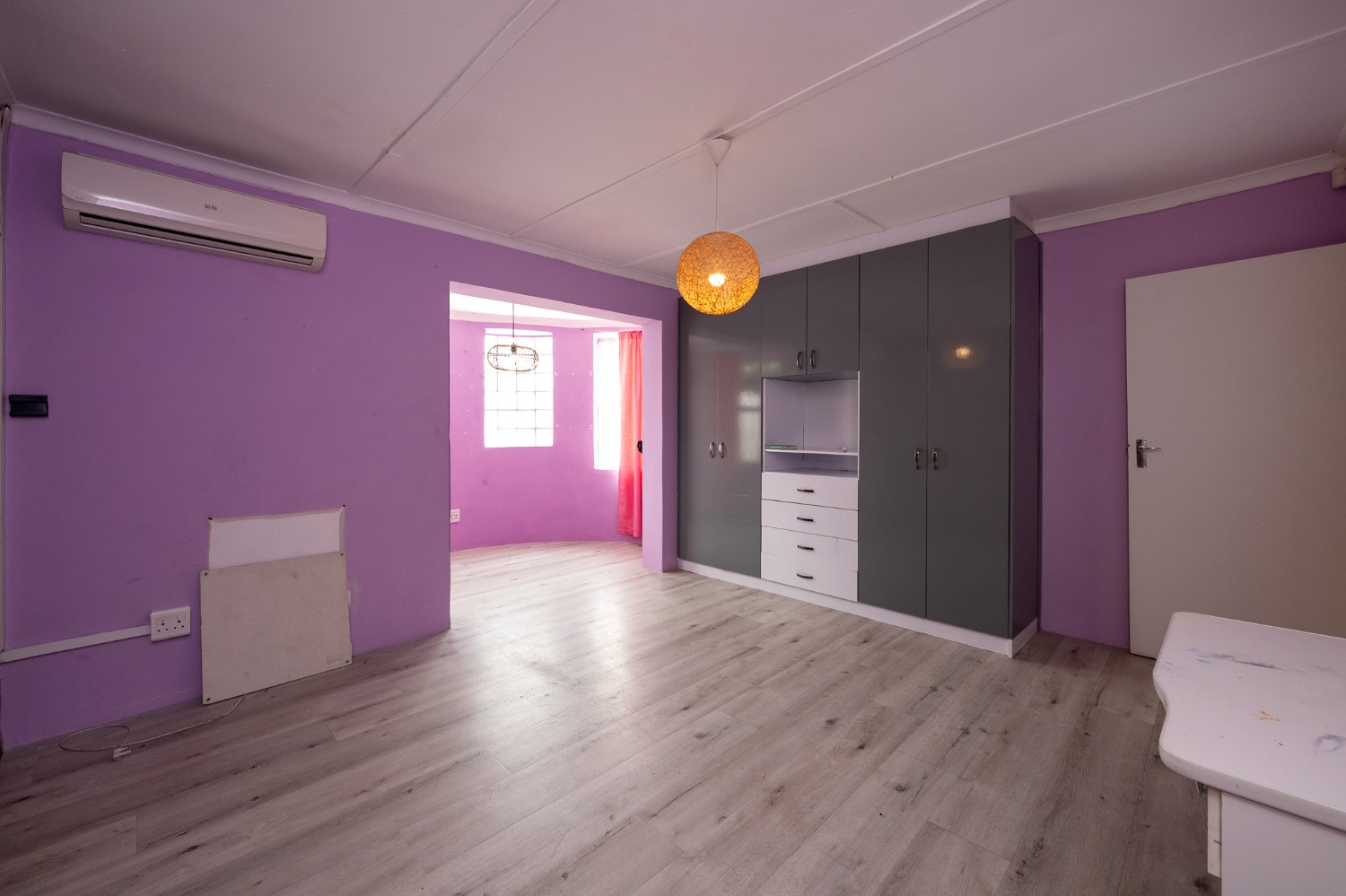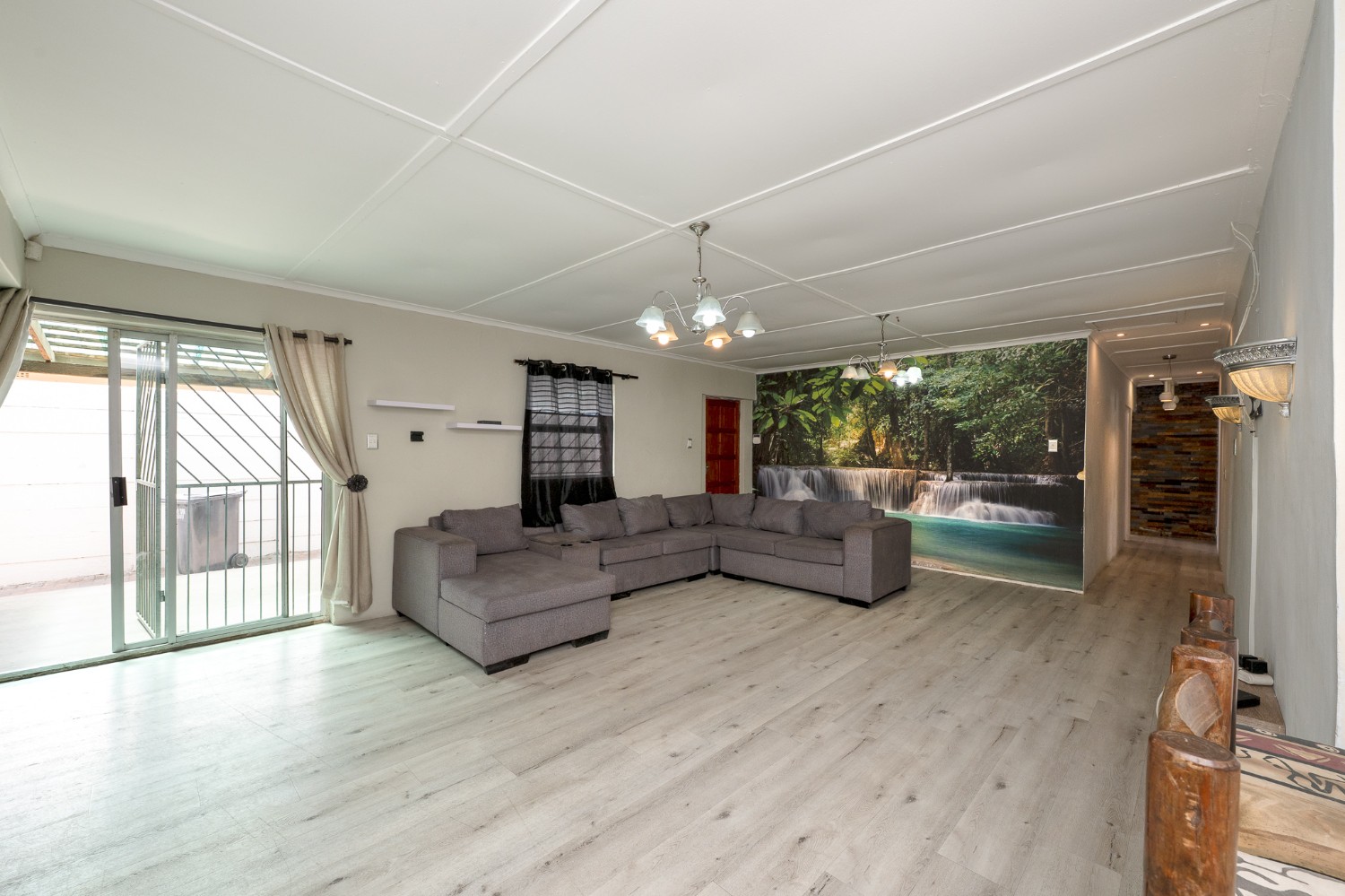 The ground floor features a large living room with ample space for a dining area and beautiful flooring that creates a warm and welcoming atmosphere. The modern impeccably designed kitchen is fitted with light-wood cupboards, an under-counter oven and hob, ample countertop space, one plumbing point, and space for a fridge.