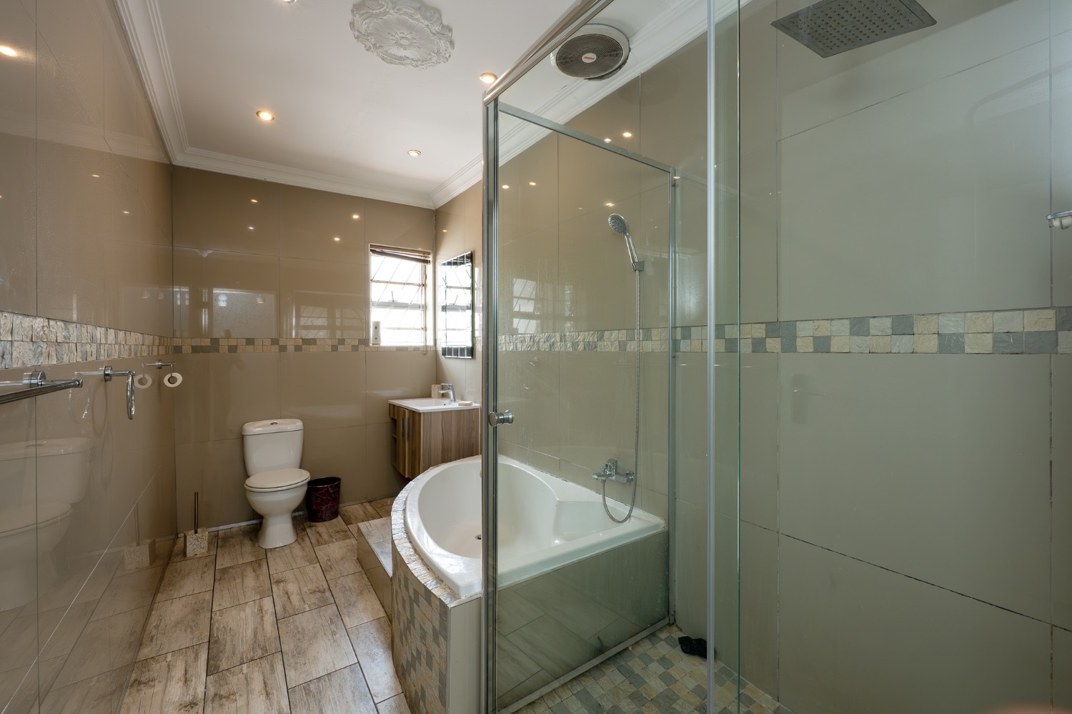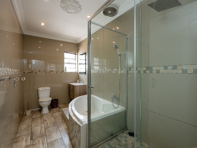 This impressive home boasts four large bedrooms, two of which include en-suite bathrooms for added privacy and comfort. Upstairs, you will find a generously sized entertainment and lounge area complete with a built-in bar and direct access to a balcony, offering the perfect setting for hosting guests or relaxing with family. A guest bathroom is also available on this level. The family bathroom is equipped with a shower, a corner bathtub, a basin, and a toilet.