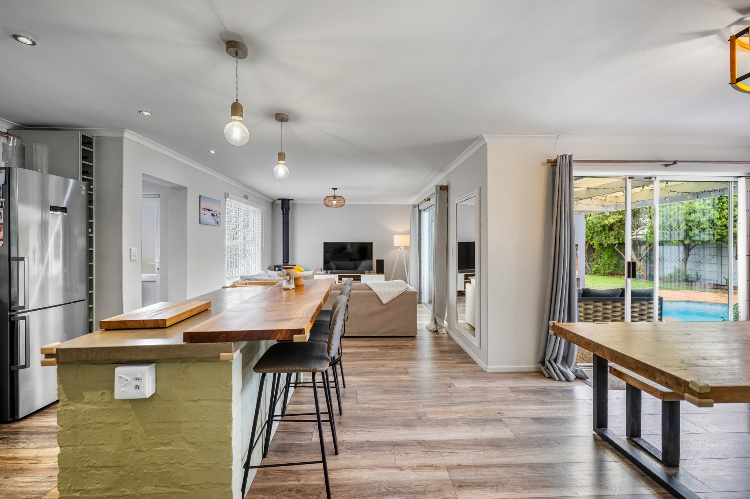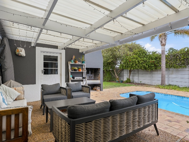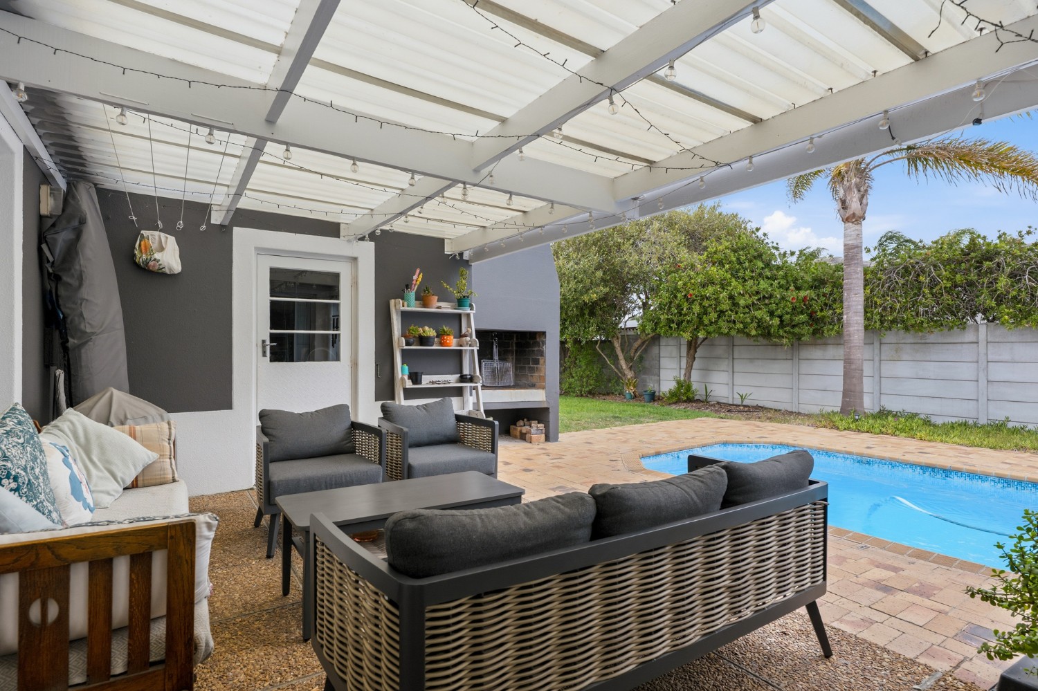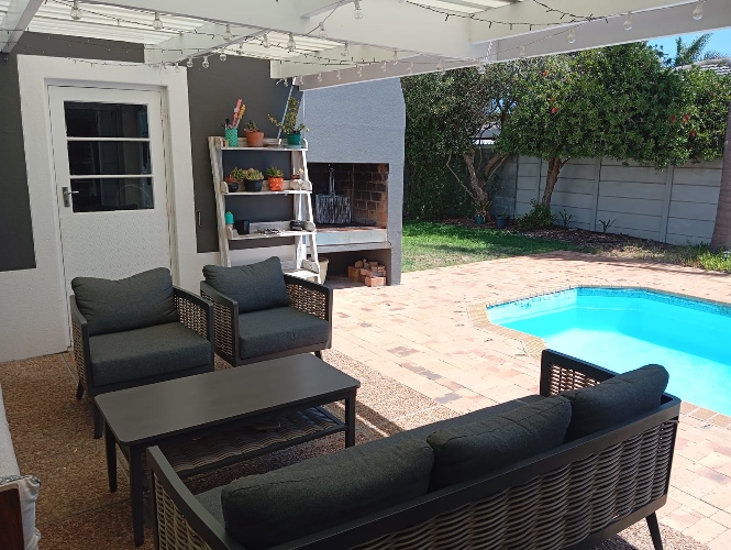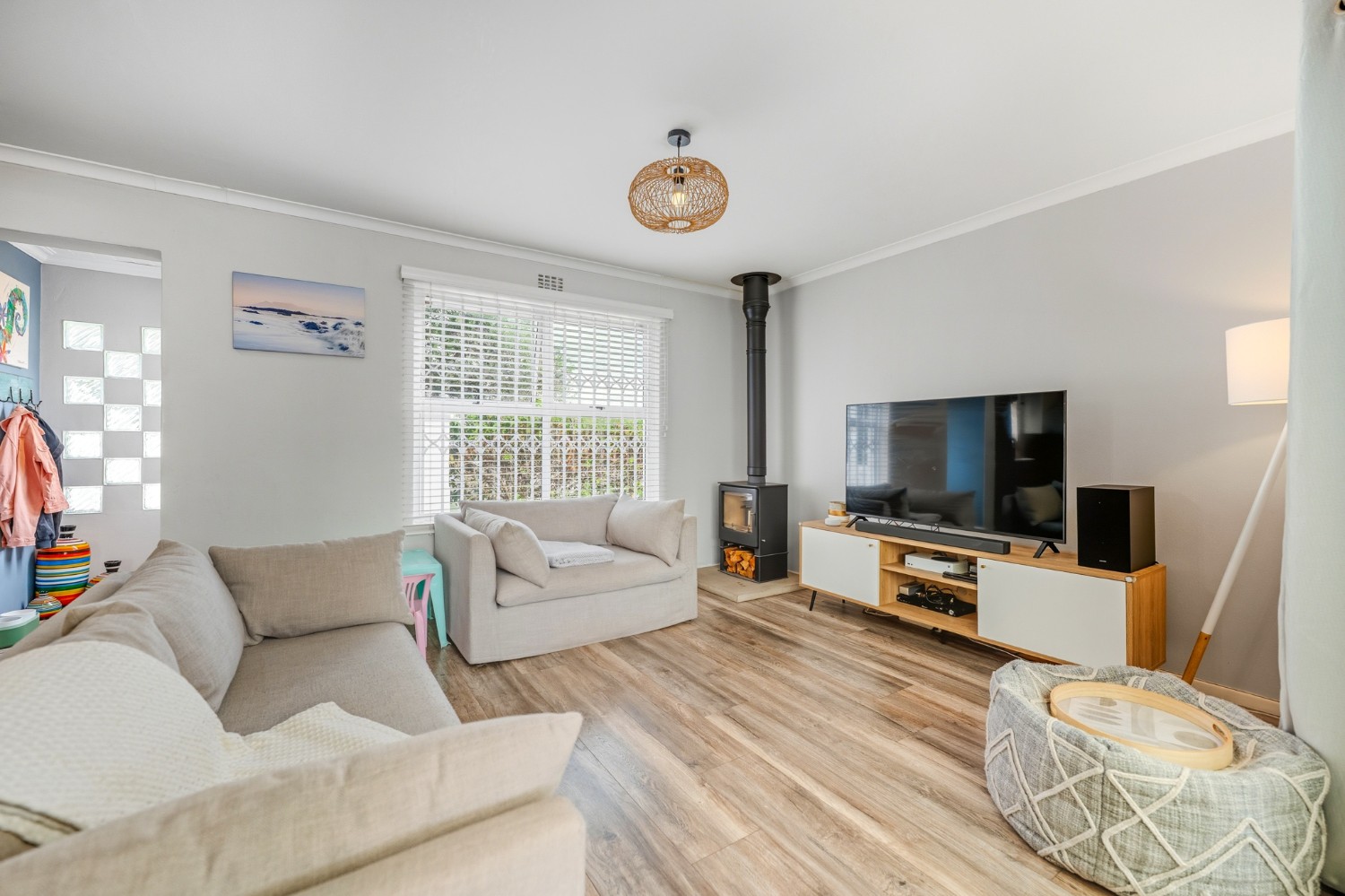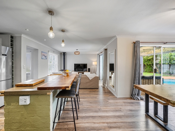 The lovely country-style kitchen forms the heart of the home, flowing effortlessly into the living space and out onto a covered patio with a built-in braai — perfect for entertaining.