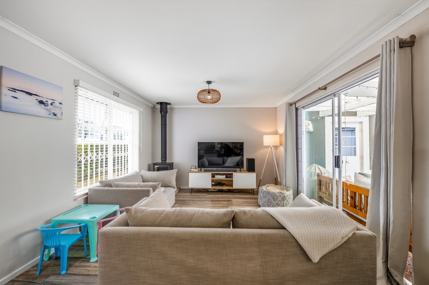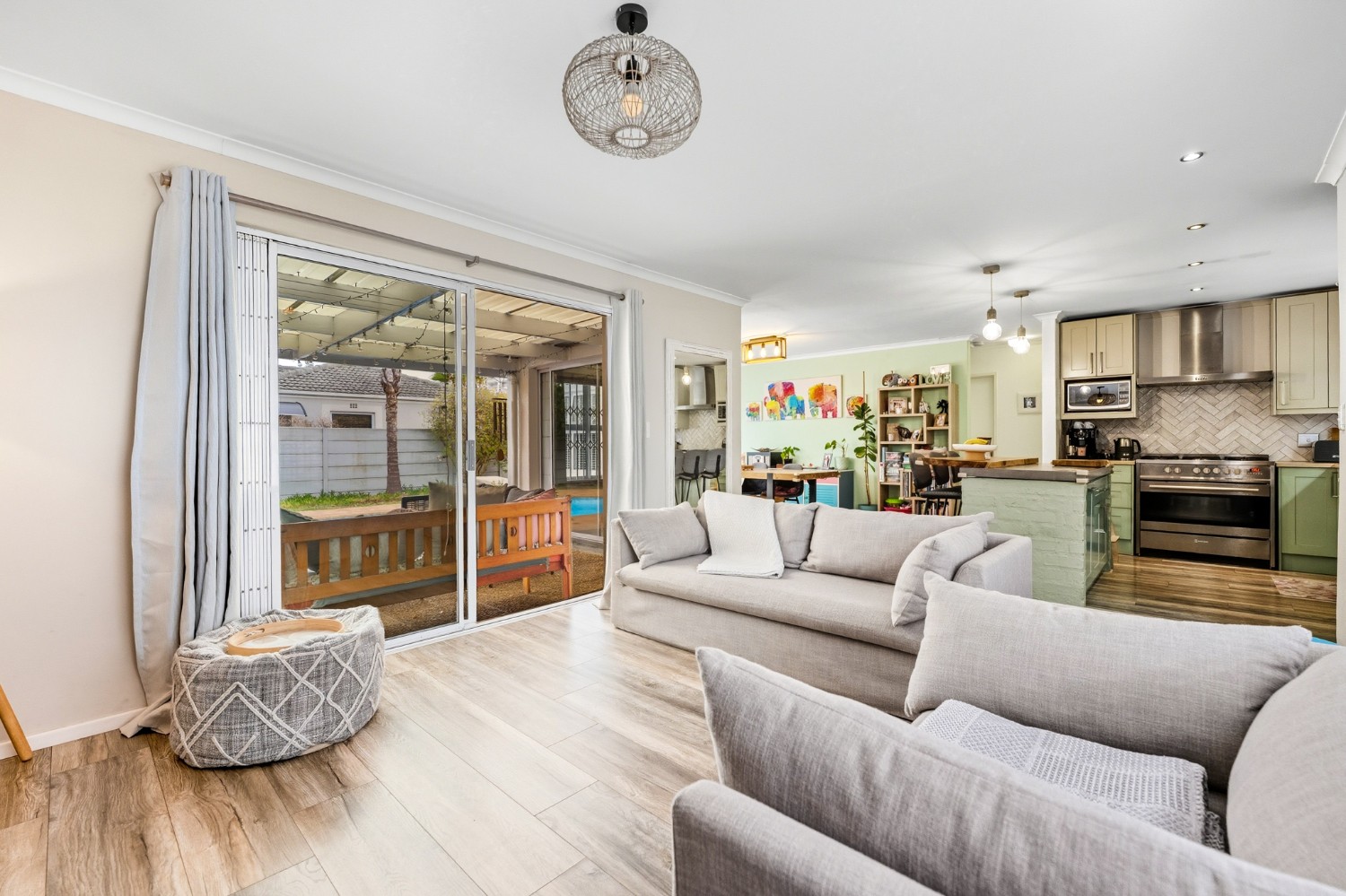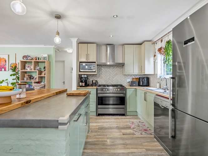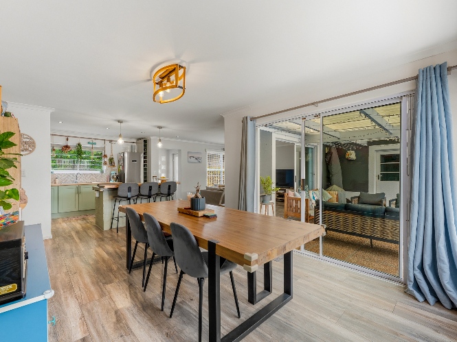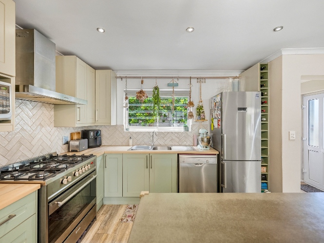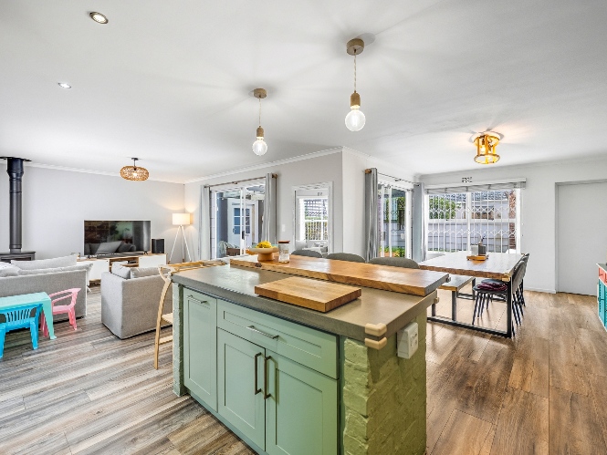 The lovely country-style kitchen forms the heart of the home, flowing effortlessly into the living space and out onto a covered patio with a built-in braai — perfect for entertaining.