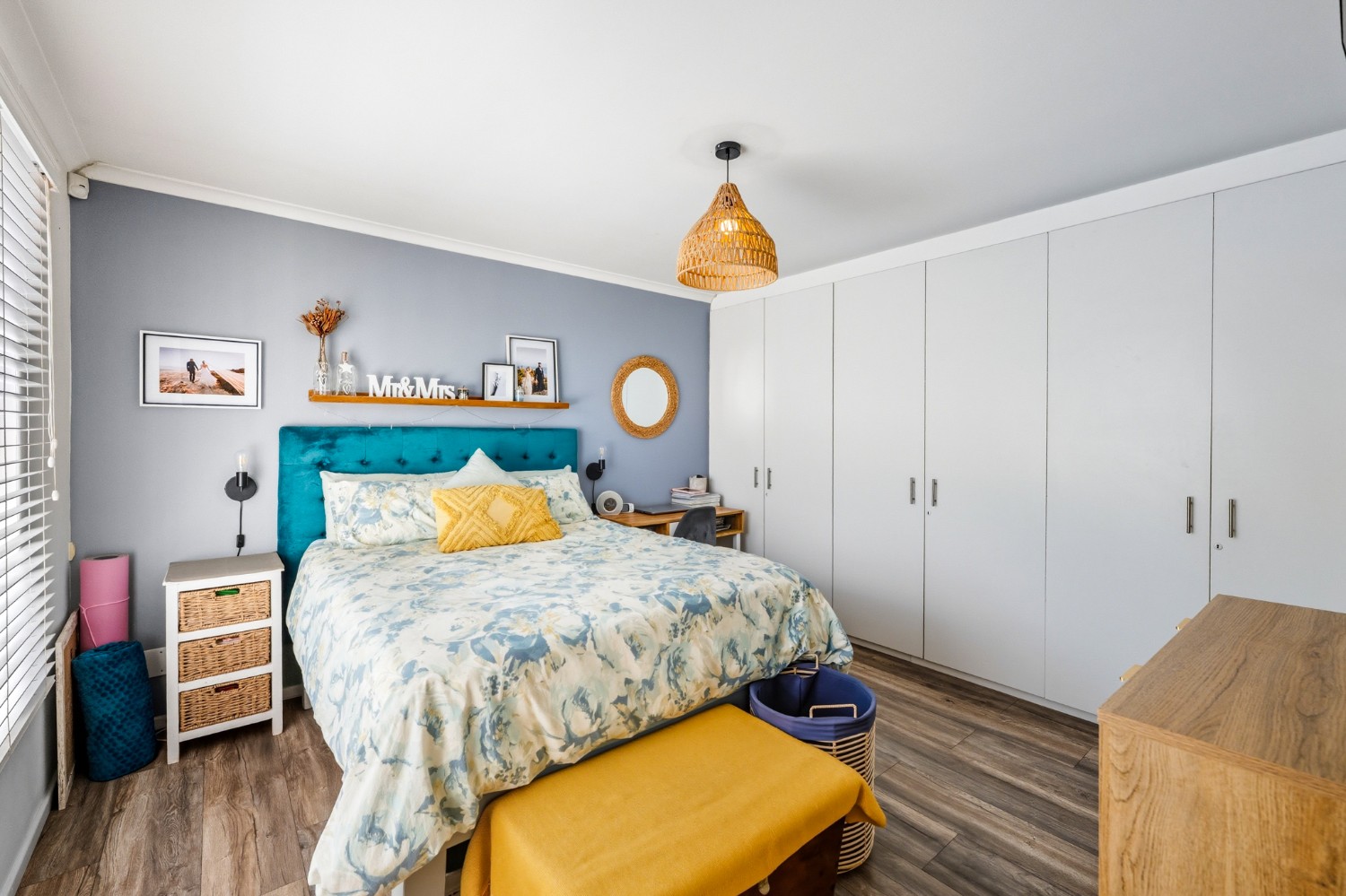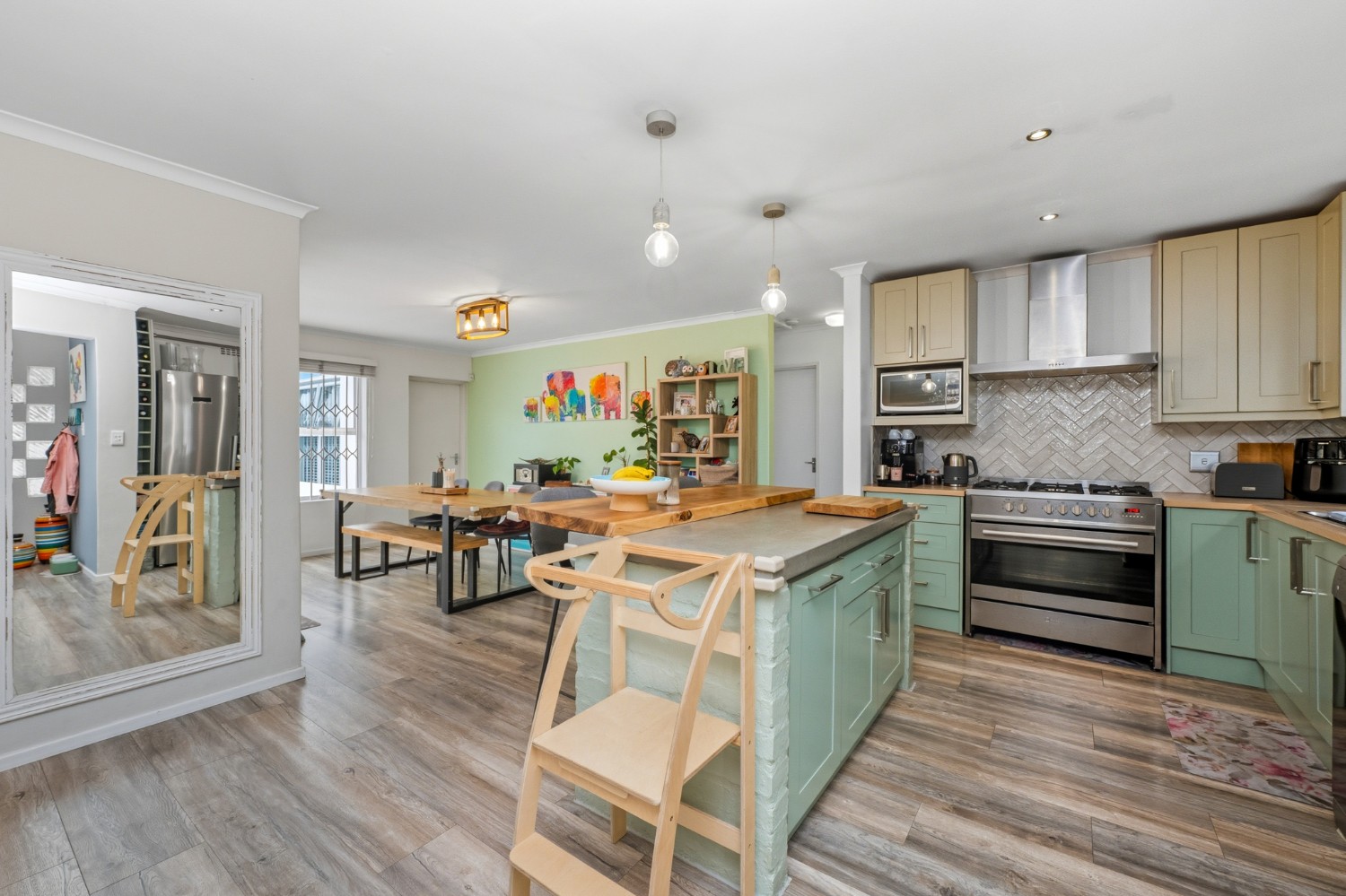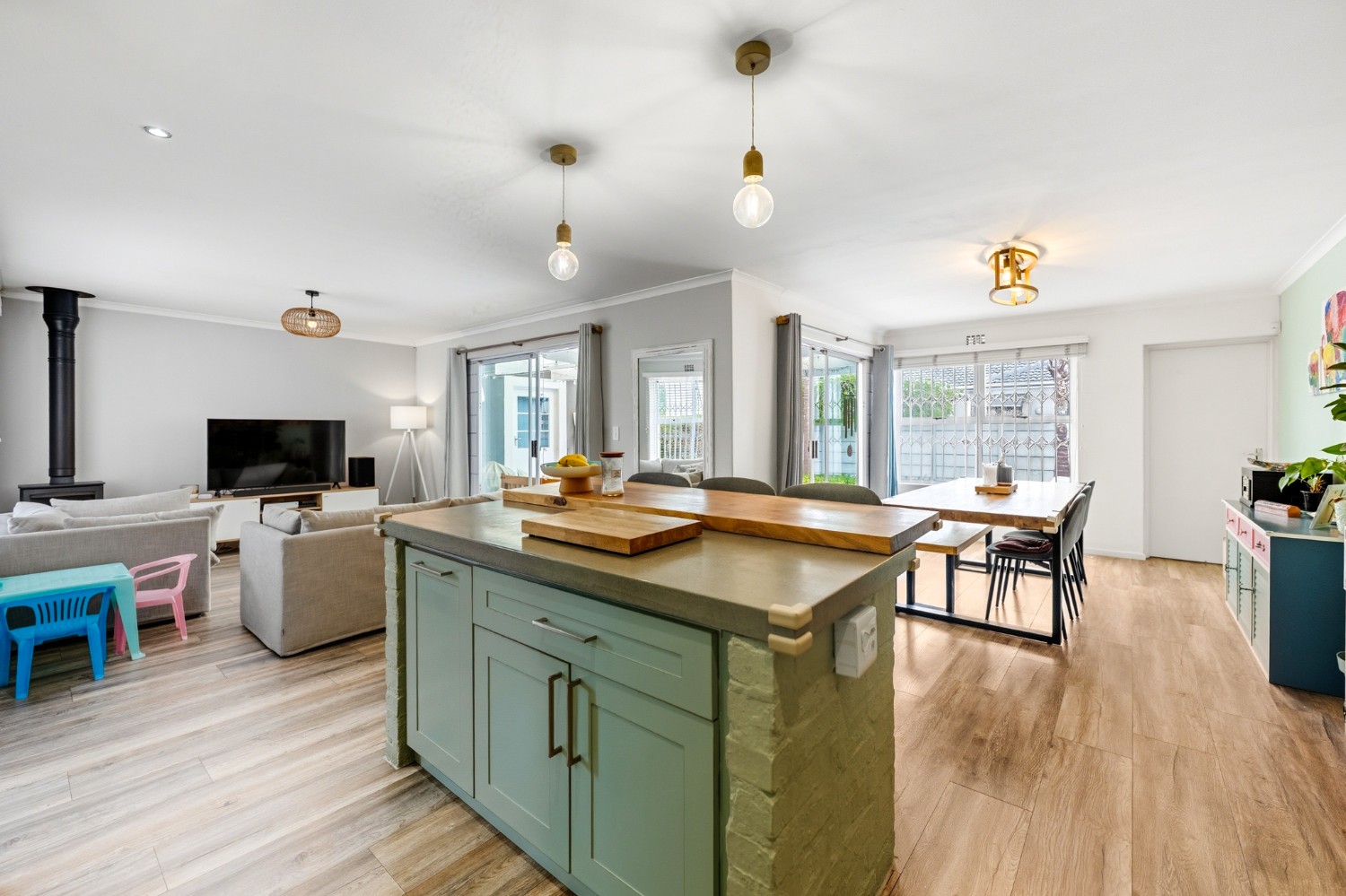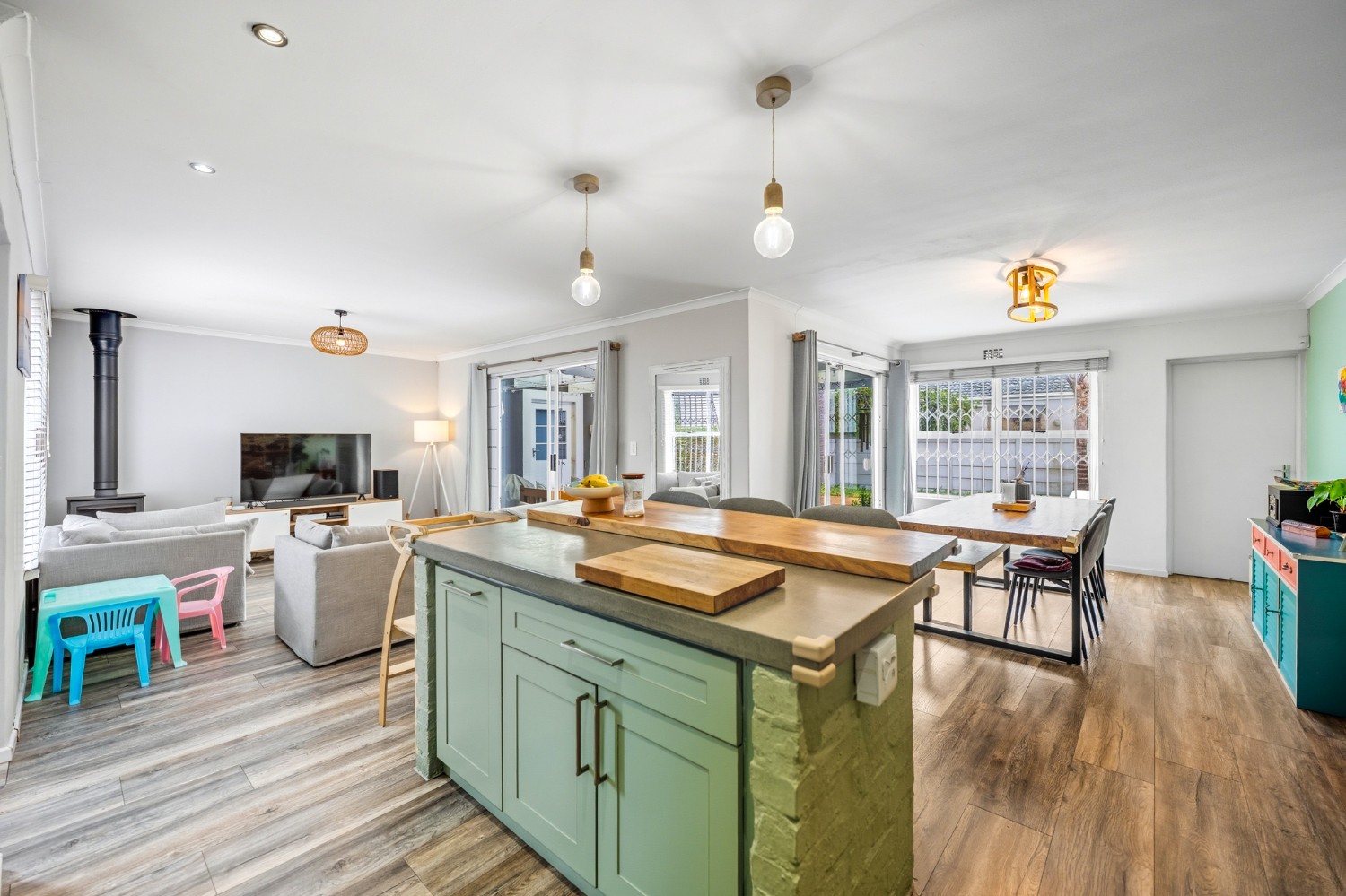 The lovely country-style kitchen forms the heart of the home, flowing effortlessly into the living space and out onto a covered patio with a built-in braai — perfect for entertaining.