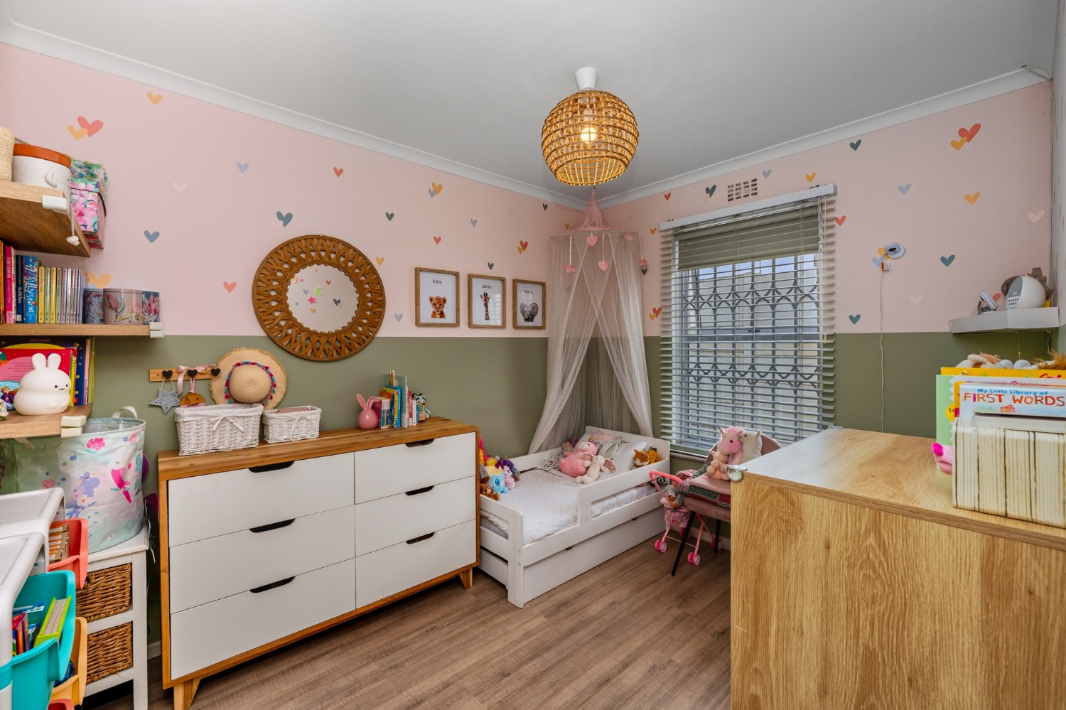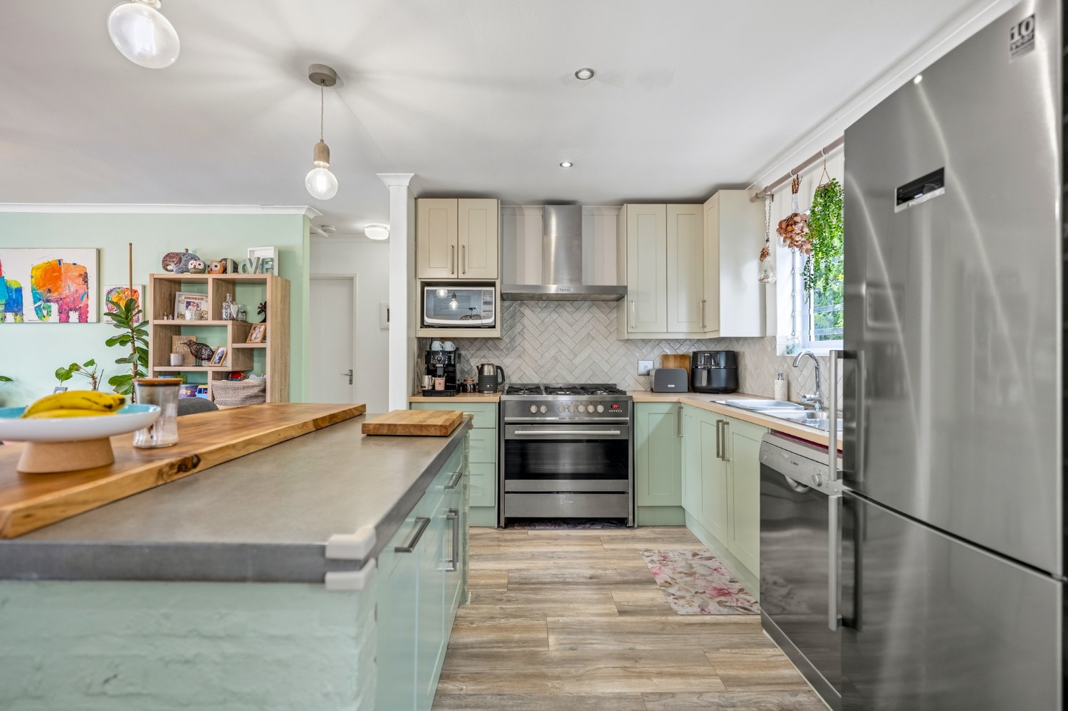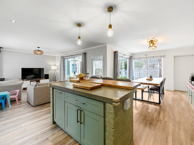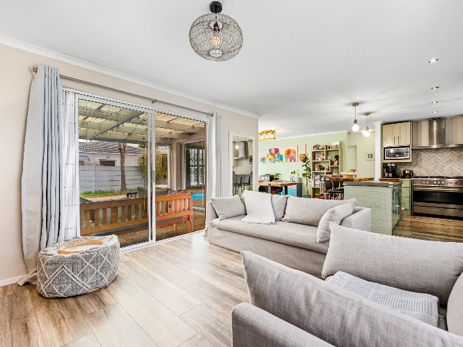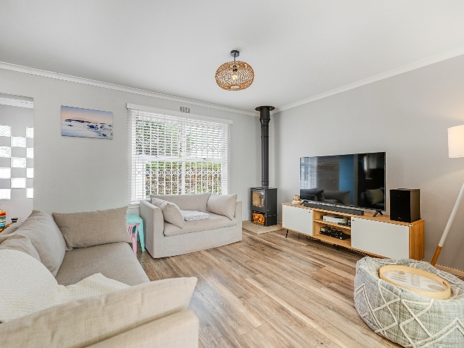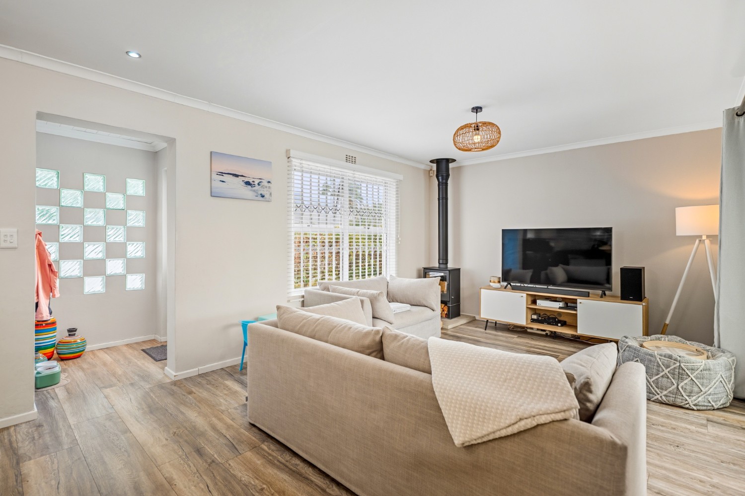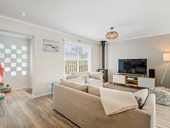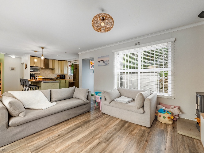 The property features 3 well-sized bedrooms and 2 bathrooms, with the main bedroom boasting a private en-suite. Designed for easy family living, the home offers a welcoming open-plan living area with a fireplace, creating a warm and inviting atmosphere.