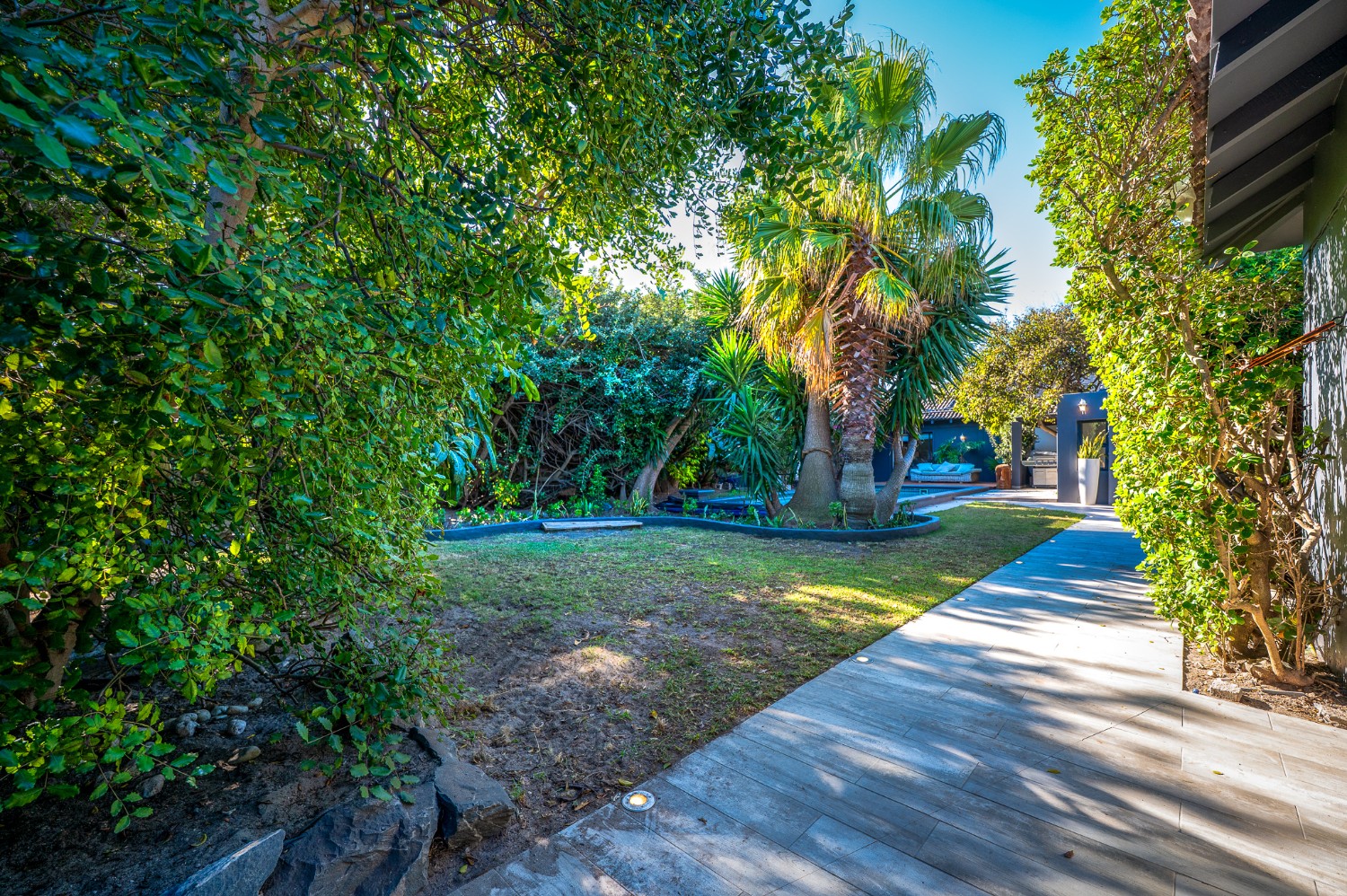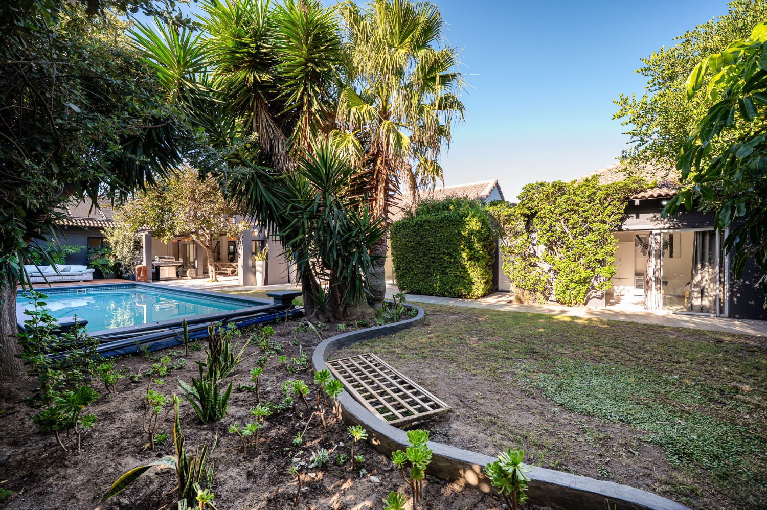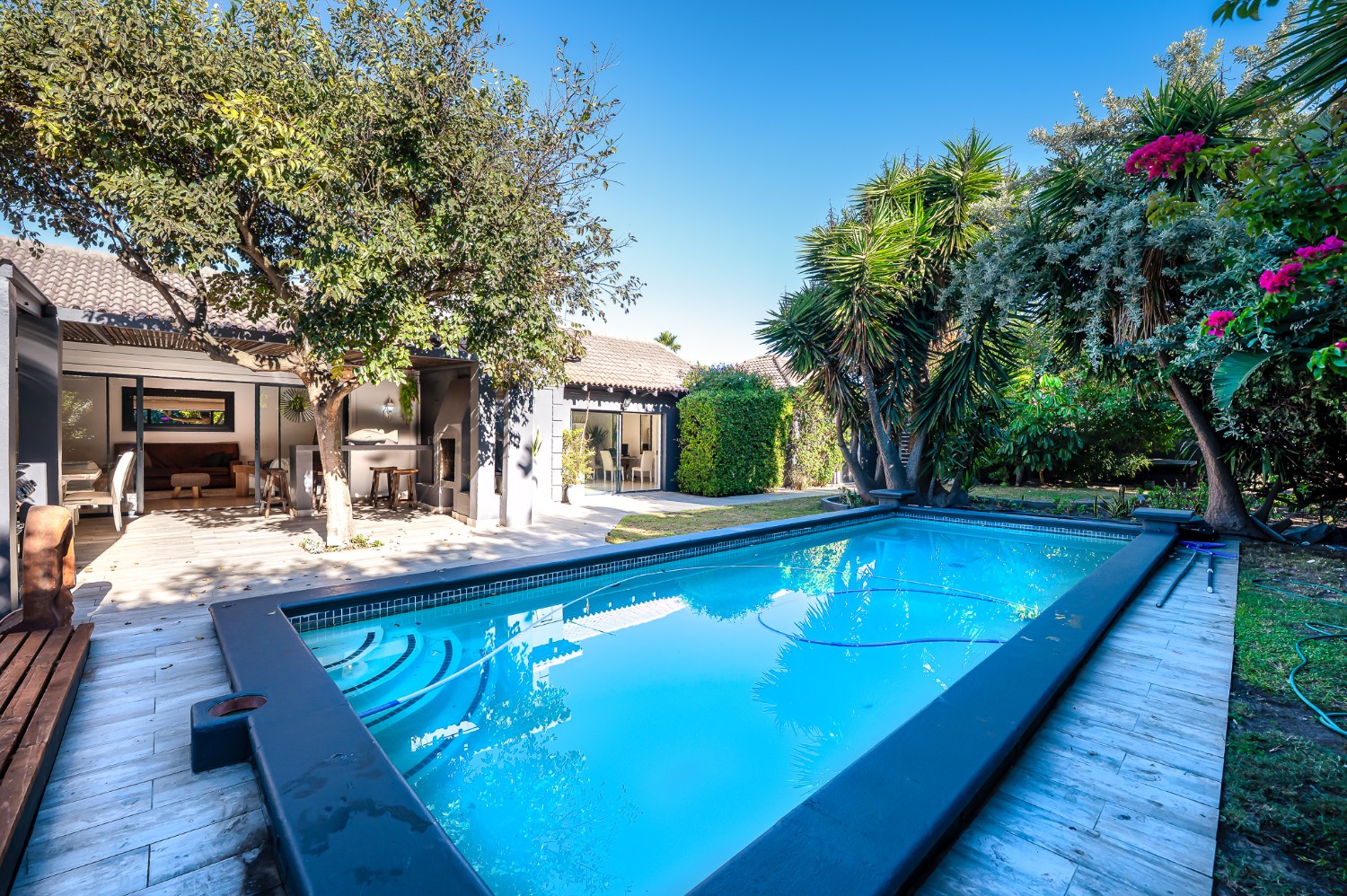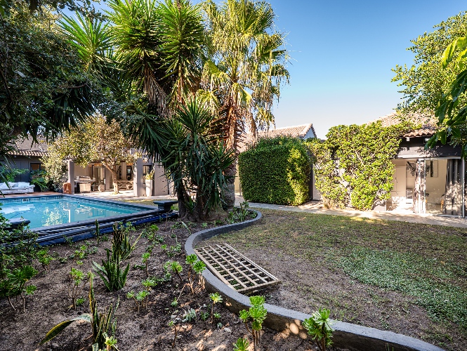 Step outside to a lush, established garden with a borehole, ensuring water efficiency, and enjoy summer days by the expansive swimming pool, an ideal space for family relaxation or entertaining guests.
