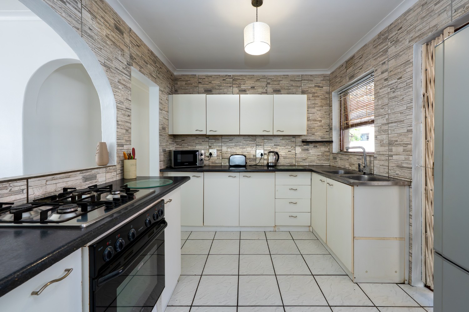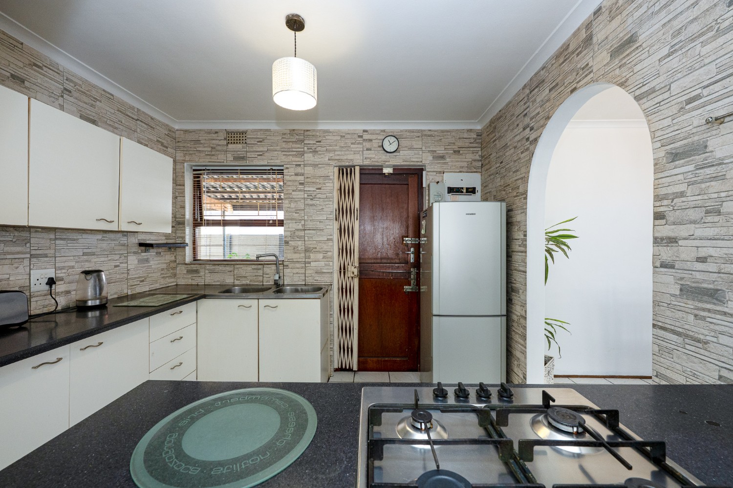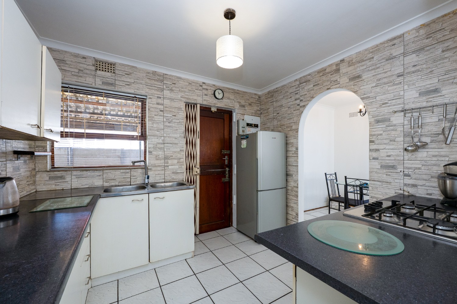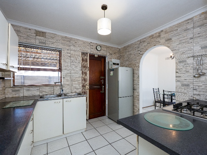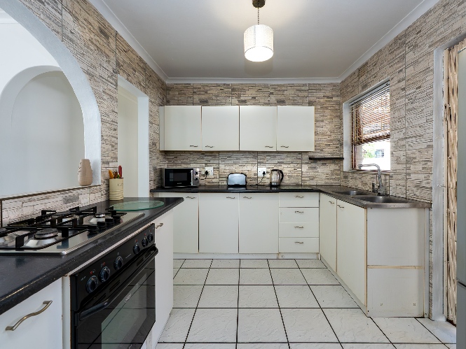 The inviting lounge and dining room create the ideal space for relaxing and entertaining guests, with plenty of natural light enhancing the warm and welcoming atmosphere. In addition, the lounge features a door opening up to the beautifully maintained garden. The charming kitchen features beautifully fitted cupboards, a gas stove top, an electric oven, and ample countertop space.
