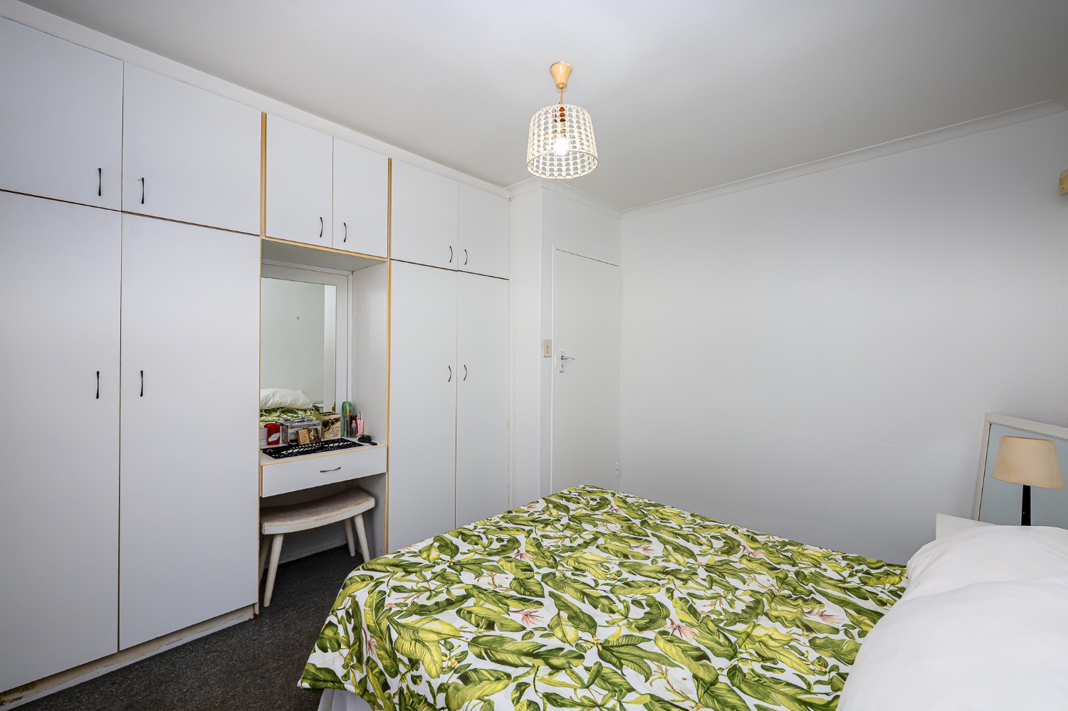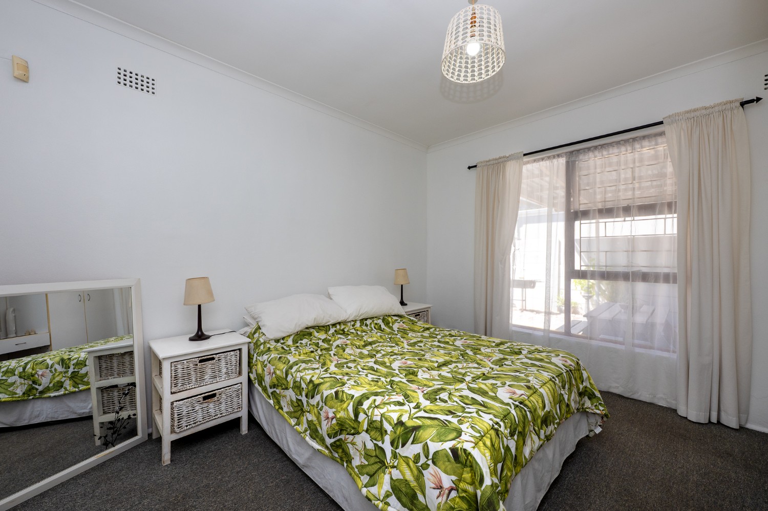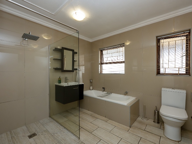 The property features three generously sized bedrooms, with one bedroom fitted with built-in cupboards and the second bedroom a door that opens up to the garden. The modern family bathroom is equipped with a walk-in shower, a bathtub, a basin, and a toilet.