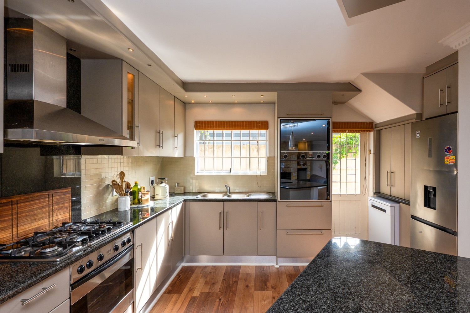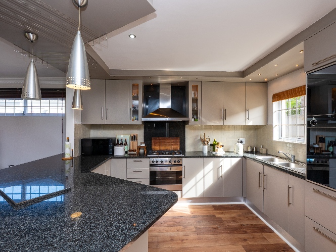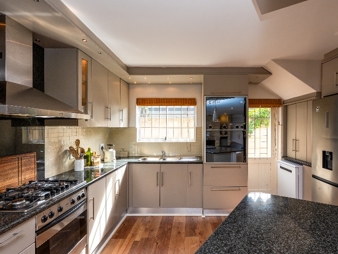A large open-plan kitchen with an impressive 3 ovens, gas hob, and loads of storage — ideal for those who love to cook and entertain