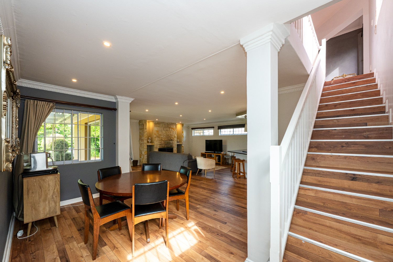 Expansive lounge and dining area with a welcoming fireplace