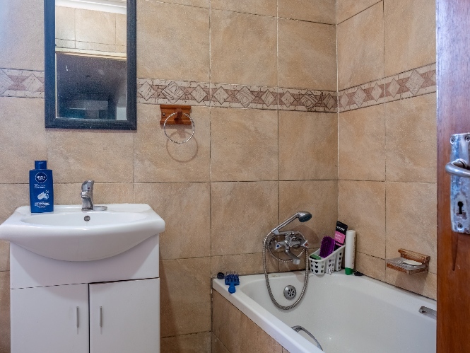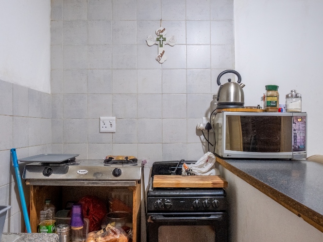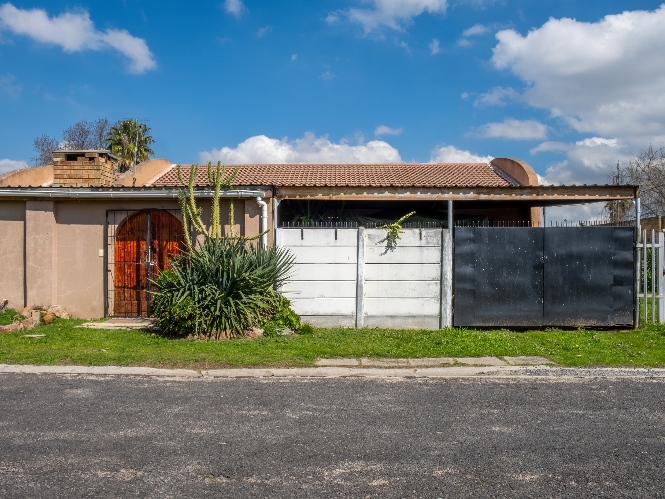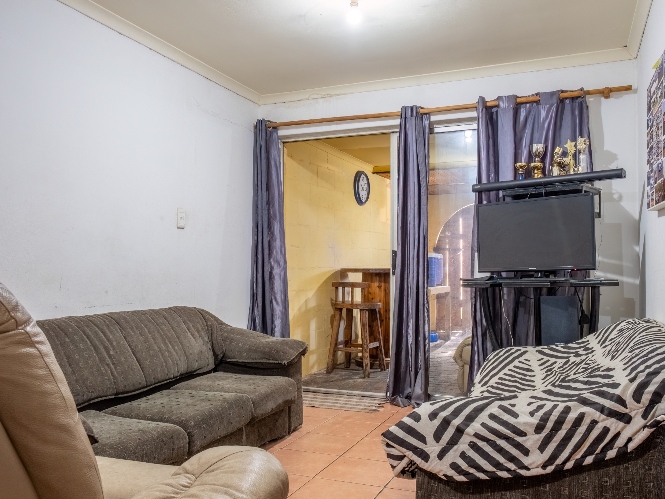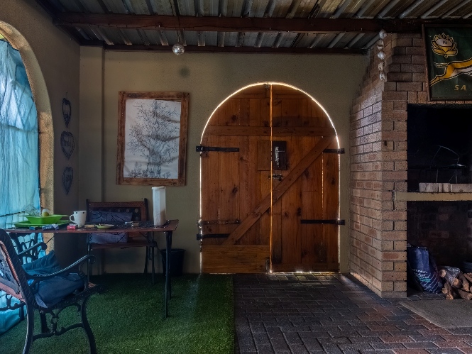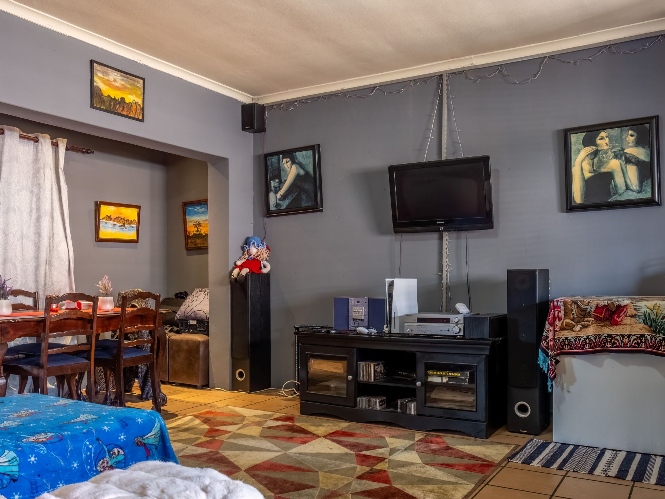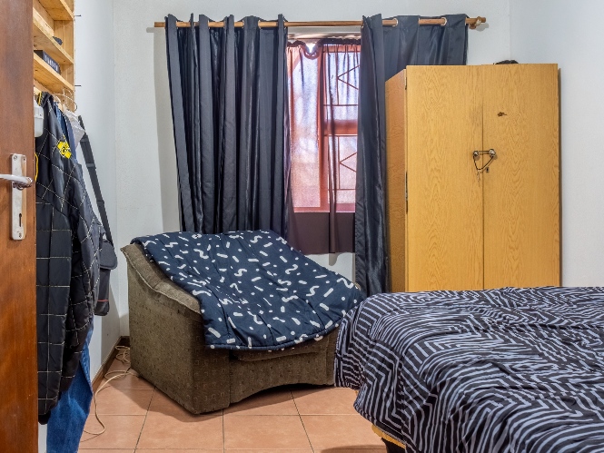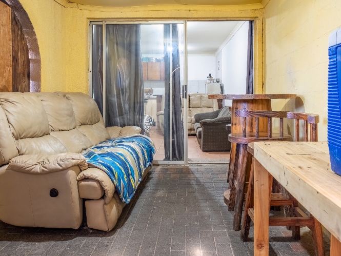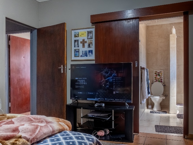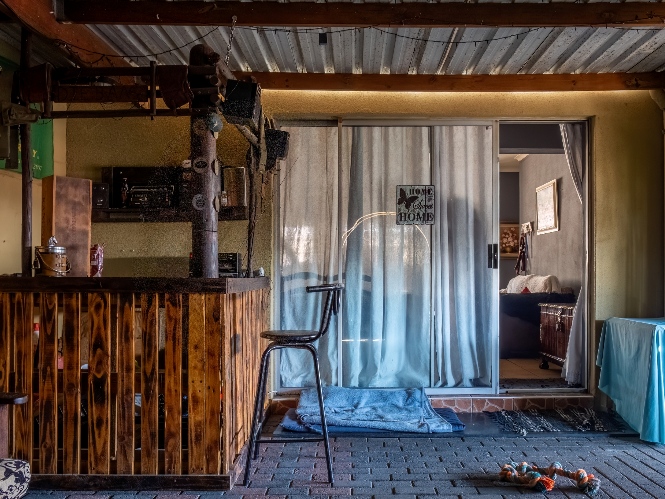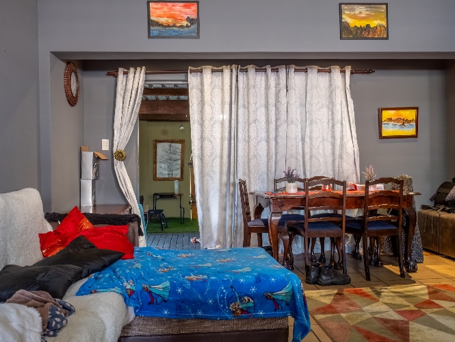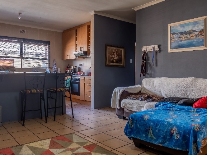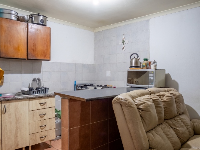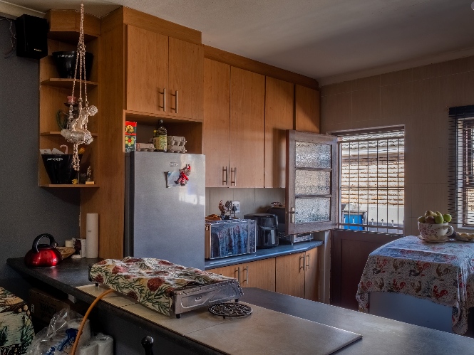 The first property features a spacious living area opening up to an indoor entertainment area, complete with a built-in braai, and offers access to the front of the property. The kitchen boasts light wood cupboards, a fitted stove and oven, and space for a fridge.