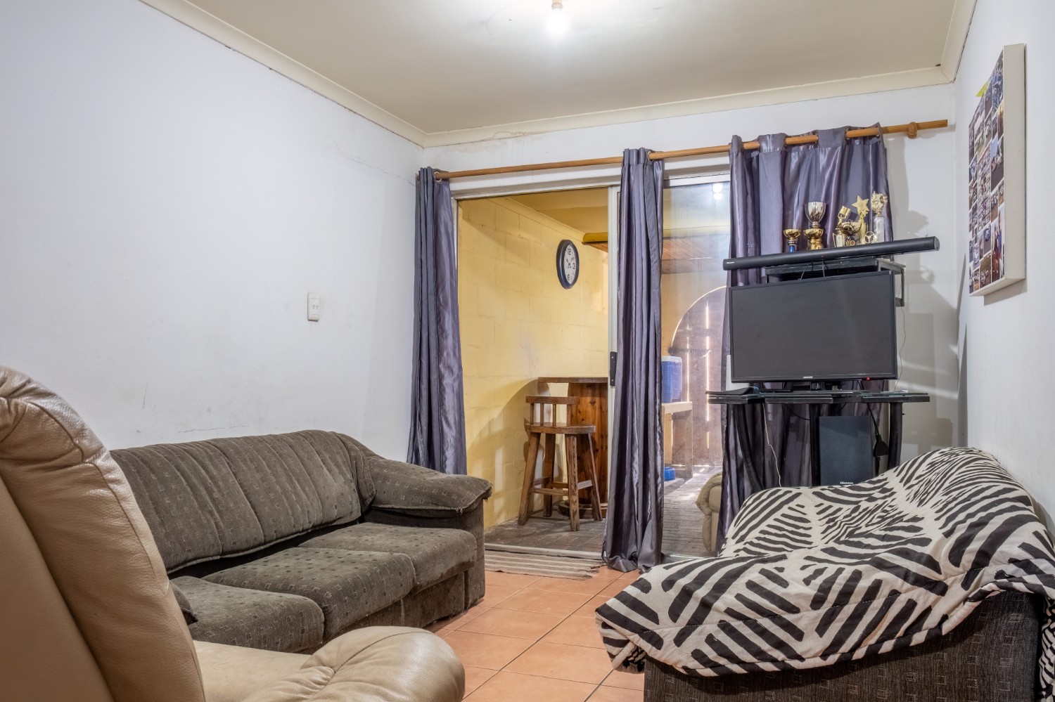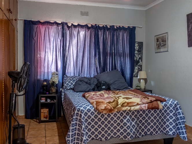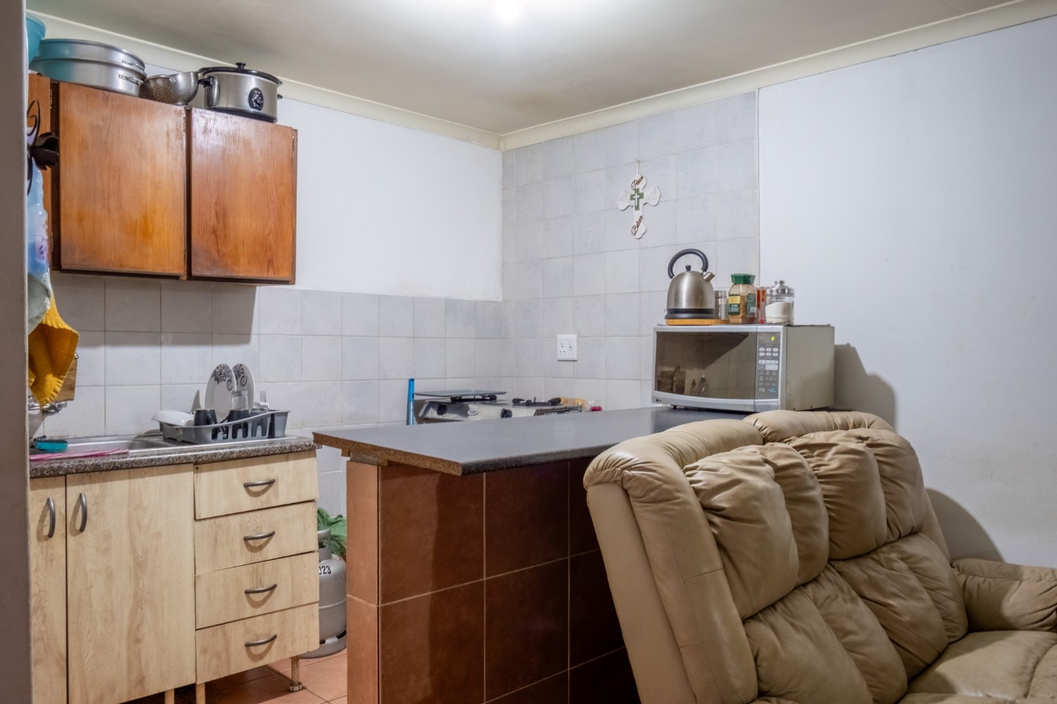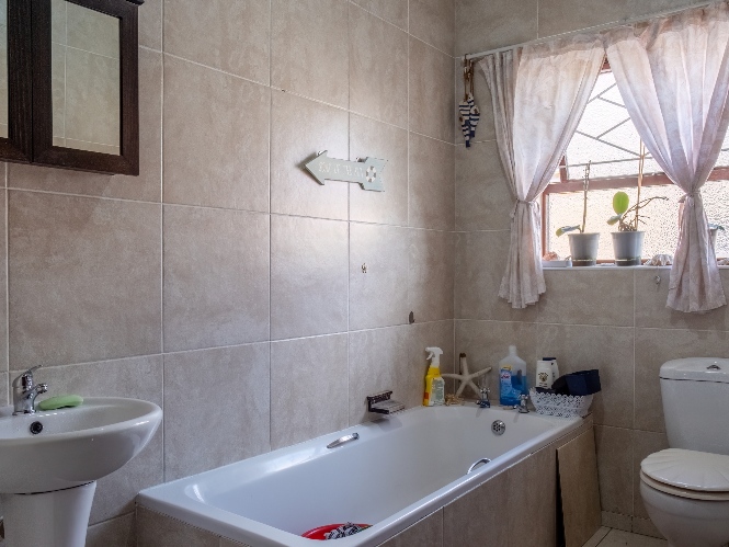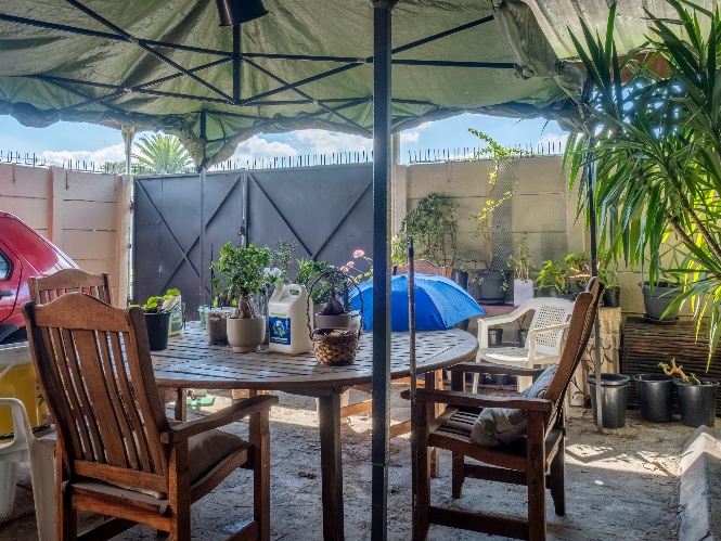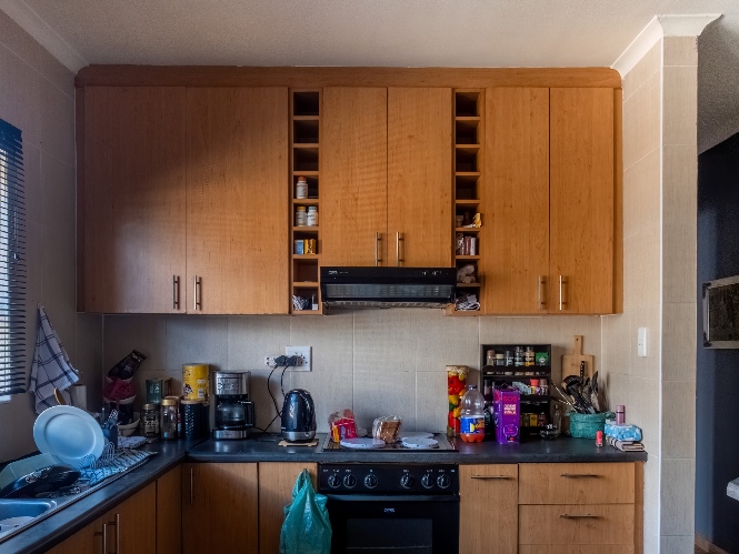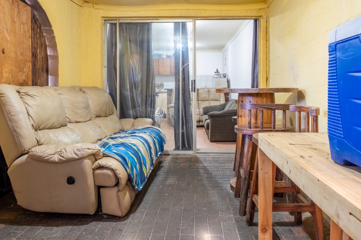 The first property features a spacious living area opening up to an indoor entertainment area, complete with a built-in braai, and offers access to the front of the property. The kitchen boasts light wood cupboards, a fitted stove and oven, and space for a fridge.