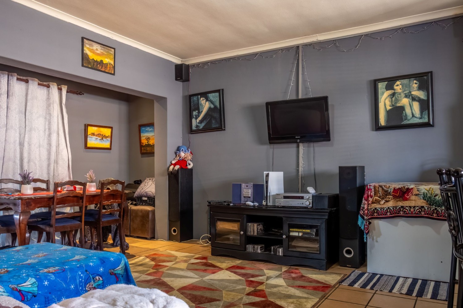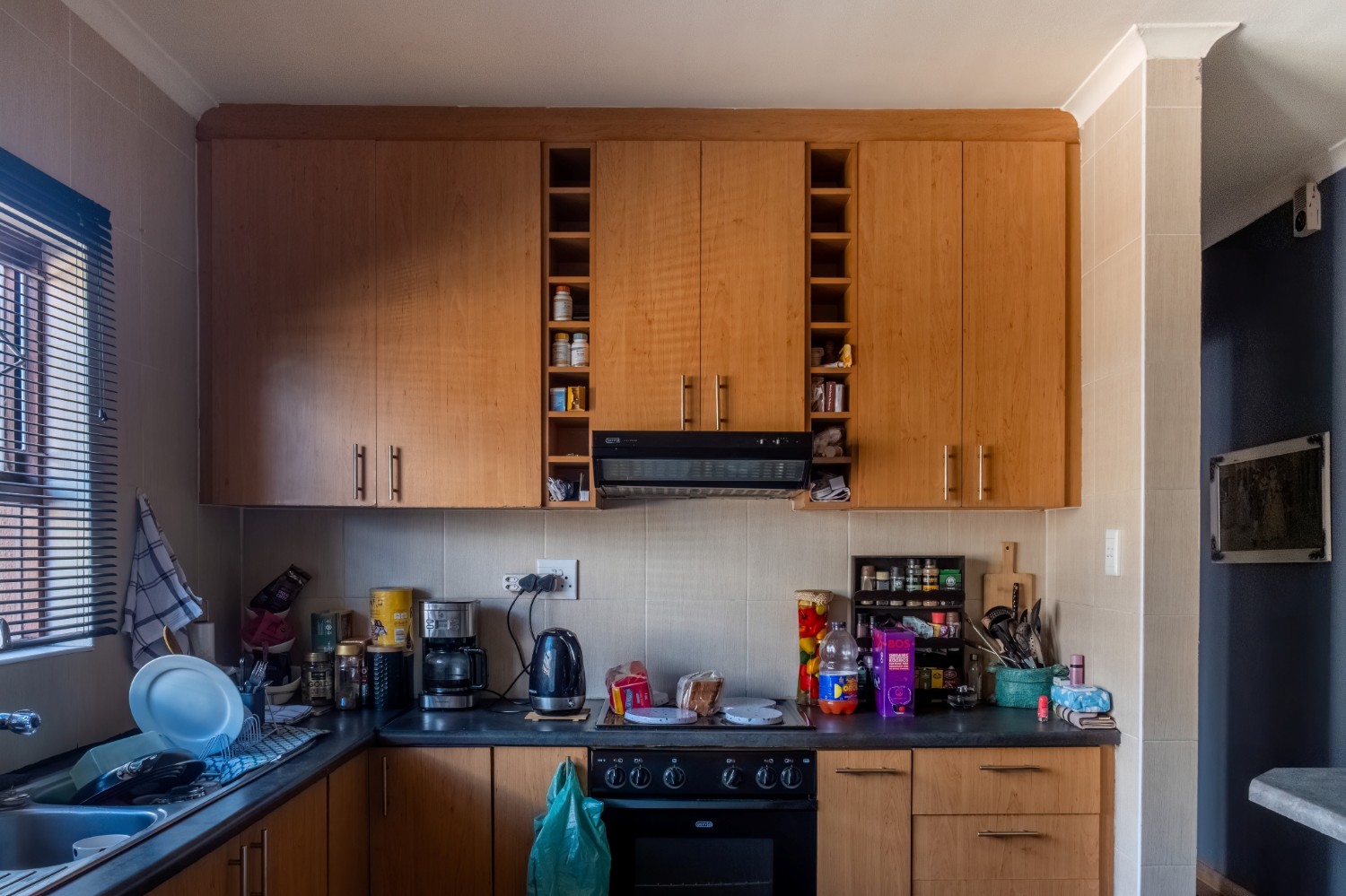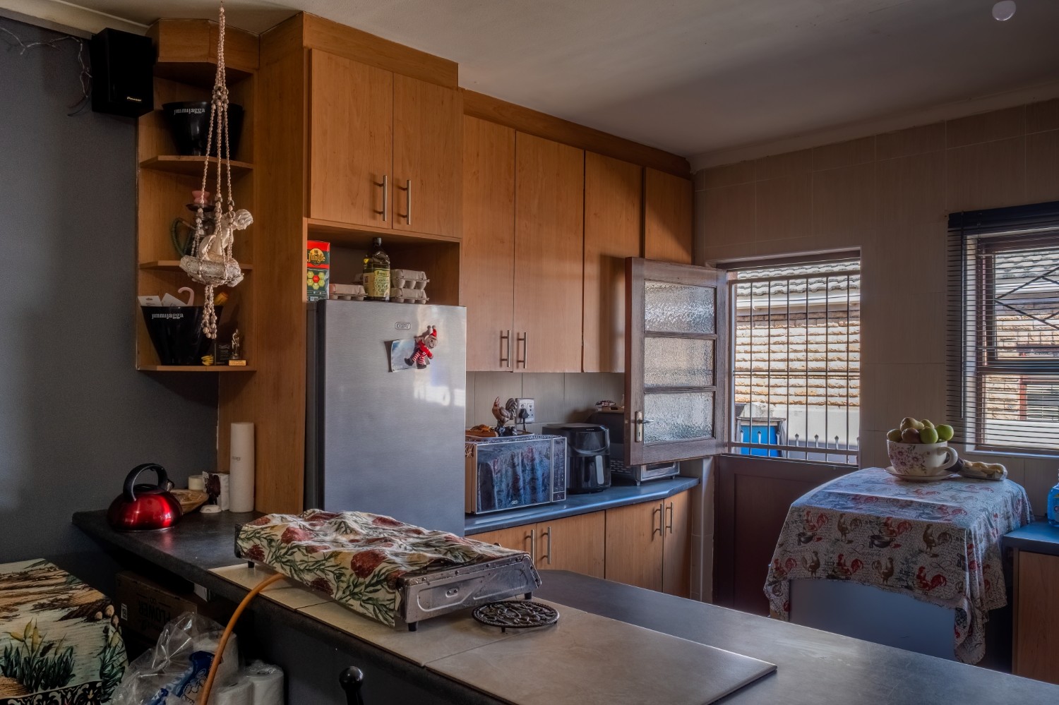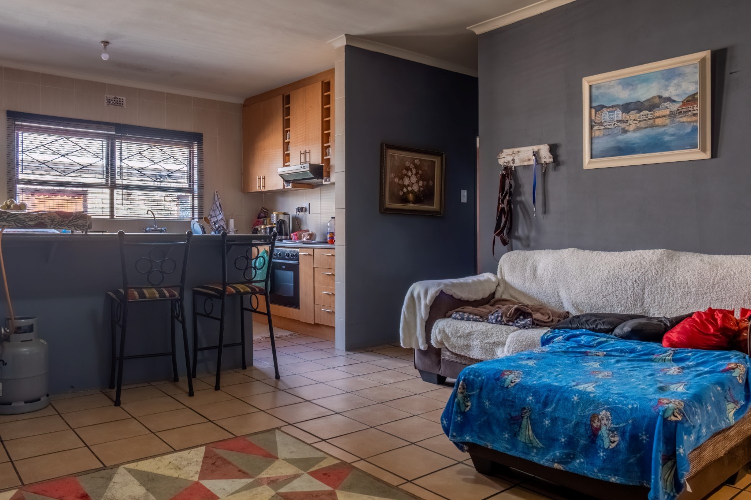 The first property features a spacious living area opening up to an indoor entertainment area, complete with a built-in braai, and offers access to the front of the property. The kitchen boasts light wood cupboards, a fitted stove and oven, and space for a fridge.