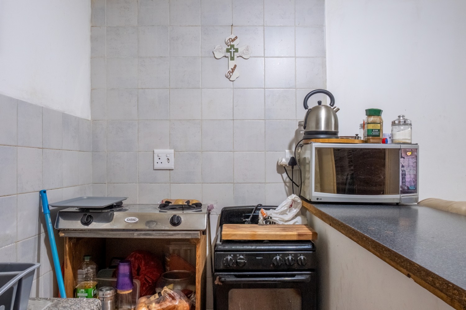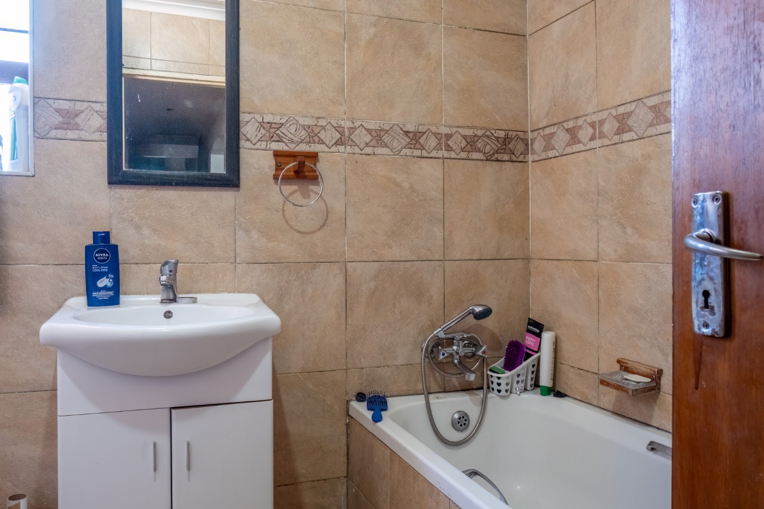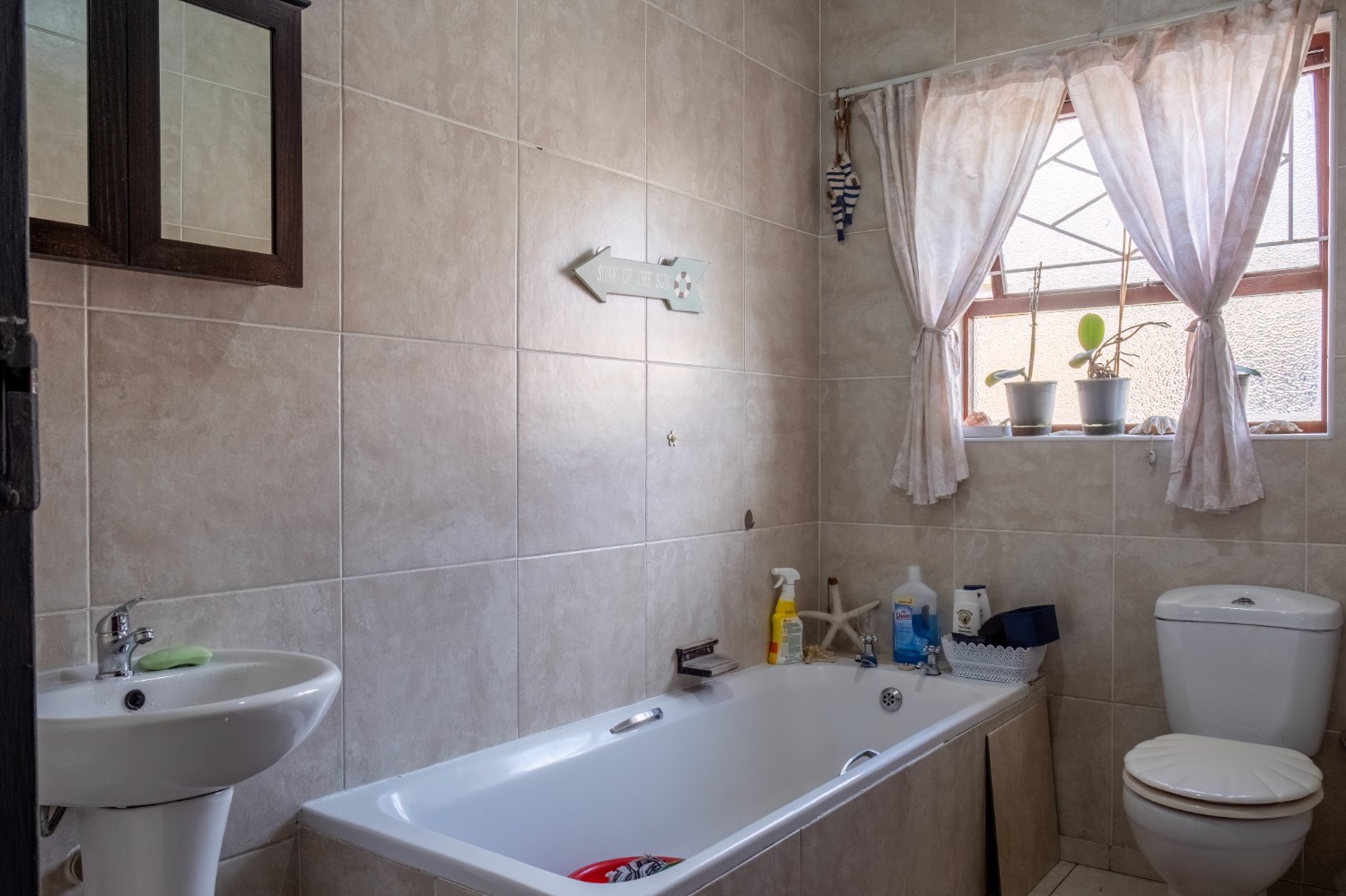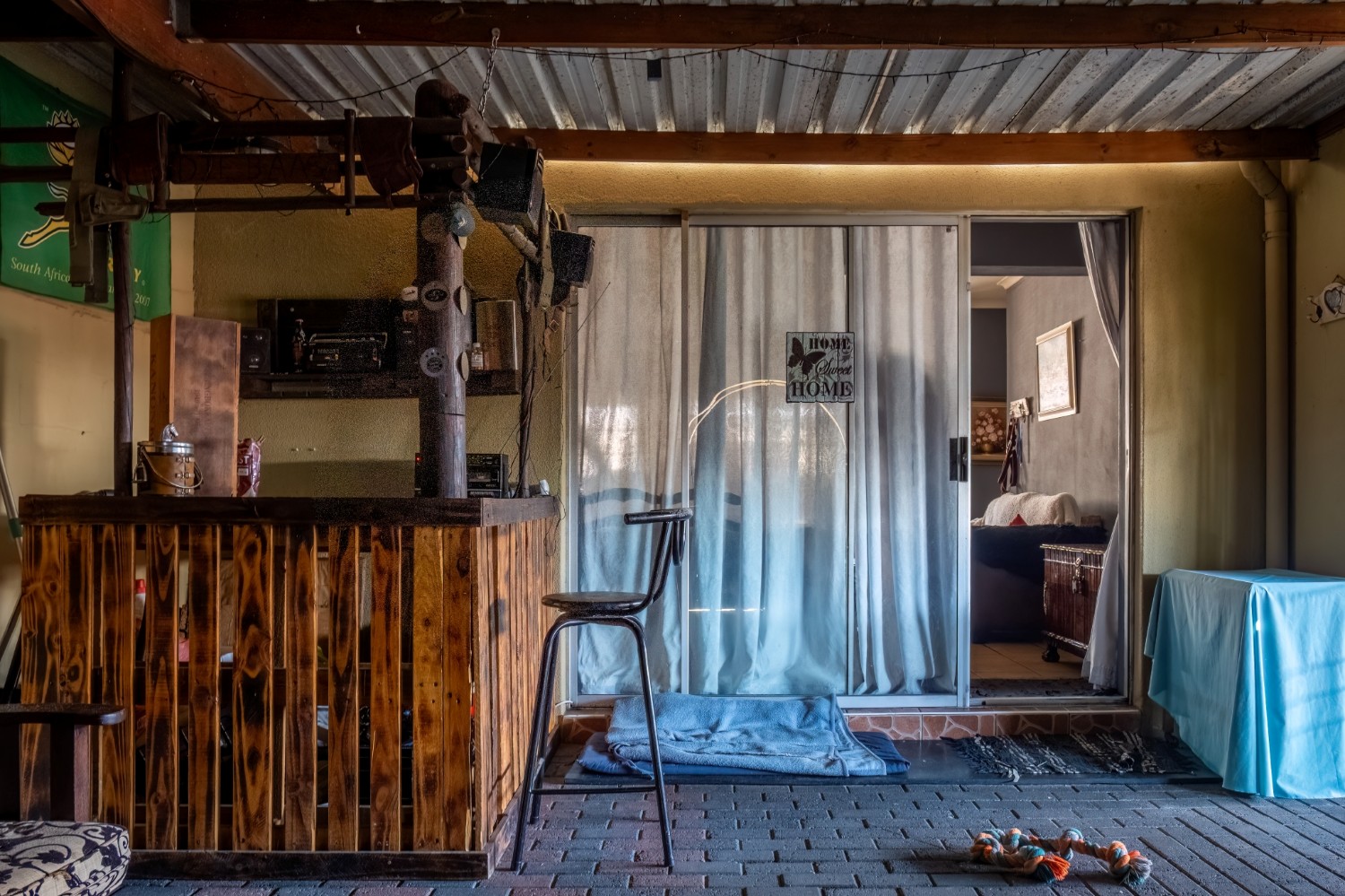 The first property features a spacious living area opening up to an indoor entertainment area, complete with a built-in braai, and offers access to the front of the property. The kitchen boasts light wood cupboards, a fitted stove and oven, and space for a fridge.