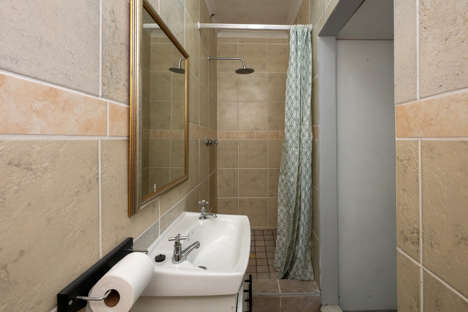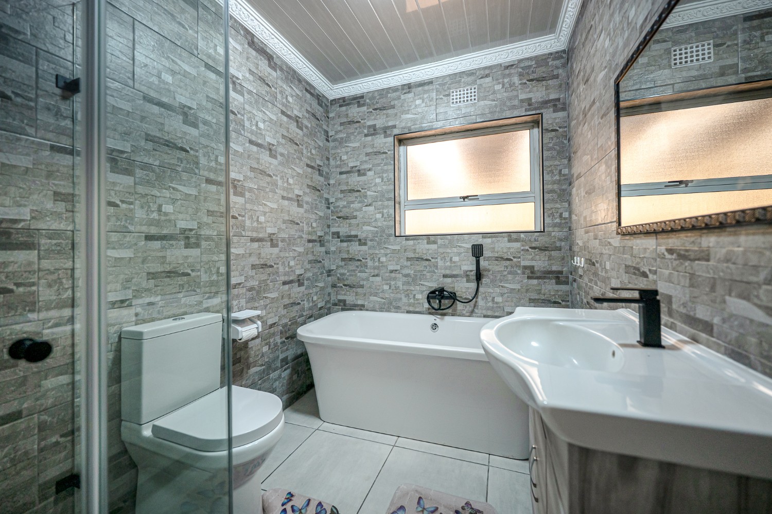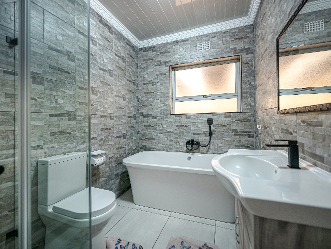 The property boasts 3 spacious bedrooms, all complete with built-in cupboards. The master bedroom is equipped with an en-suite bathroom fitted with a shower, basin, and toilet. The main bathroom is tiled from floor to ceiling, complete with a shower, modern bathtub, basin, and toilet.