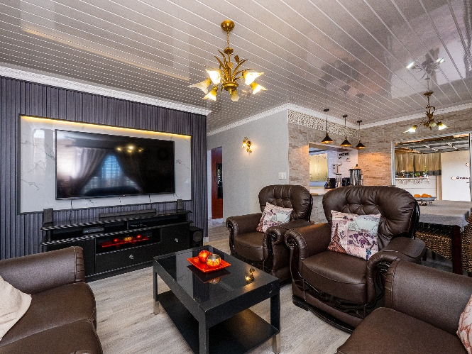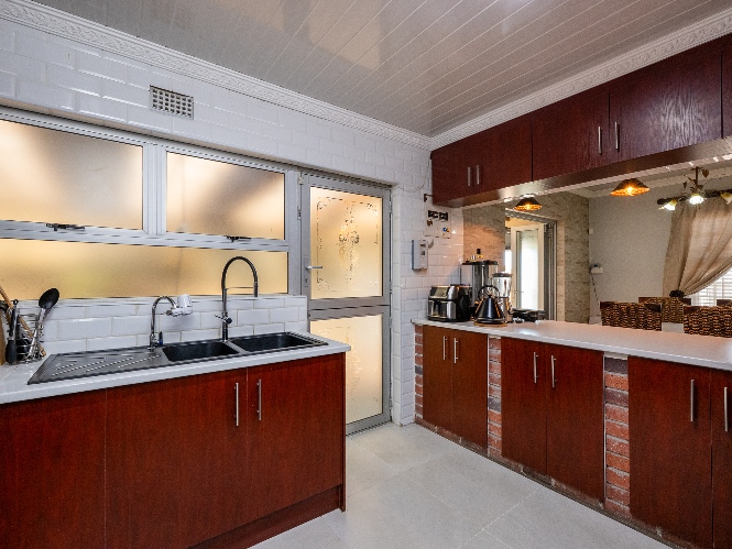The heart of the home is the spacious open-plan lounge and dining room, ideal for entertaining guests or enjoying relaxed family meals. The lounge features a cosy indoor fireplace ideal for those cold winter nights. The modern kitchen is beautifully designed with dark wood cupboards, an eye-level oven, a stove top, and space for a fridge.