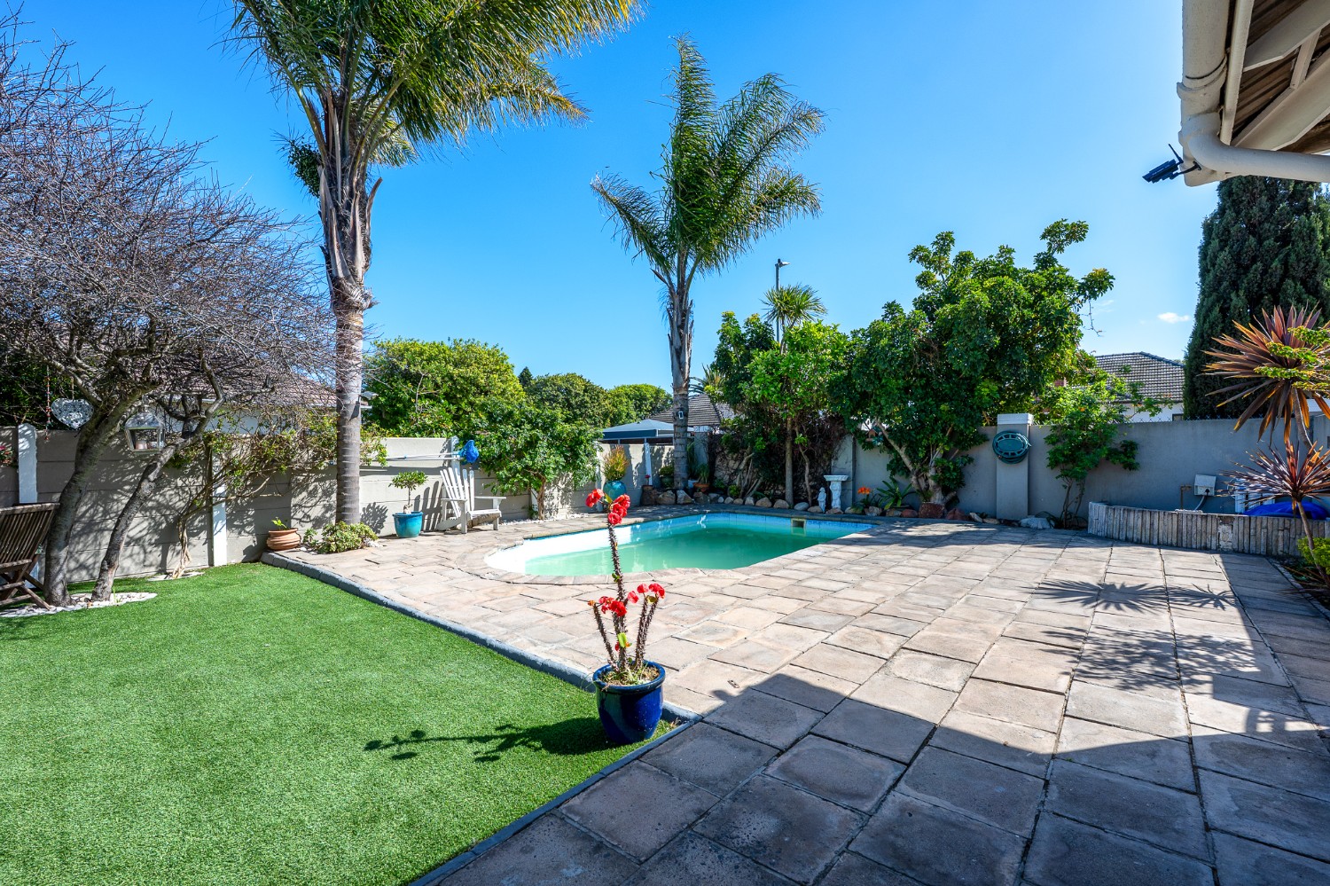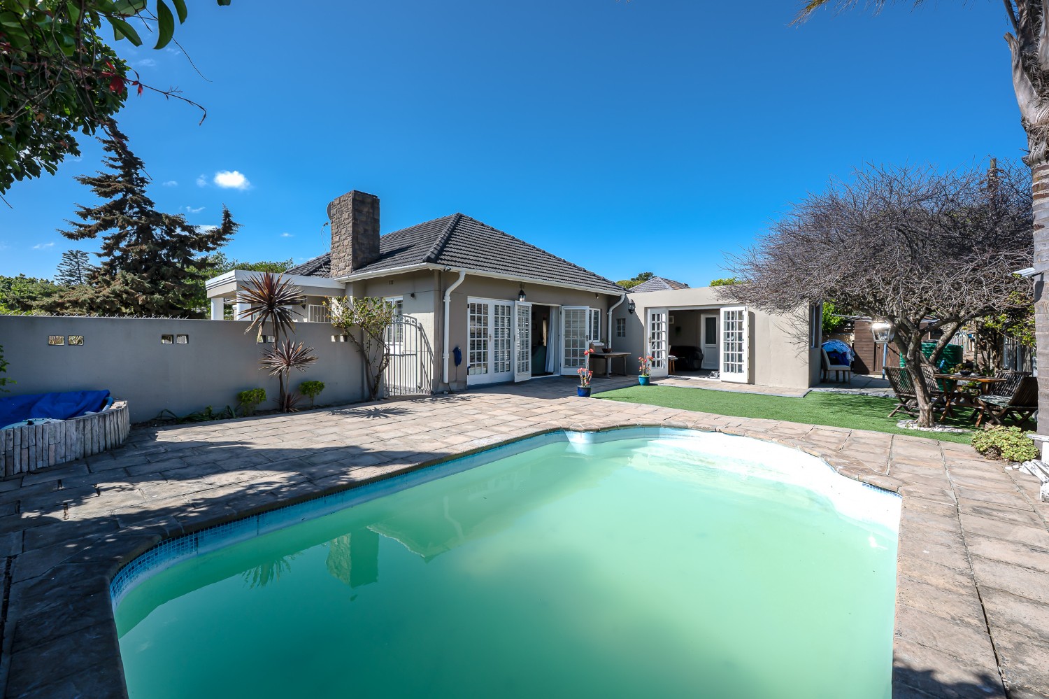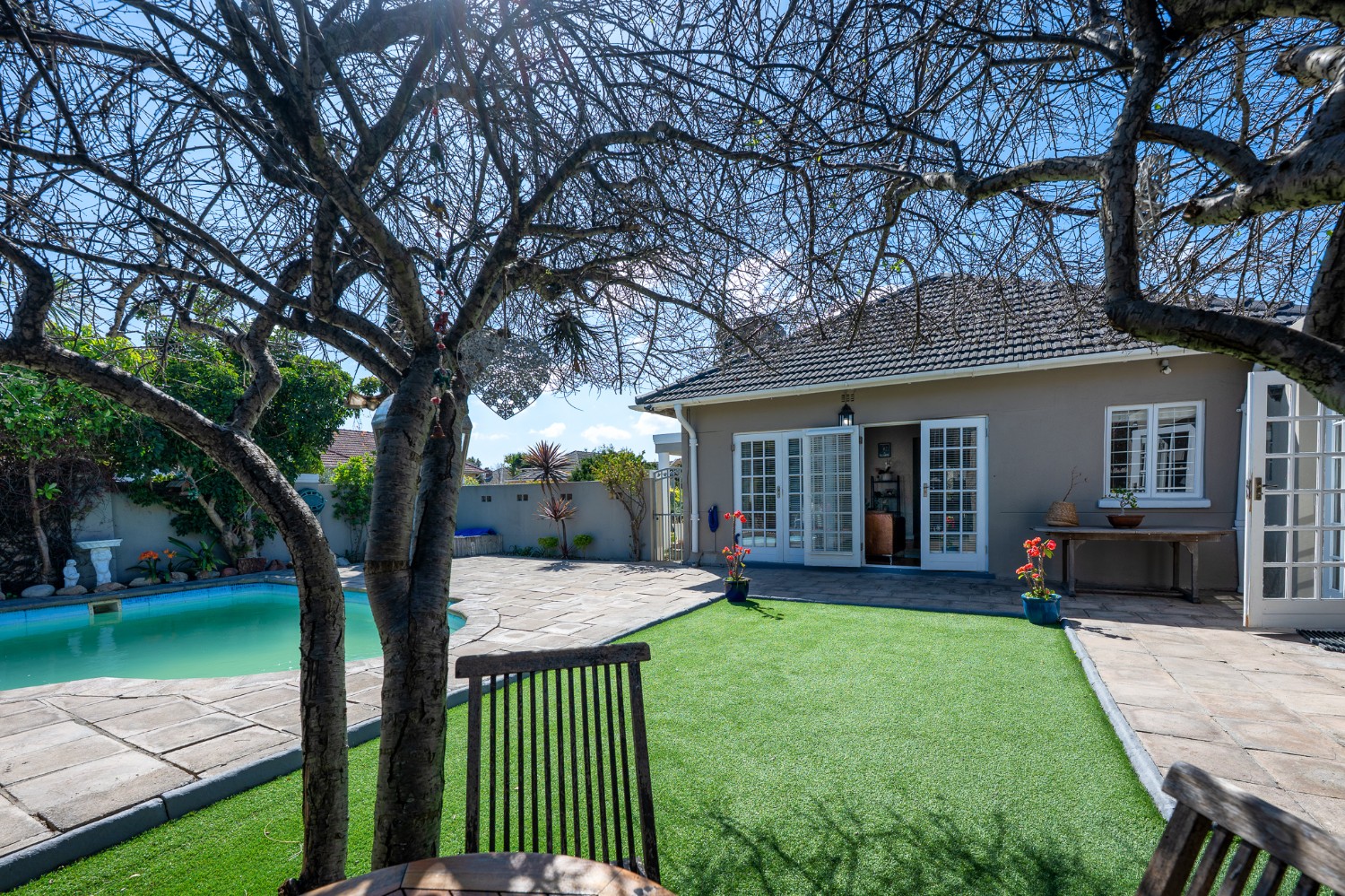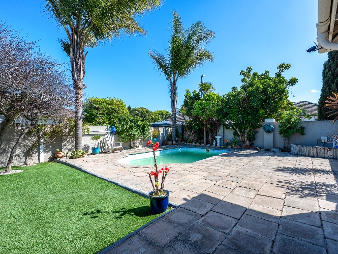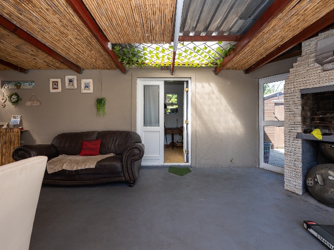 The property boasts three well-sized bedrooms, all complete with built-in cupboards ideal for all your storage needs. The fully tiled family bathroom features a bathtub, a basin, and a toilet. Outdoors, you will find a sparkling swimming pool and a low-maintenance garden. The dedicated entertainment area is complete with a built-in braai perfect for hosting gatherings all year round.