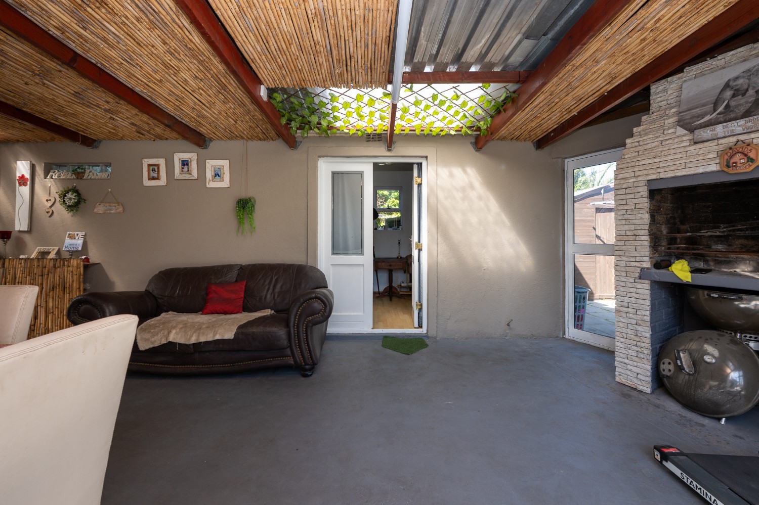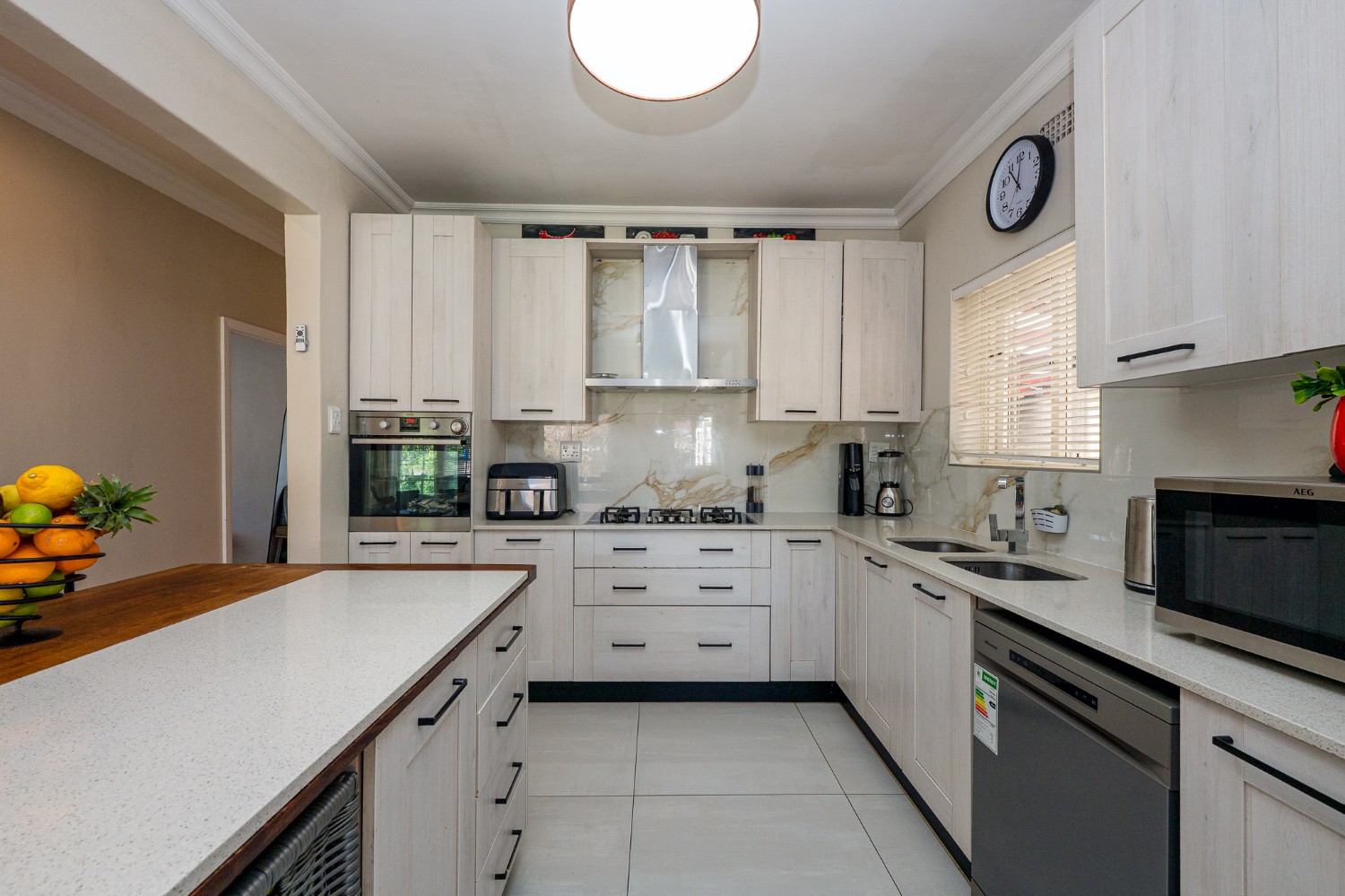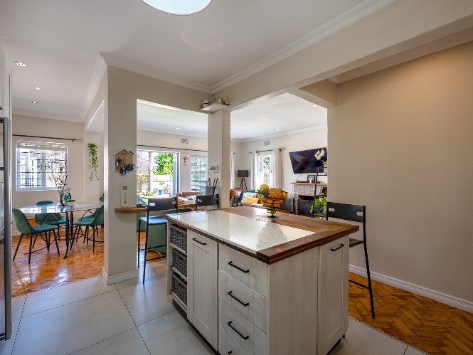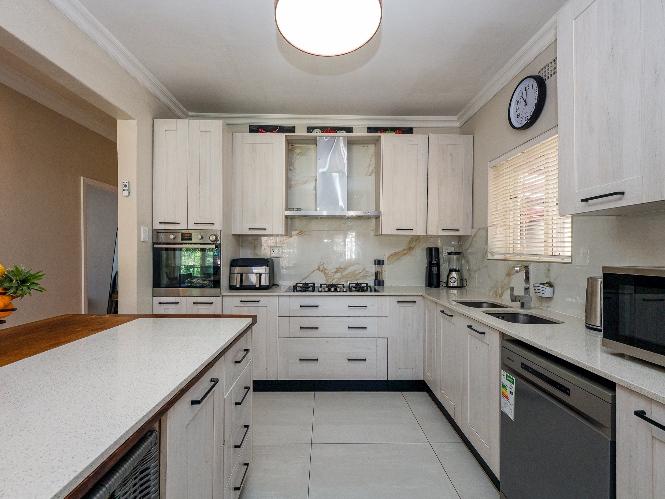 Step inside to a spacious lounge featuring a cosy fireplace and a door opening up to the gorgeous swimming pool, creating the perfect atmosphere for relaxing evenings. The well-appointed kitchen provides ample storage, a gas stove top, an eye-level oven, one plumbing point, and a centre island, ideal for any at-home chef.