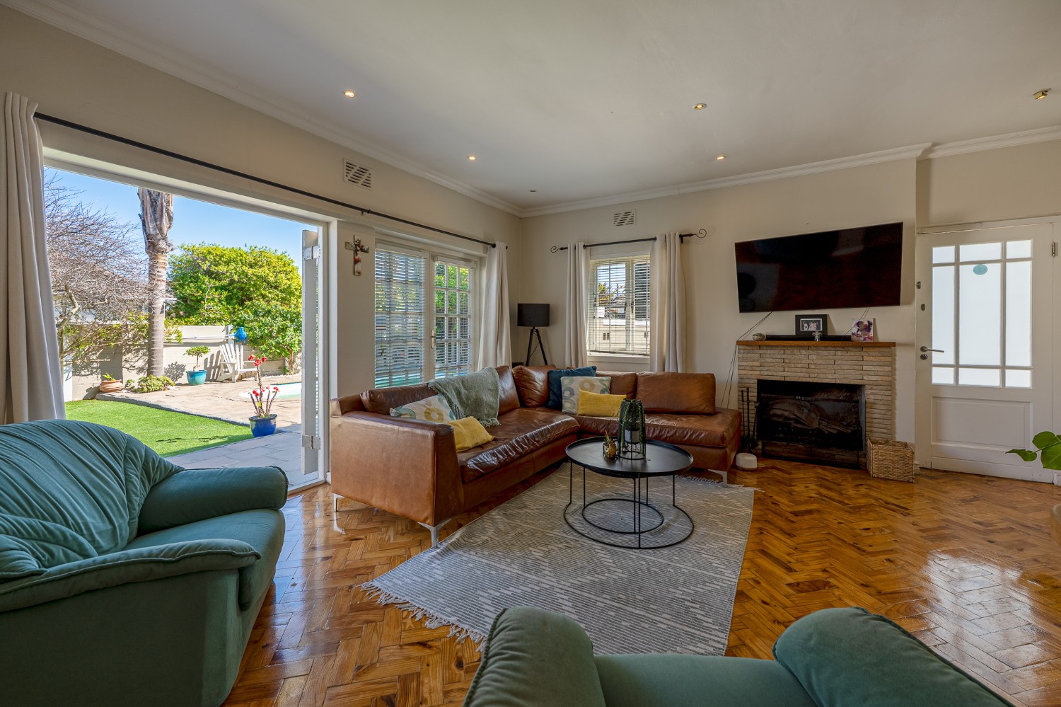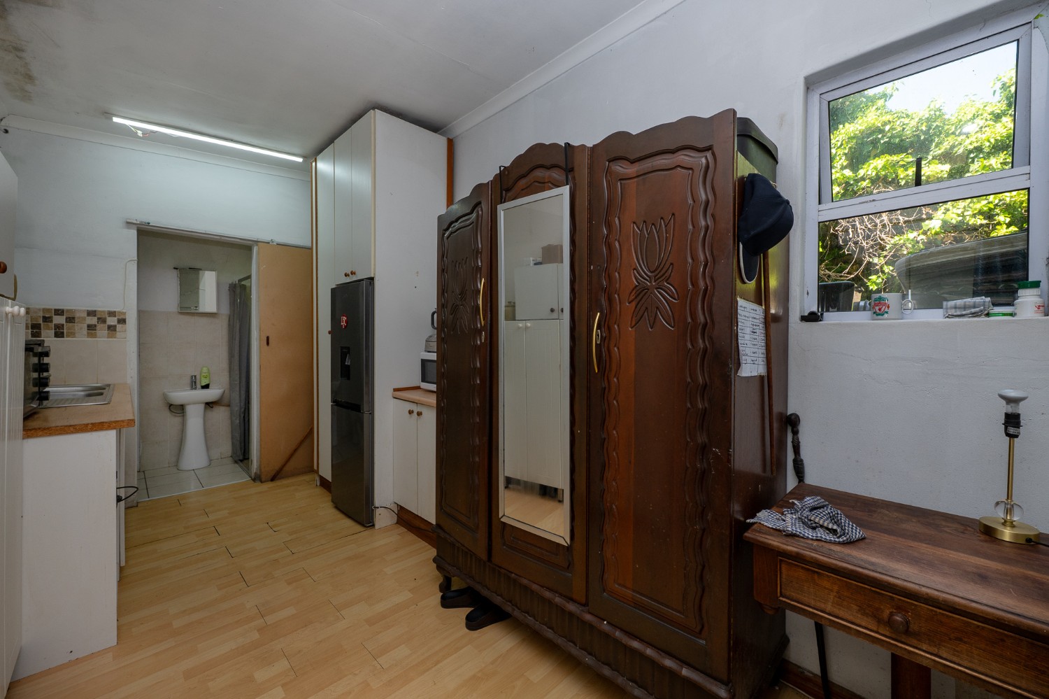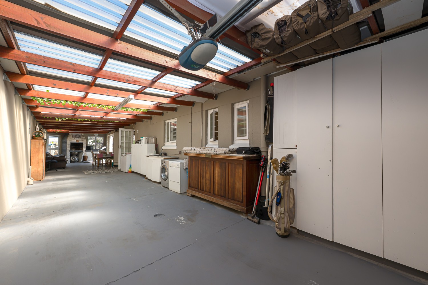 Step inside to a spacious lounge featuring a cosy fireplace and a door opening up to the gorgeous swimming pool, creating the perfect atmosphere for relaxing evenings. The well-appointed kitchen provides ample storage, a gas stove top, an eye-level oven, one plumbing point, and a centre island, ideal for any at-home chef.