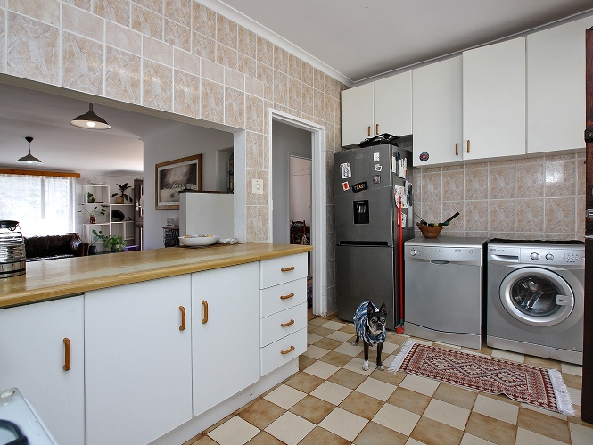 Inside, the light-filled living area connects to the kitchen via a breakfast counter — handy for a couple of bar stools and a convenient catch-up space. The kitchen is plumbed for a washing machine, has a double sink and a good number of built-in cupboard spaces.