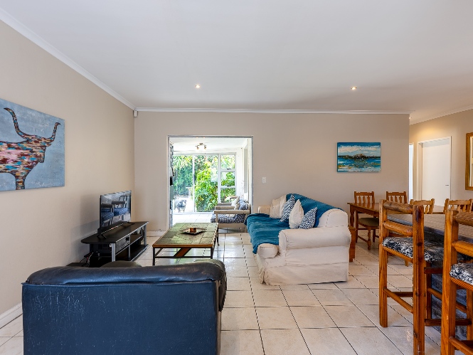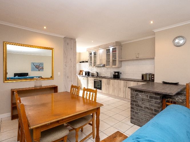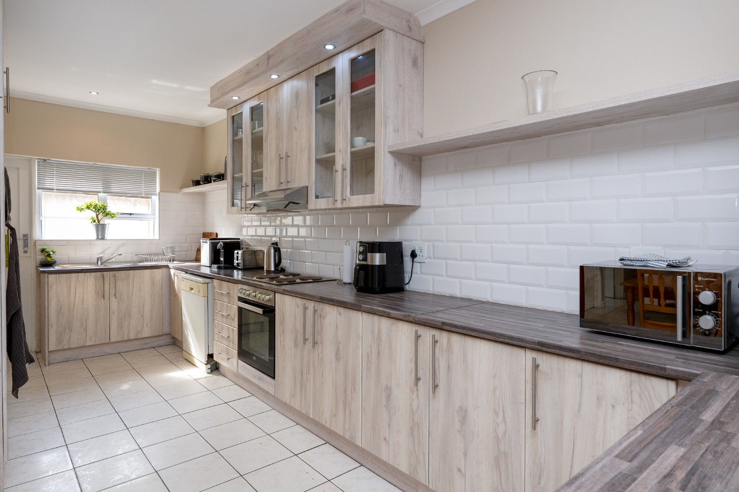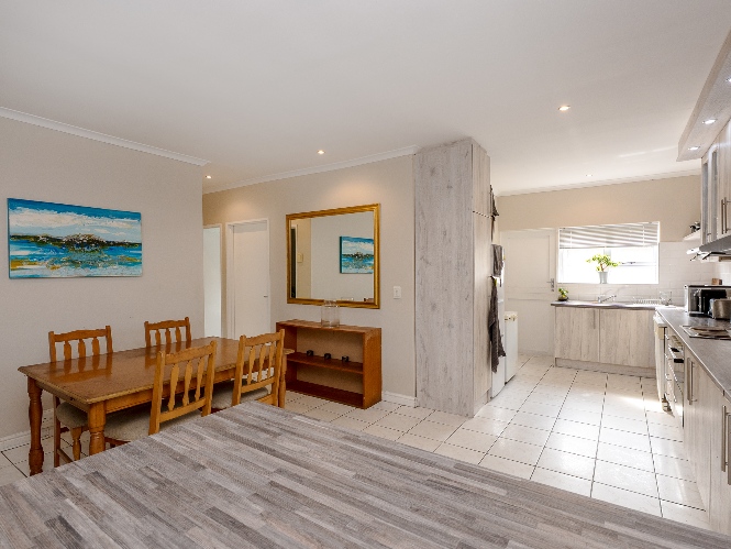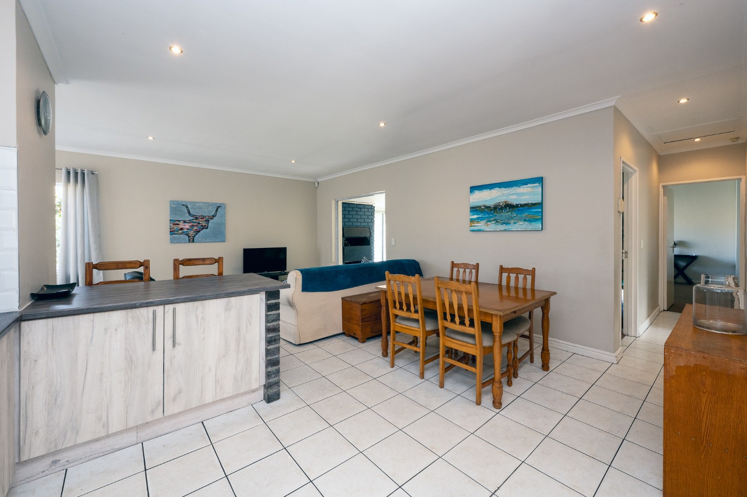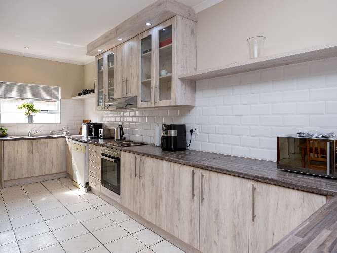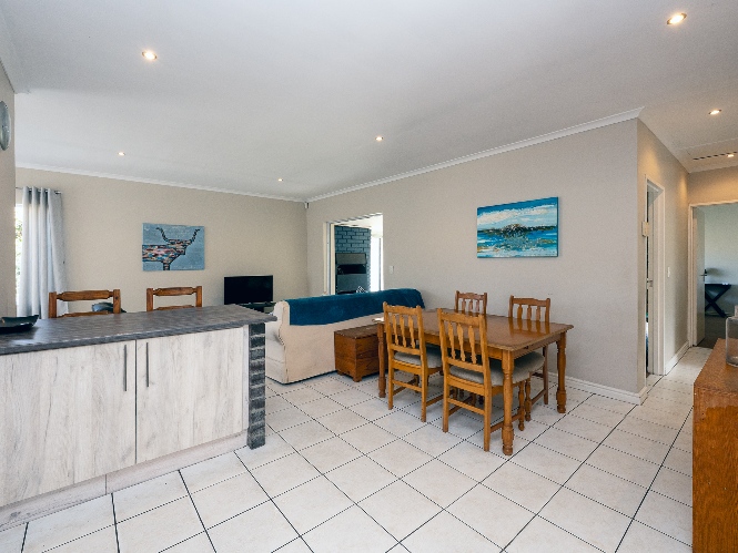 The living areas include a comfortable lounge and dining room, as well as a large kitchen with ample cupboard space, a built-in stove, and a plumbing point. An enclosed braai room provides the perfect setting for year-round entertaining.