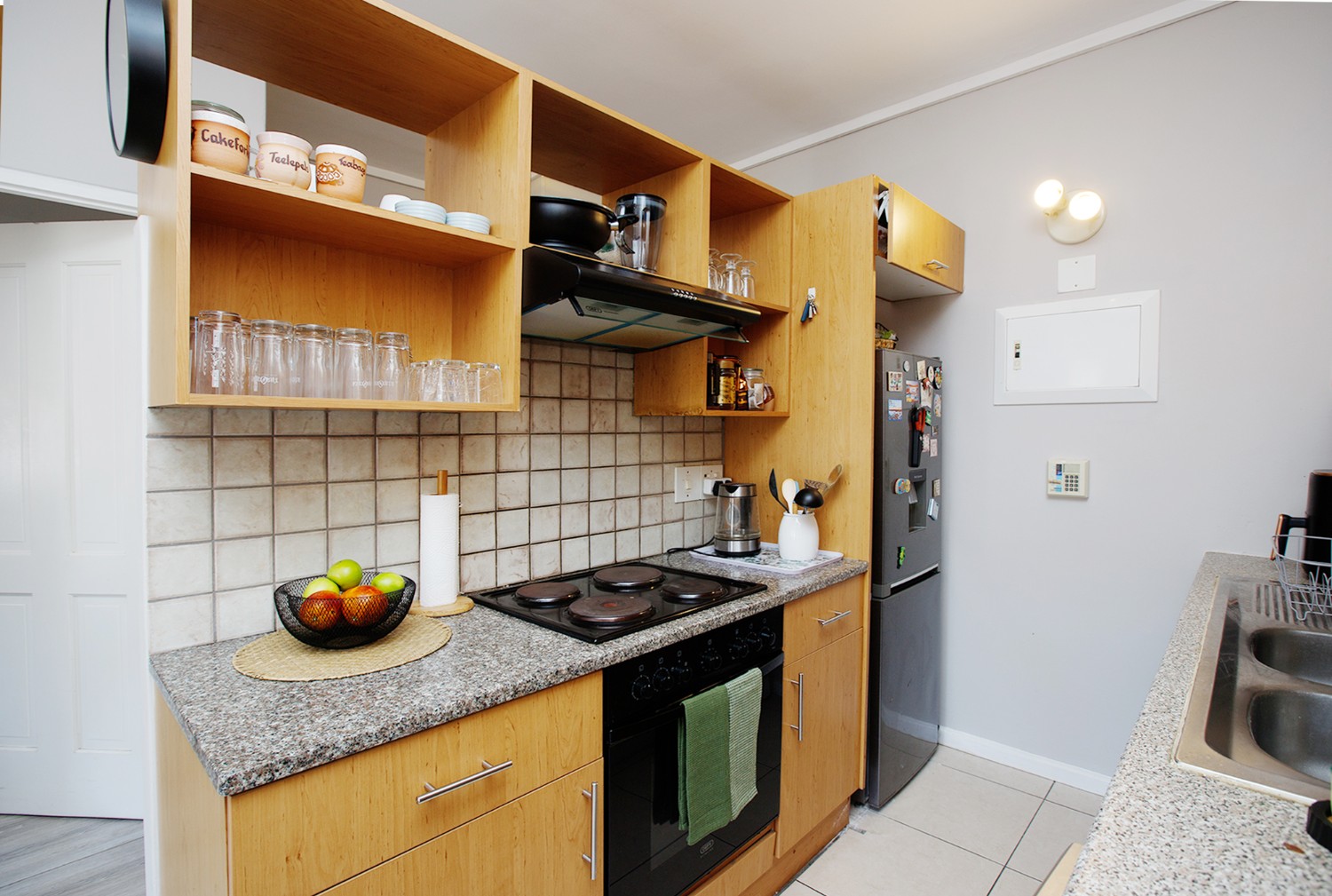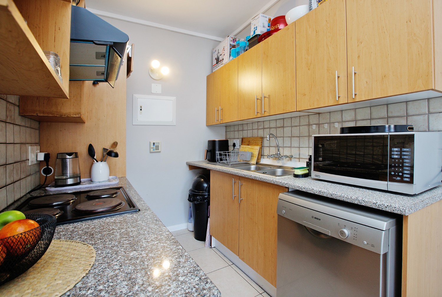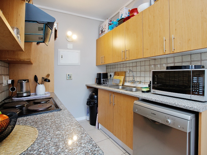 The adjacent kitchen is equipped with granite tops and plumbing for the washing machine and a dishwasher.
