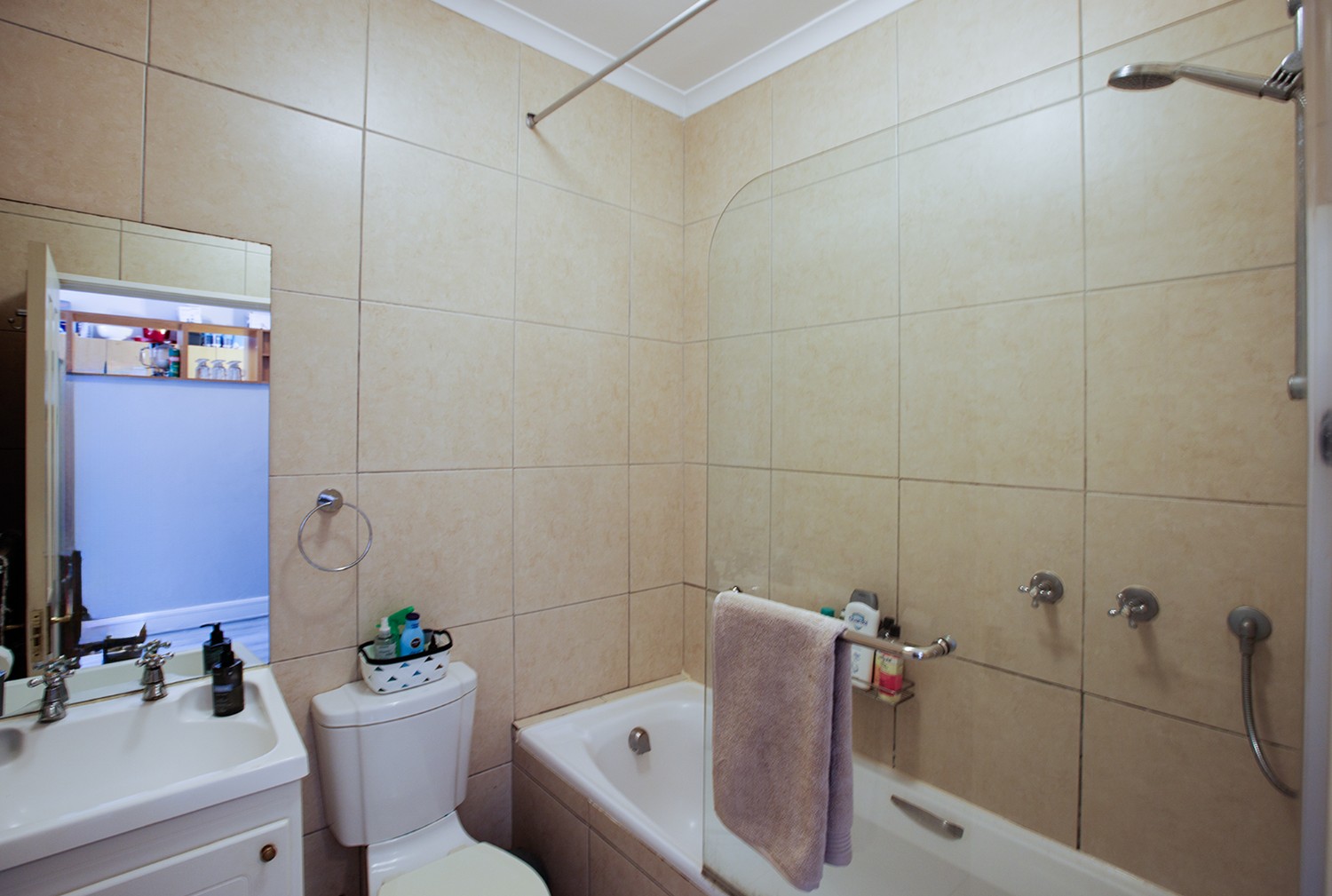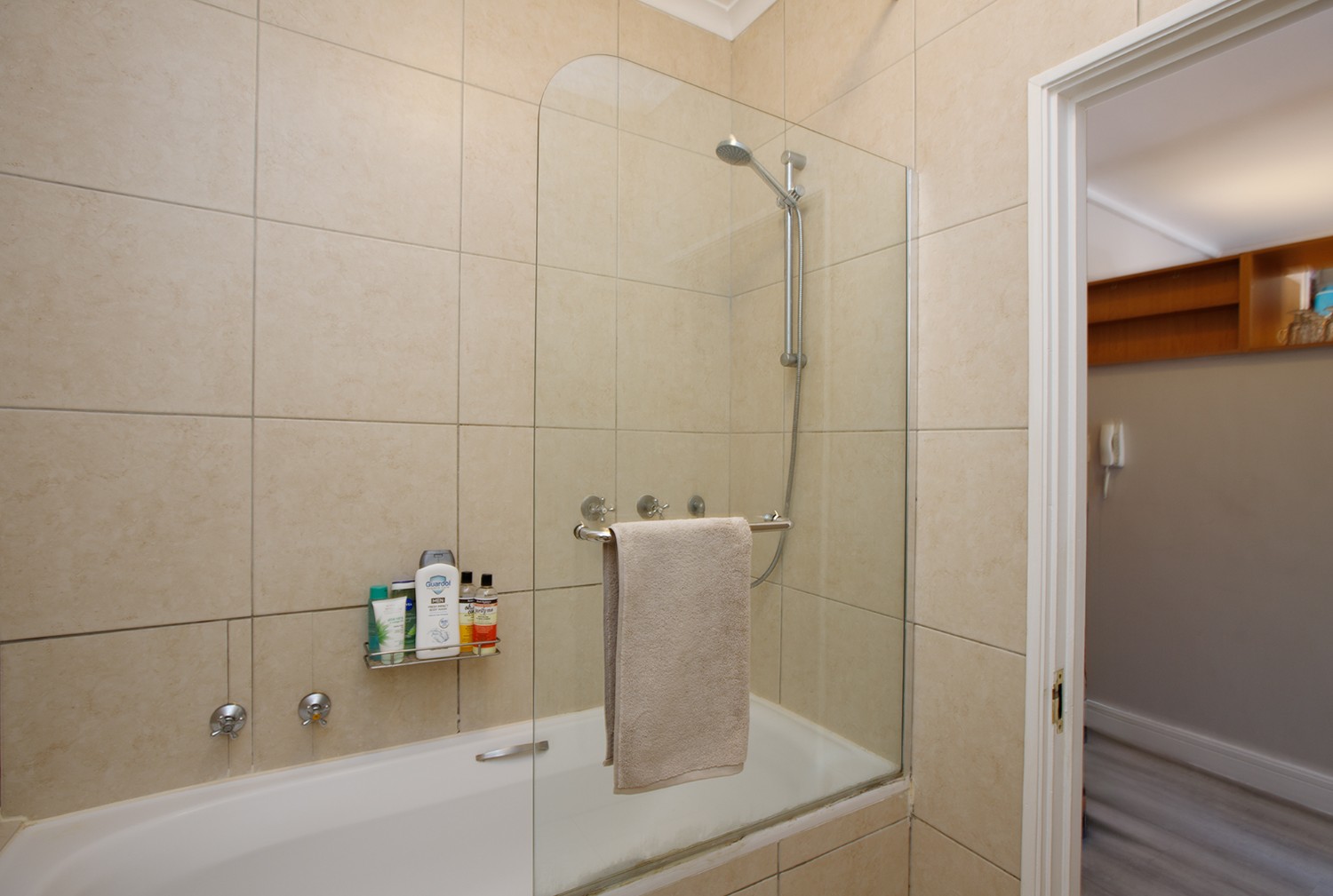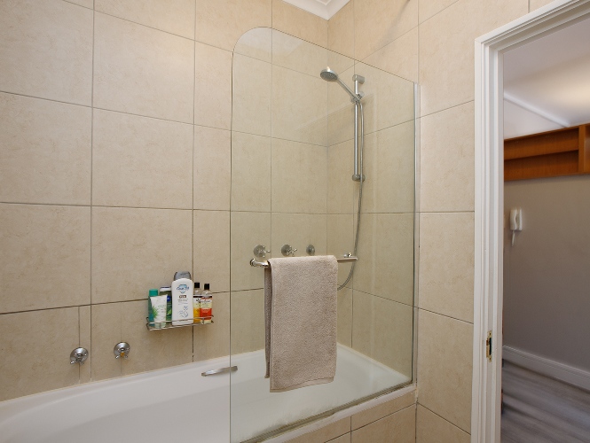 The tastefully designed bathroom combines style and practicality with a shower over the bath.