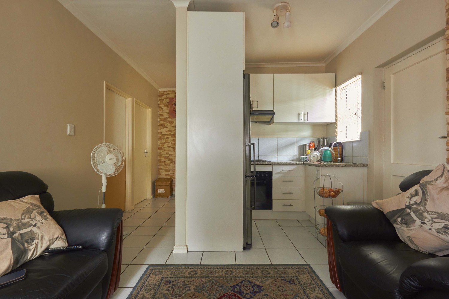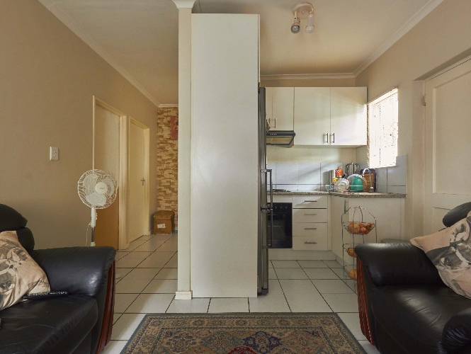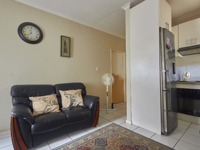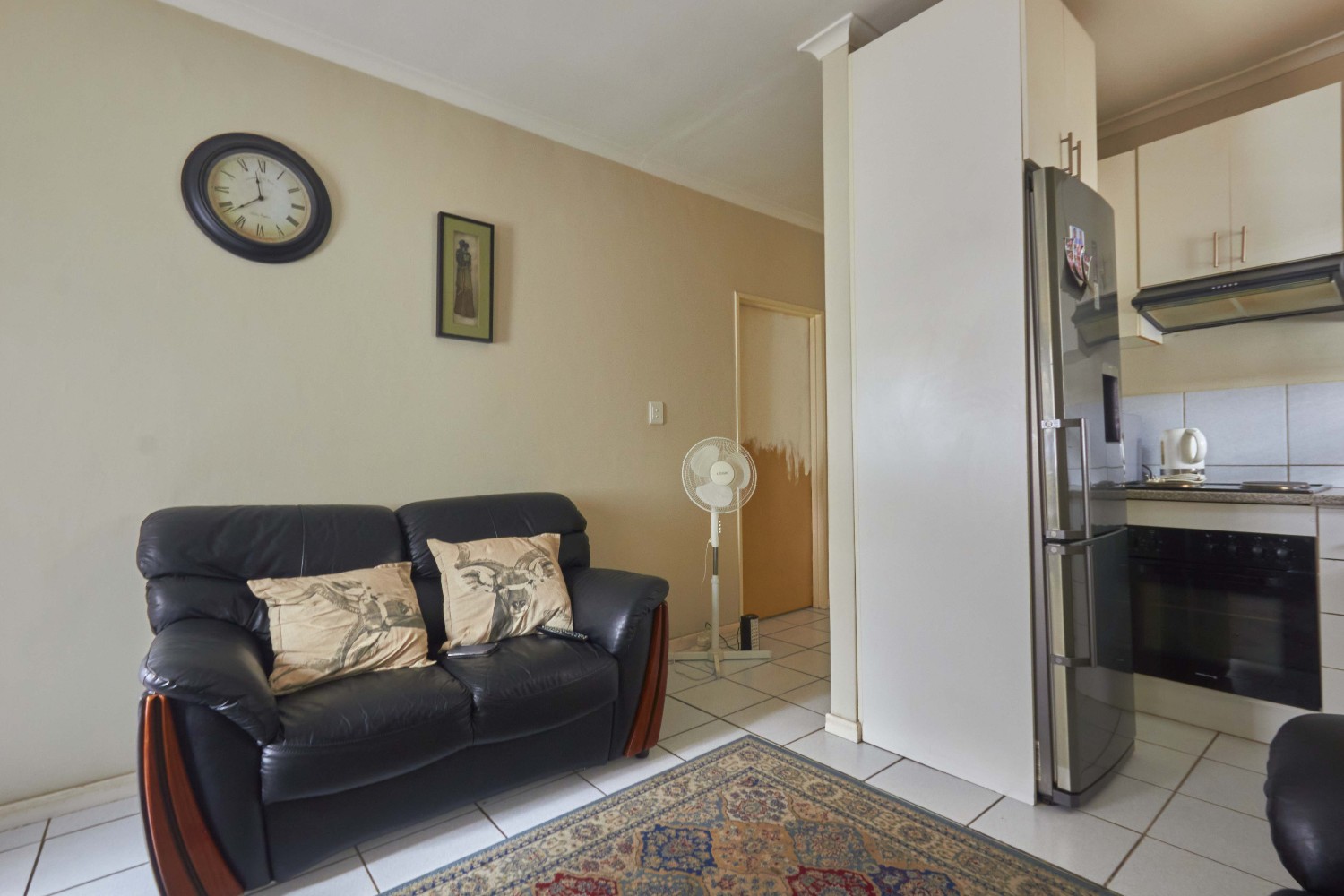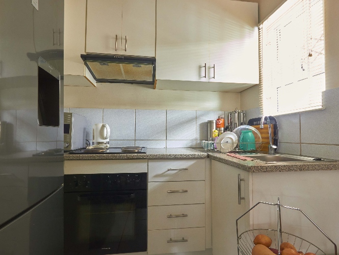 The lovely lounge area, tiled throughout, opens onto the fully fitted kitchen, which boasts a built-in stove, oven, extractor fan and ample built-in cupboards and countertop space.