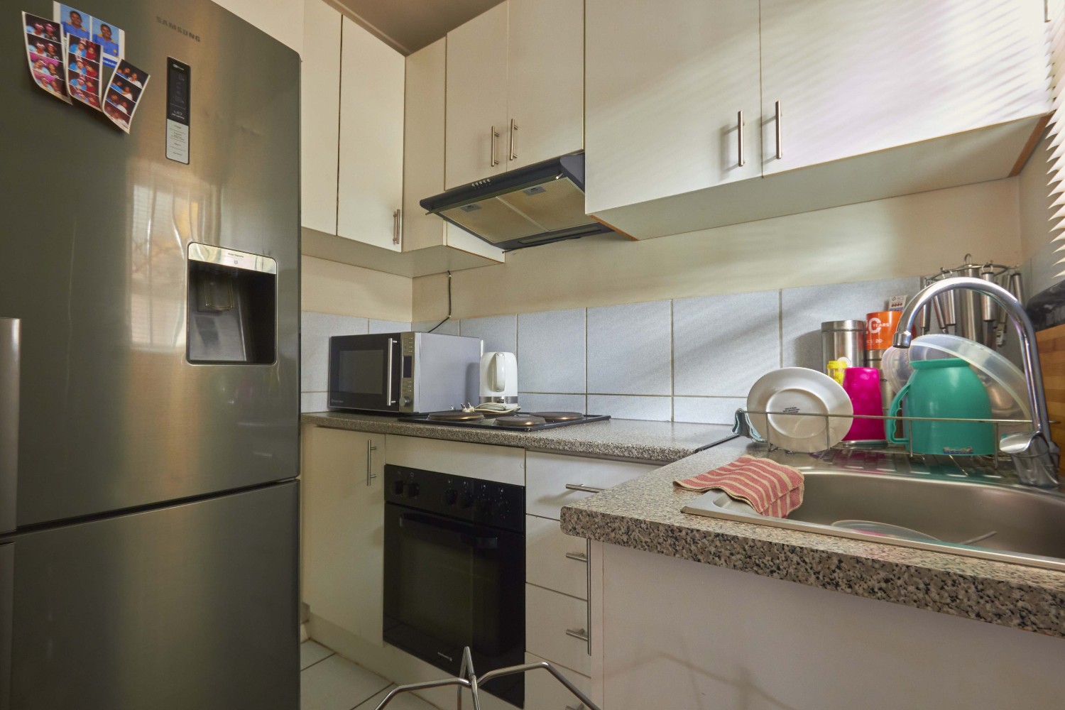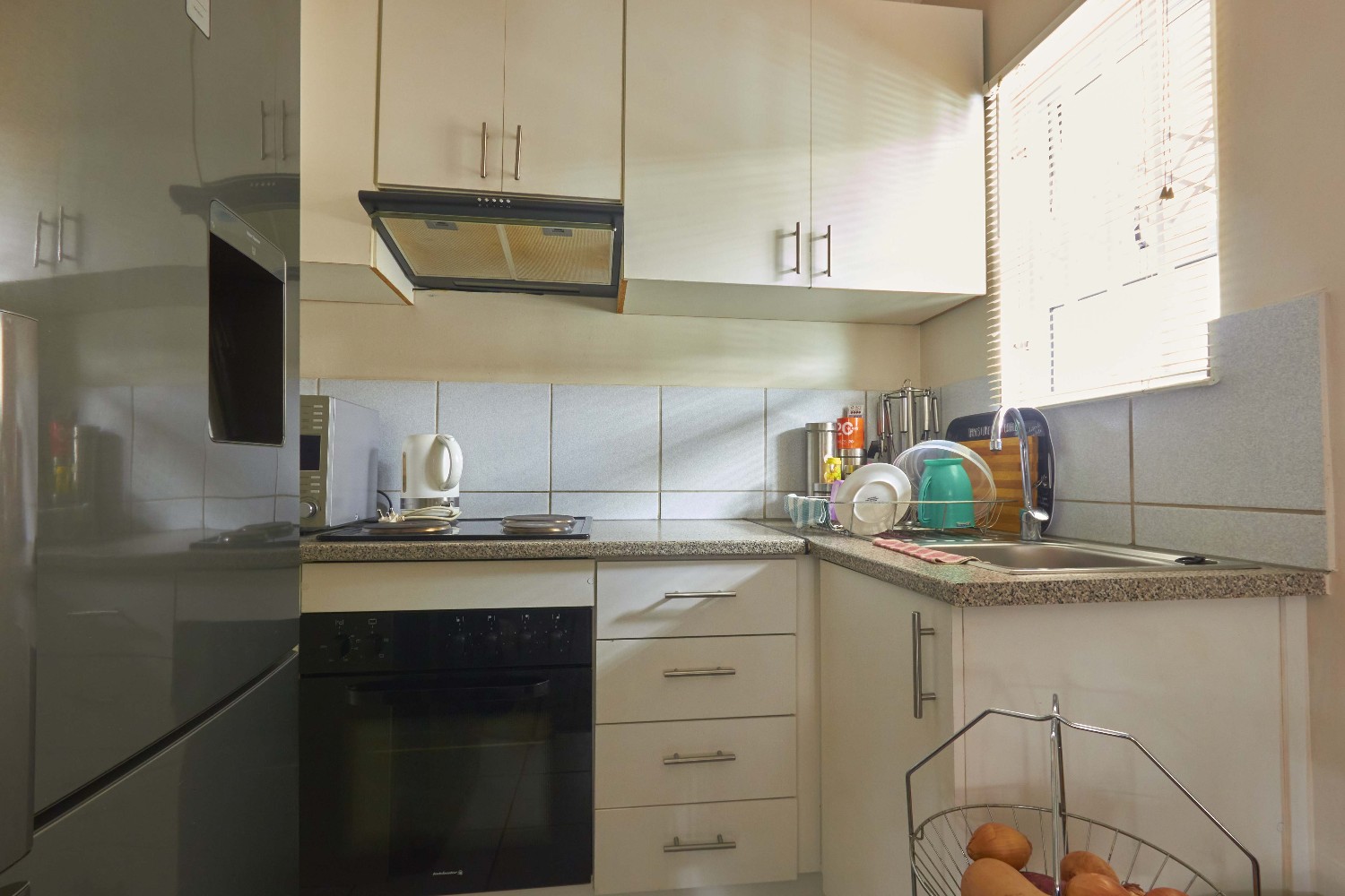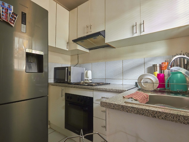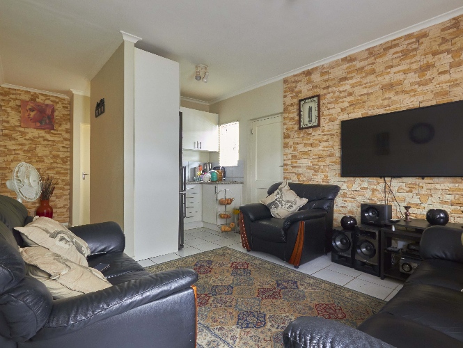 The lovely lounge area, tiled throughout, opens onto the fully fitted kitchen, which boasts a built-in stove, oven, extractor fan and ample built-in cupboards and countertop space.