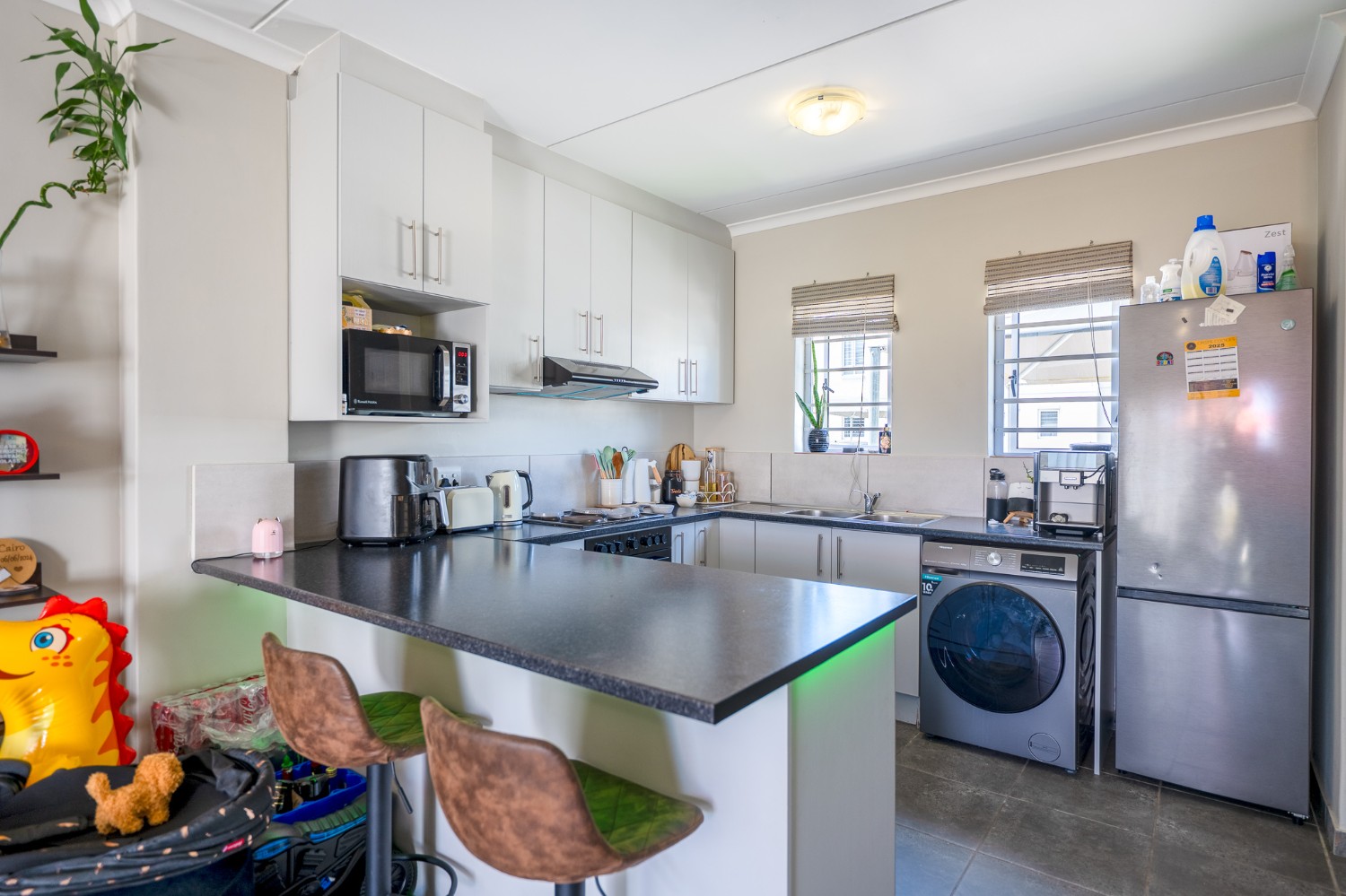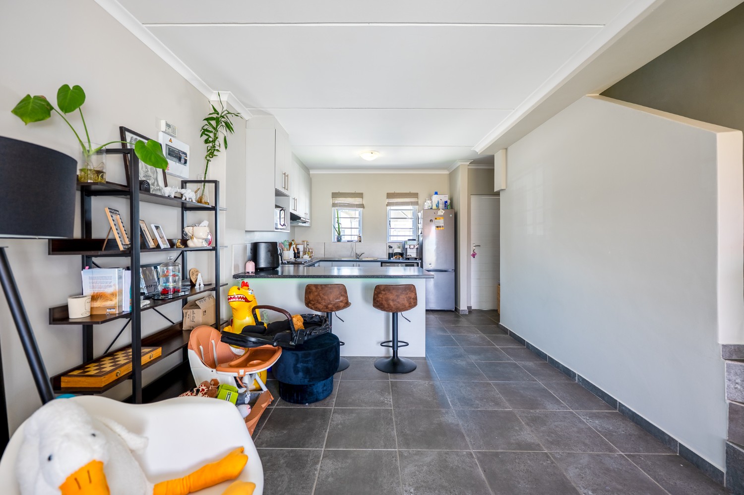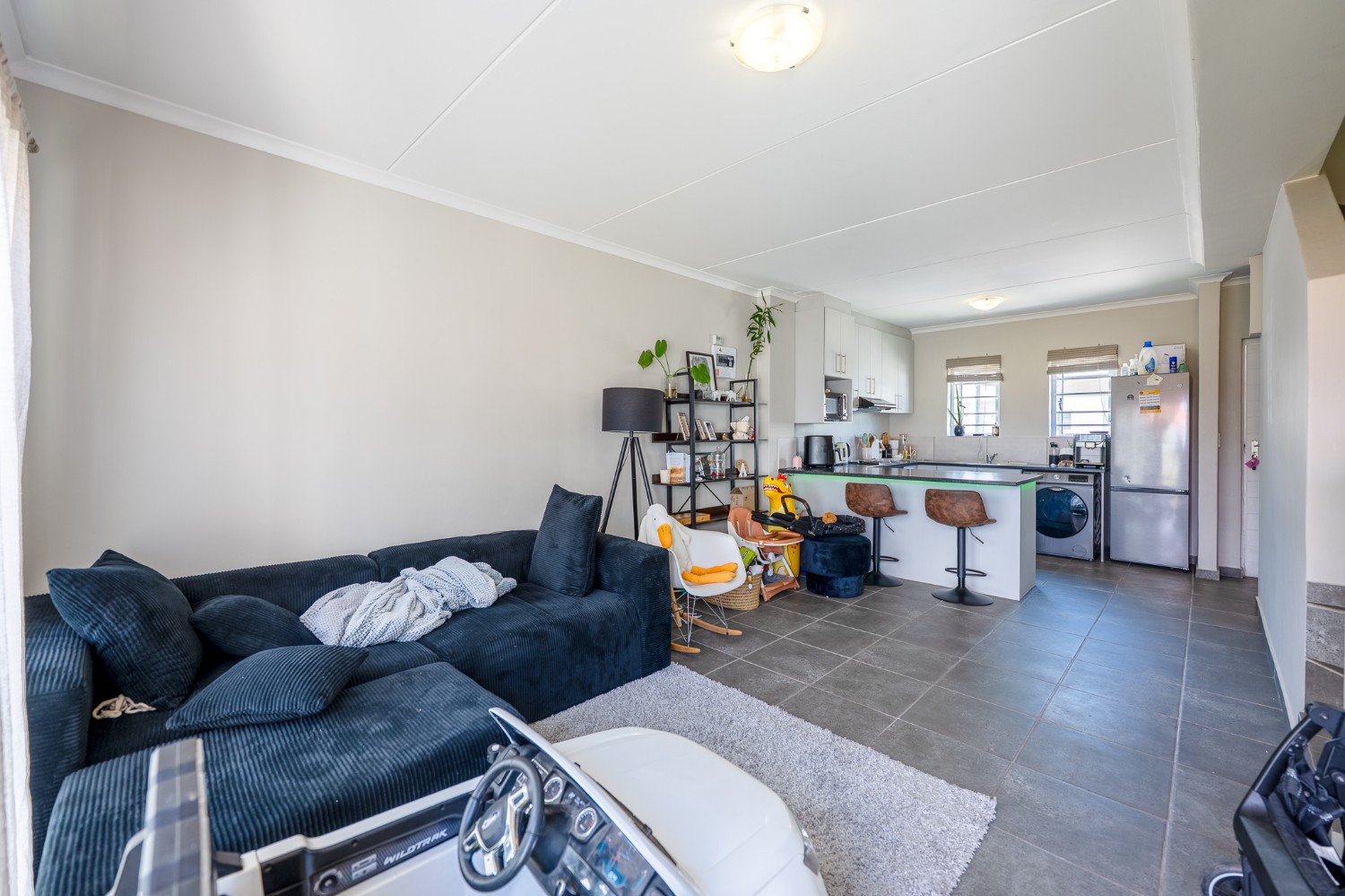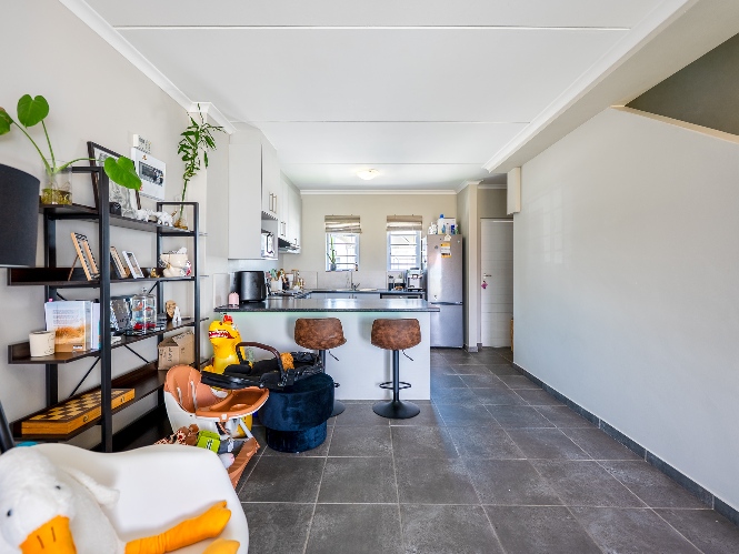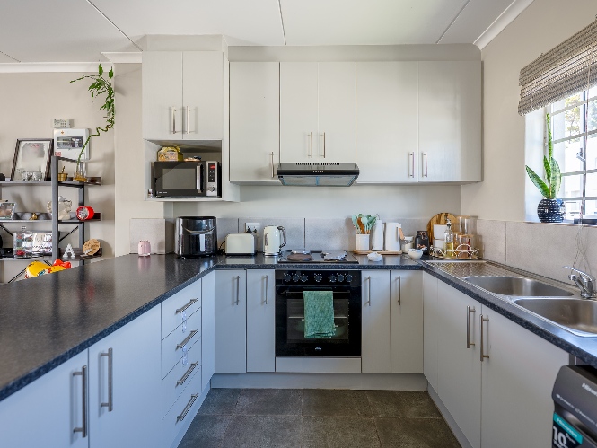 The open-plan lounge creates a welcoming atmosphere and includes a sliding door that opens up to the backyard with a patio area and lovely views of Table Mountain, perfect for enjoying some fresh air and creating an outdoor area for entertaining. The property features a charming kitchen with light wood cupboards, ample countertop space, an under-counter oven and hob, one plumbing point, and space for a fridge.