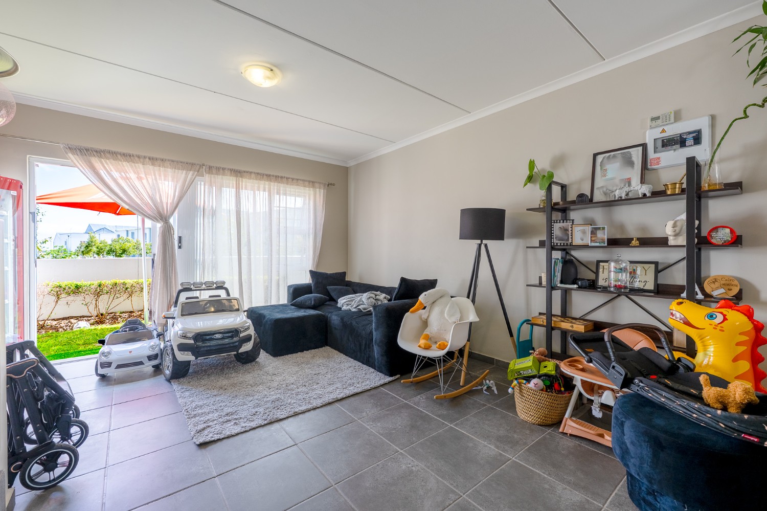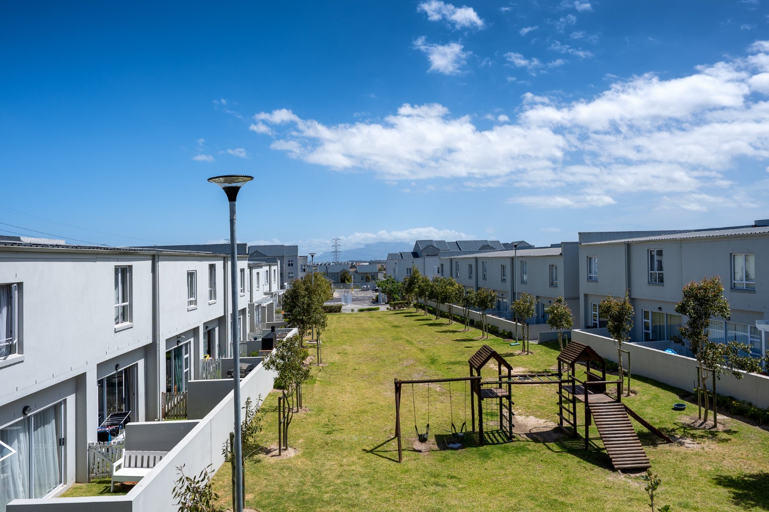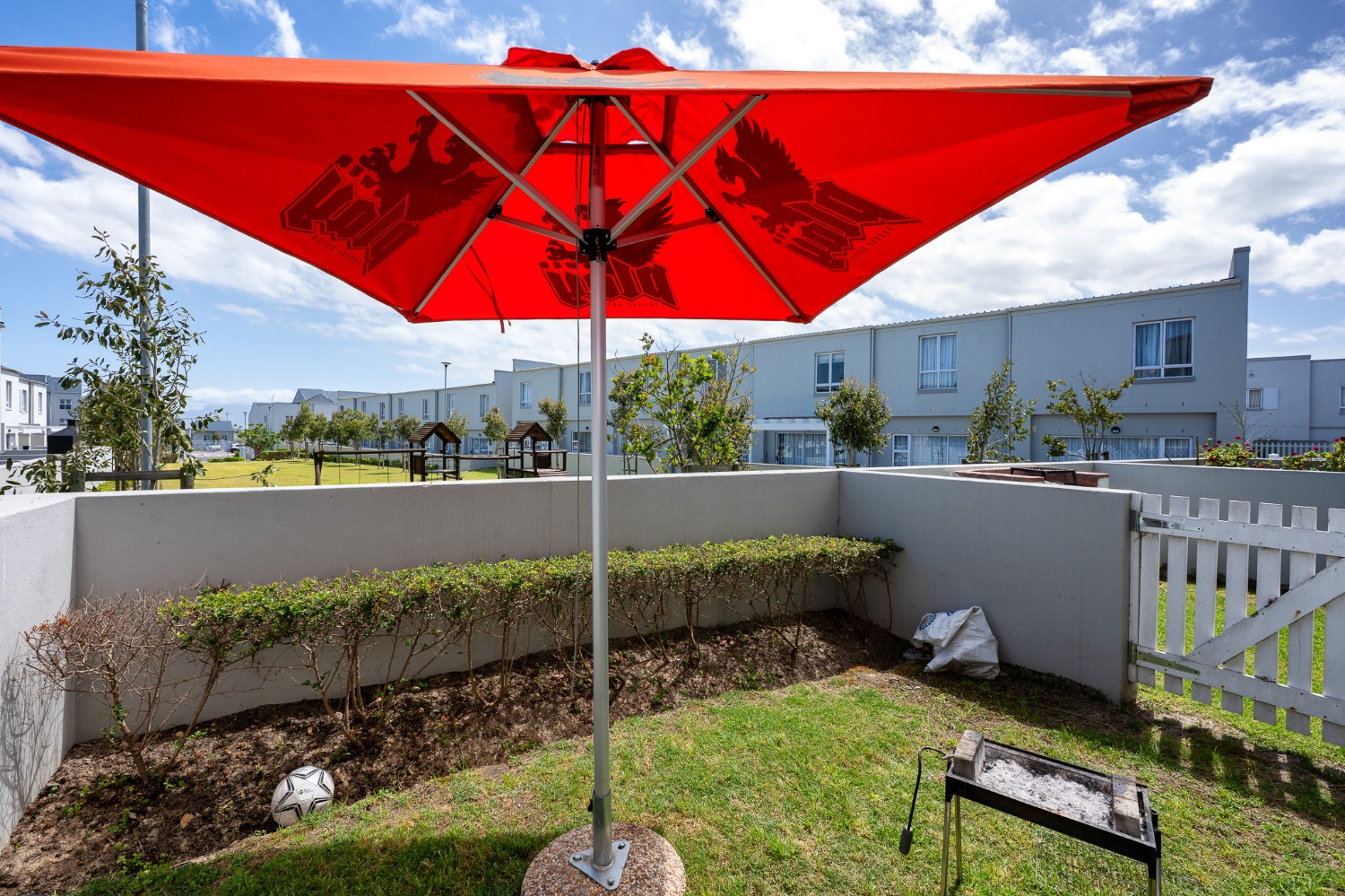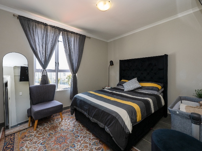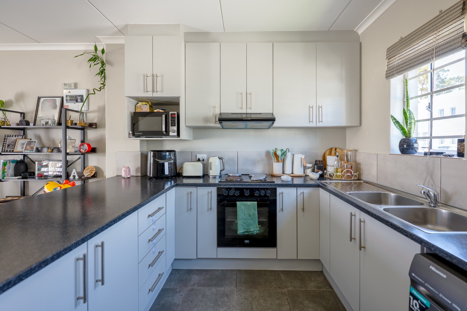 The open-plan lounge creates a welcoming atmosphere and includes a sliding door that opens up to the backyard with a patio area and lovely views of Table Mountain, perfect for enjoying some fresh air and creating an outdoor area for entertaining. The property features a charming kitchen with light wood cupboards, ample countertop space, an under-counter oven and hob, one plumbing point, and space for a fridge.