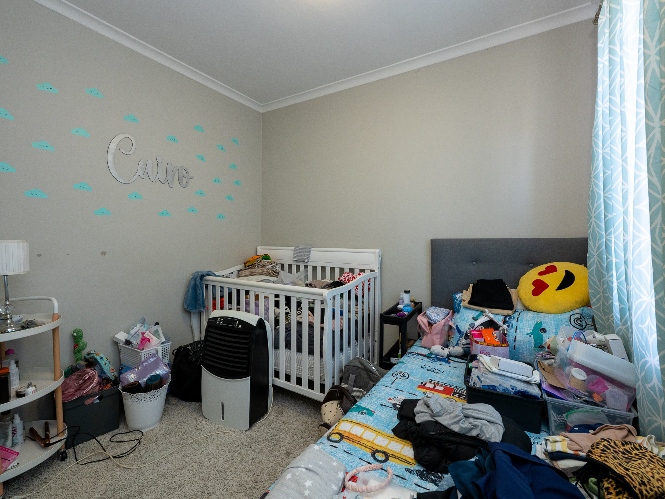 Moving upstairs, there are two well-sized bedrooms, both offering plenty of natural light and built-in cupboards. The family bathroom features a bathtub, a shower, a basin, and a toilet.