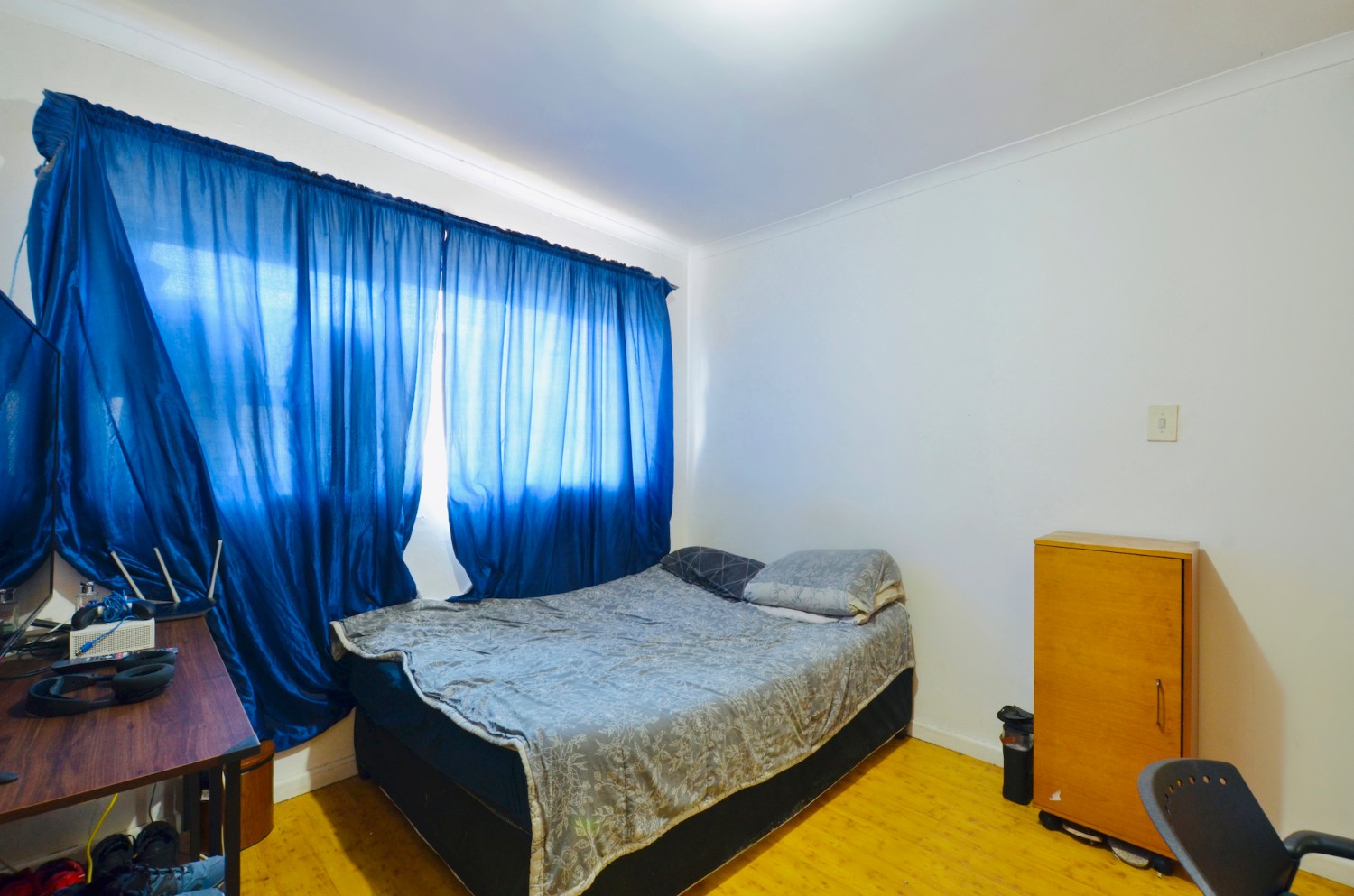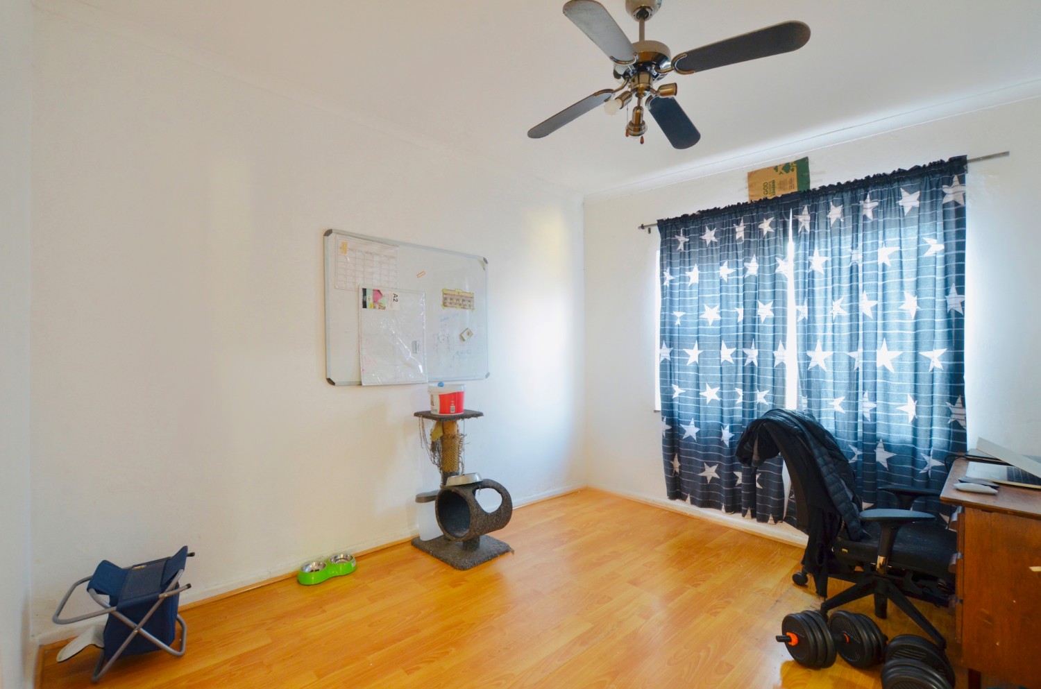 The main bedroom is a true retreat, featuring built-in cupboards, plenty of space, a study area, and its own en-suite bathroom. The additional bedrooms are well-sized and share a family bathroom, complemented by a convenient guest loo.