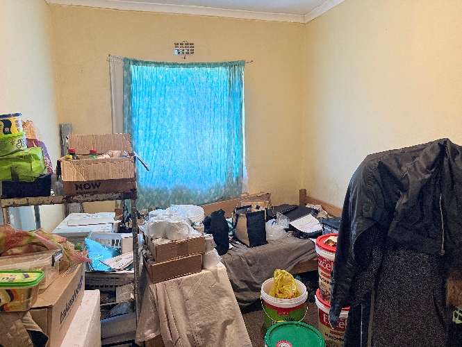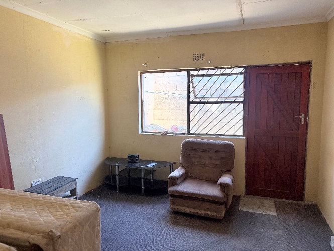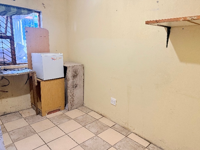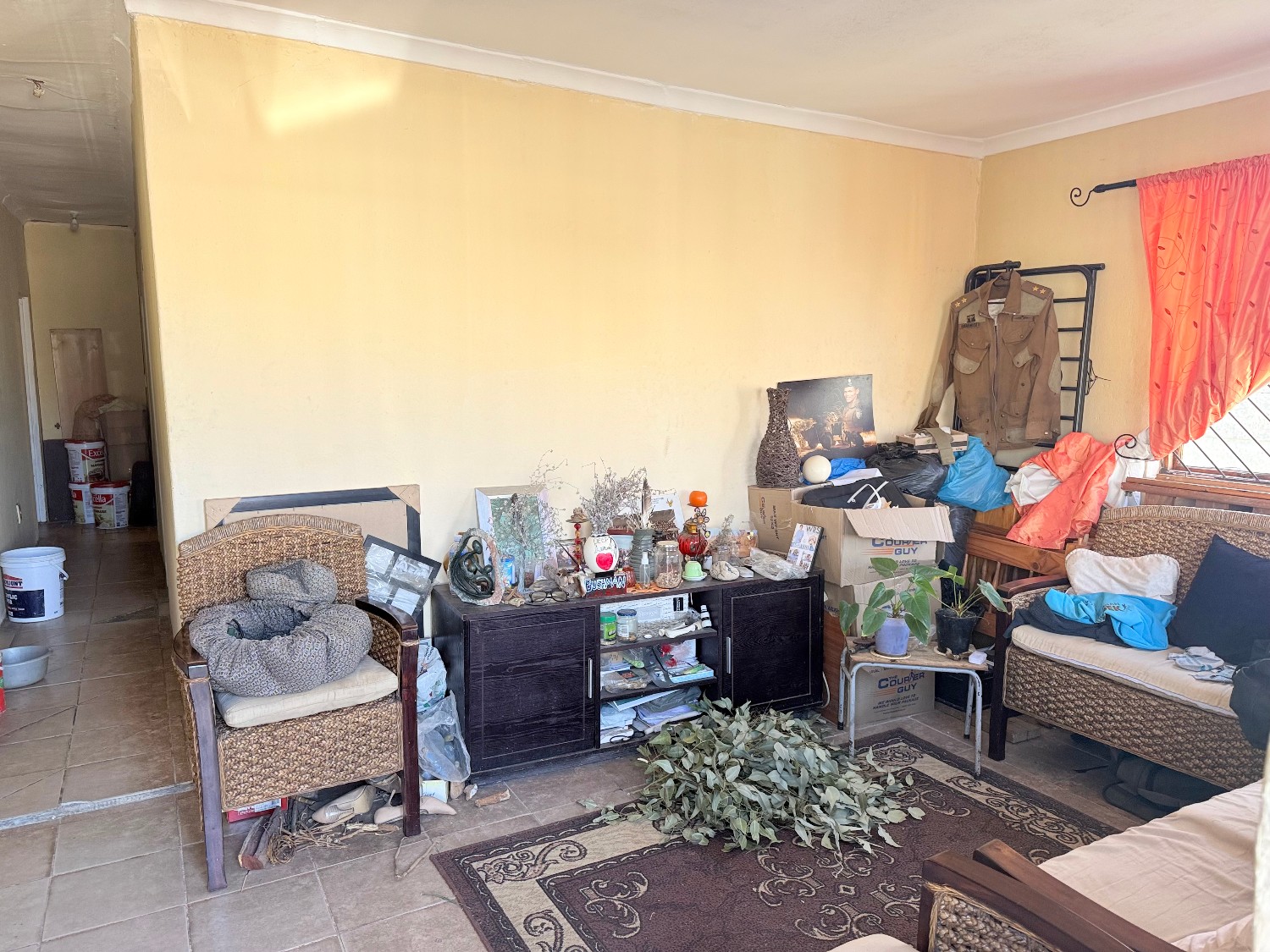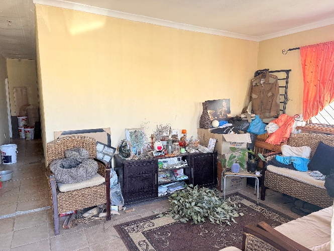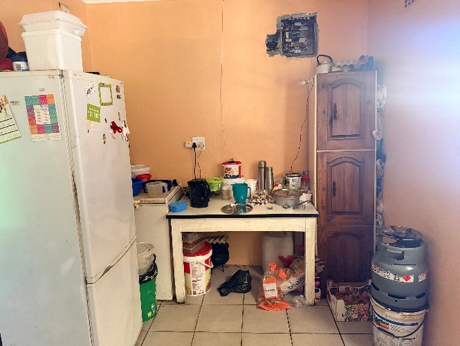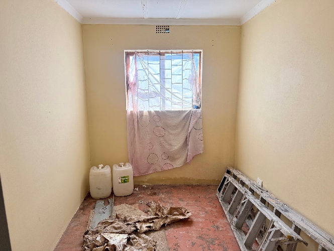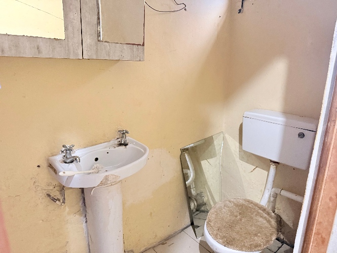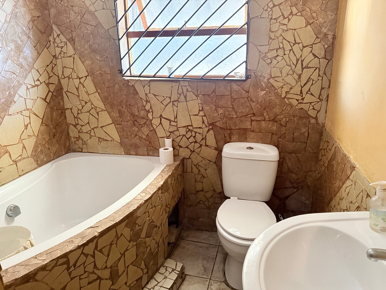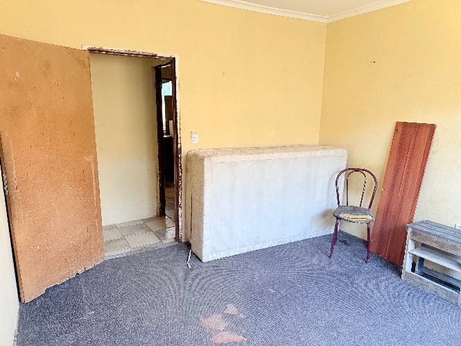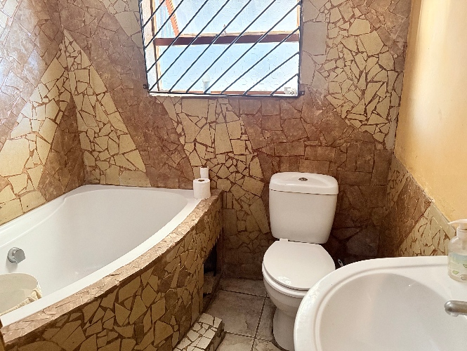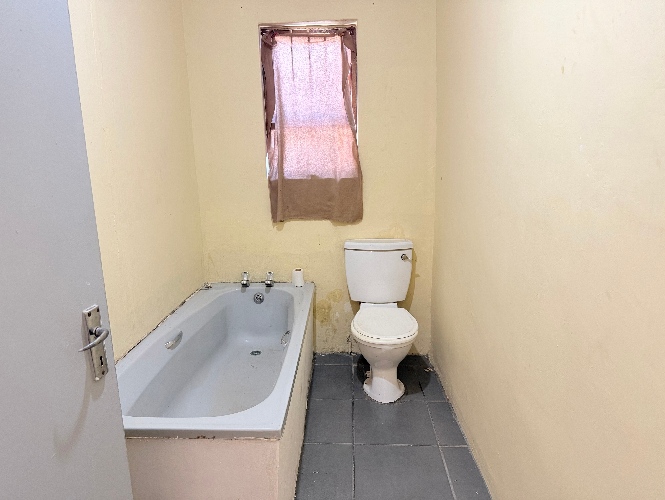 The main home features a well-sized lounge area, complete with tiled flooring and large windows for plenty of natural sunlight. The kitchen offers ample space for potential built-in cupboards and room for renovations. There are three well-sized bedrooms and a family bathroom equipped with a corner bathtub, a basin, and a toilet.