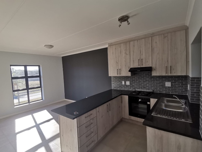 Upon entering the apartment, you are greeted by the open-plan lounge and fully fitted kitchen, with tiled flooring and benefiting from ample natural light streaming in through the large window. The charming kitchen has light wood cupboards, granite countertops, an under-counter oven and hob, a double sink, and space for a fridge.