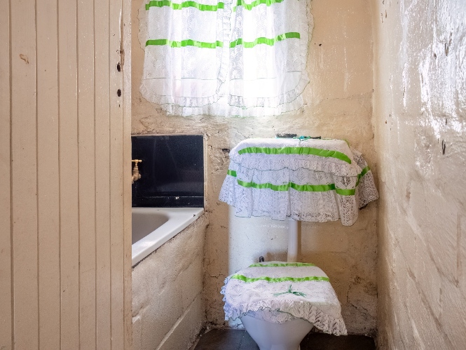 Upstairs, the home boasts two well-sized bedrooms along with a bathroom fitted with a bathtub, basin, and toilet.