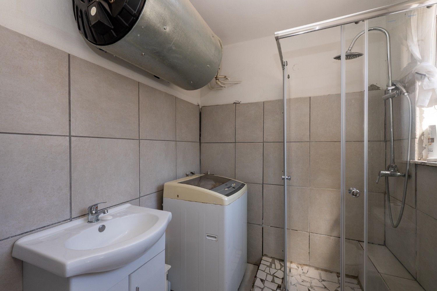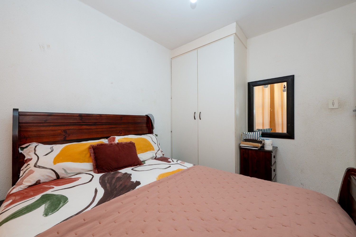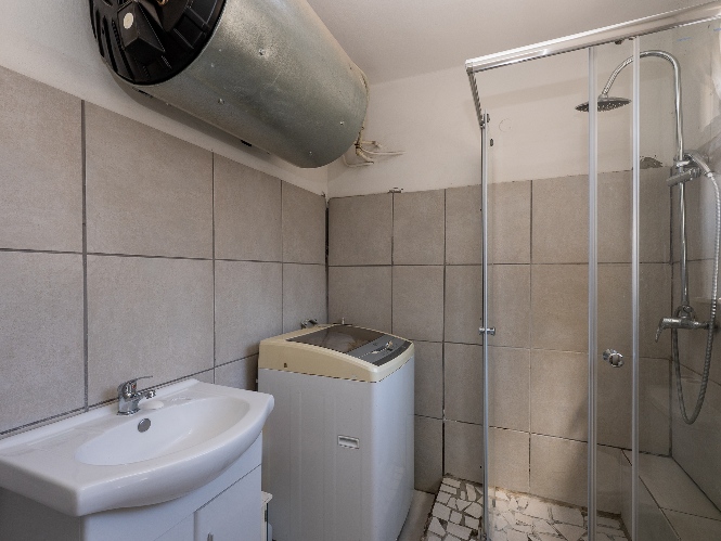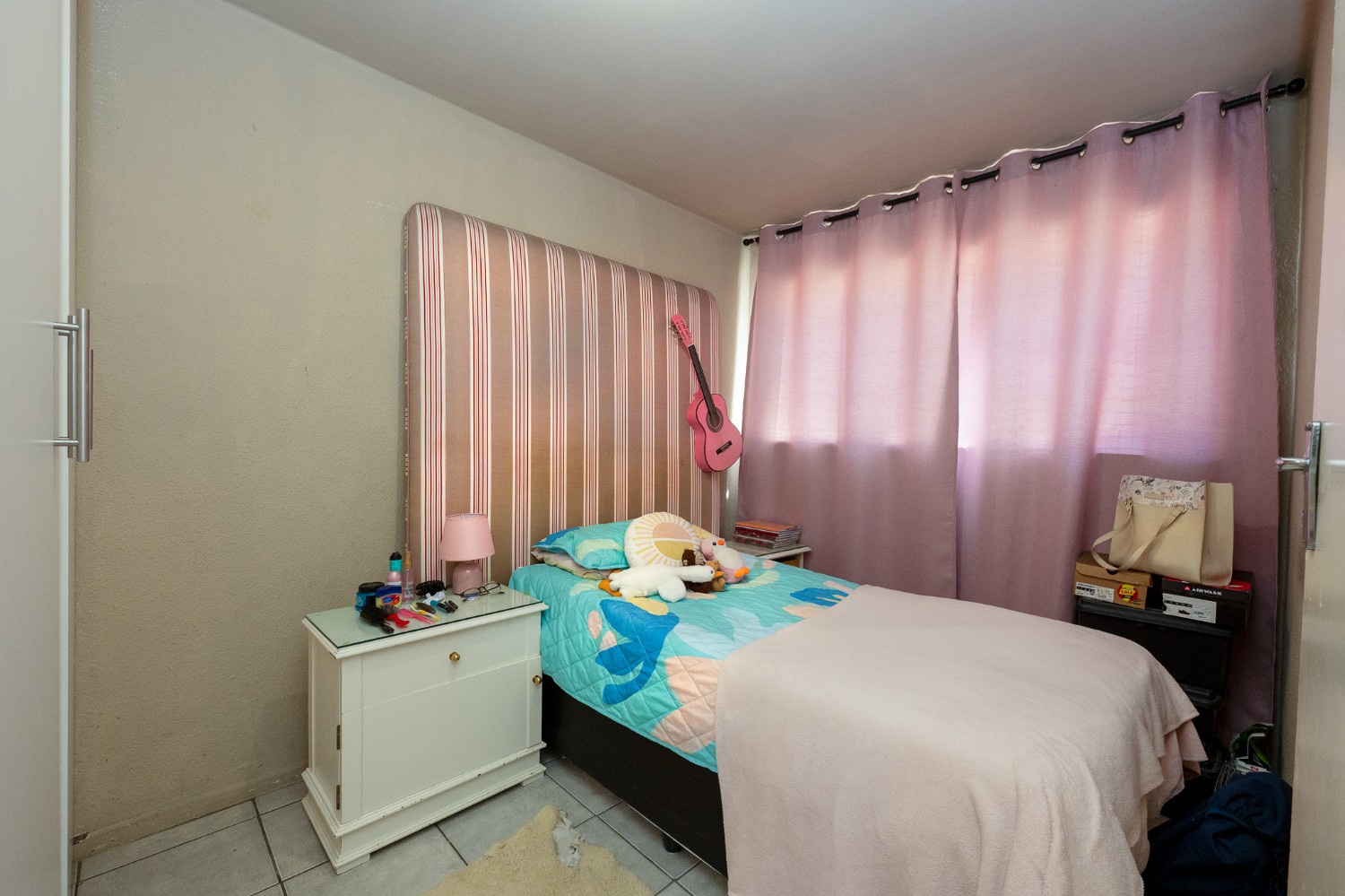 There are two well-sized bedrooms, each complete with built-in cupboards and tiled flooring. The tiled bathroom is equipped with a shower, a basin, and a toilet.