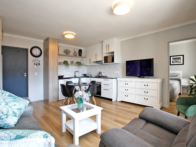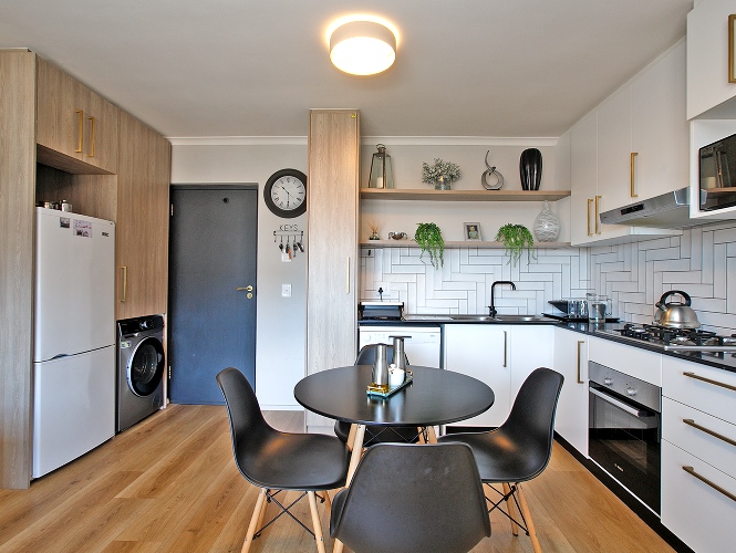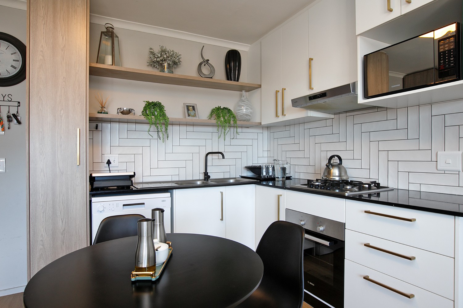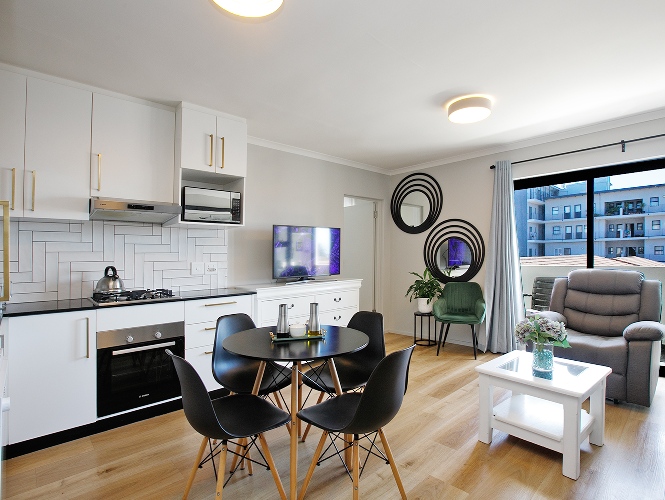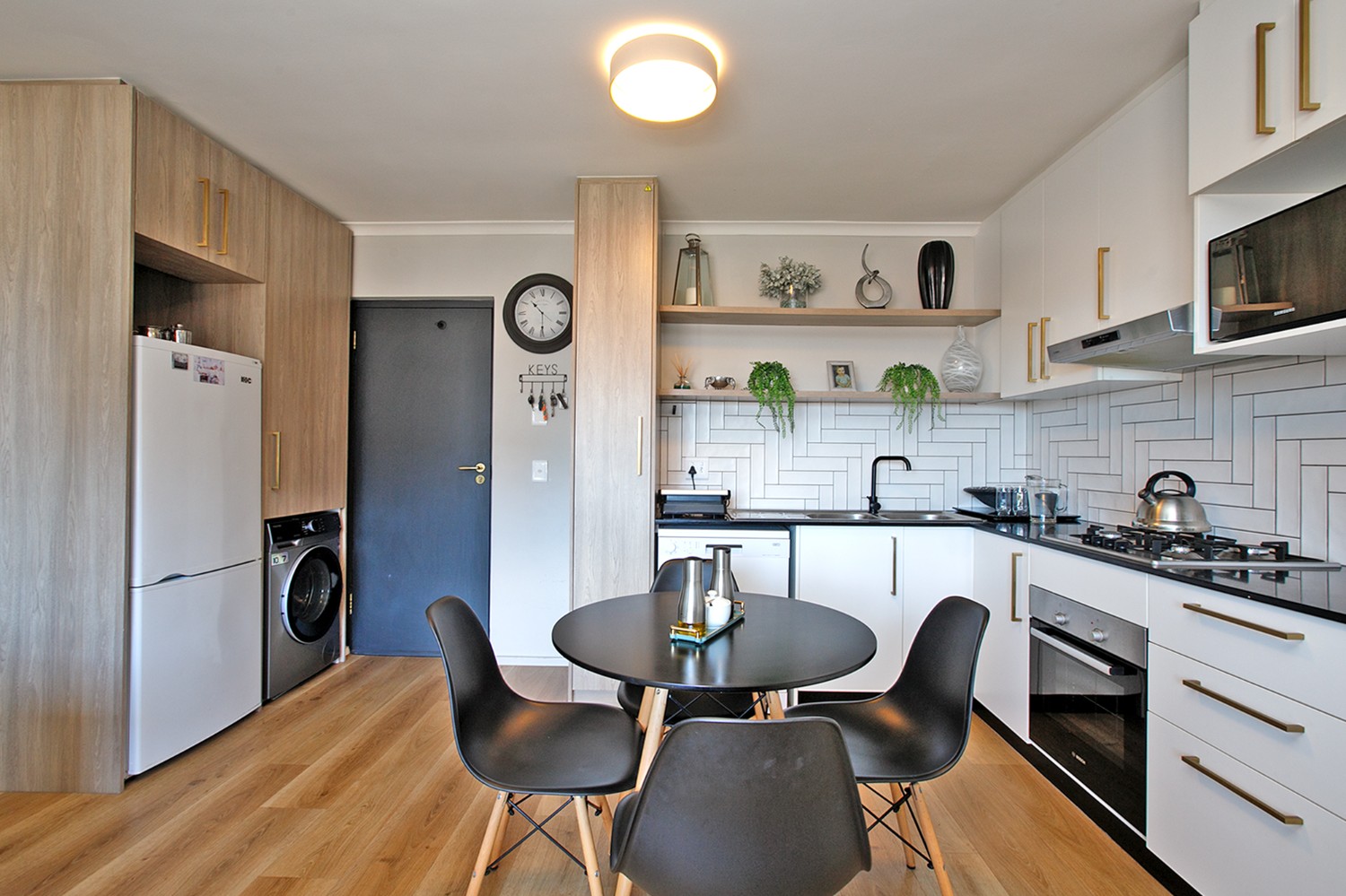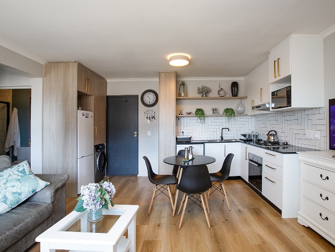 Open-plan living area seamlessly connected to a stunning kitchen and balcony. Gas stove, modern cabinetry, and quality finishes.