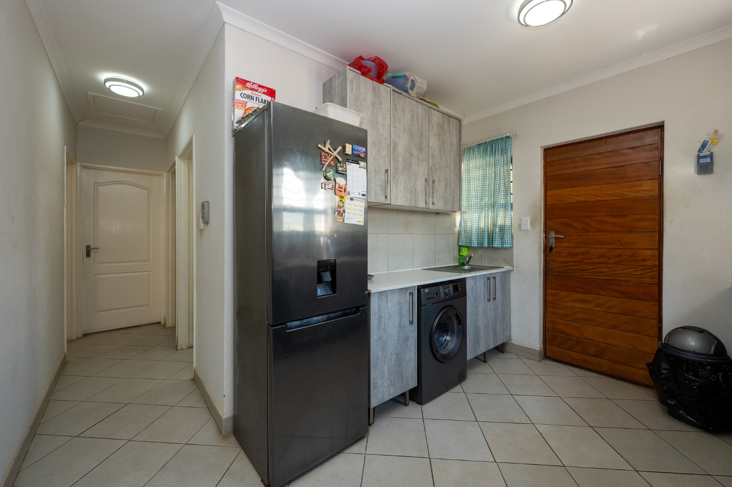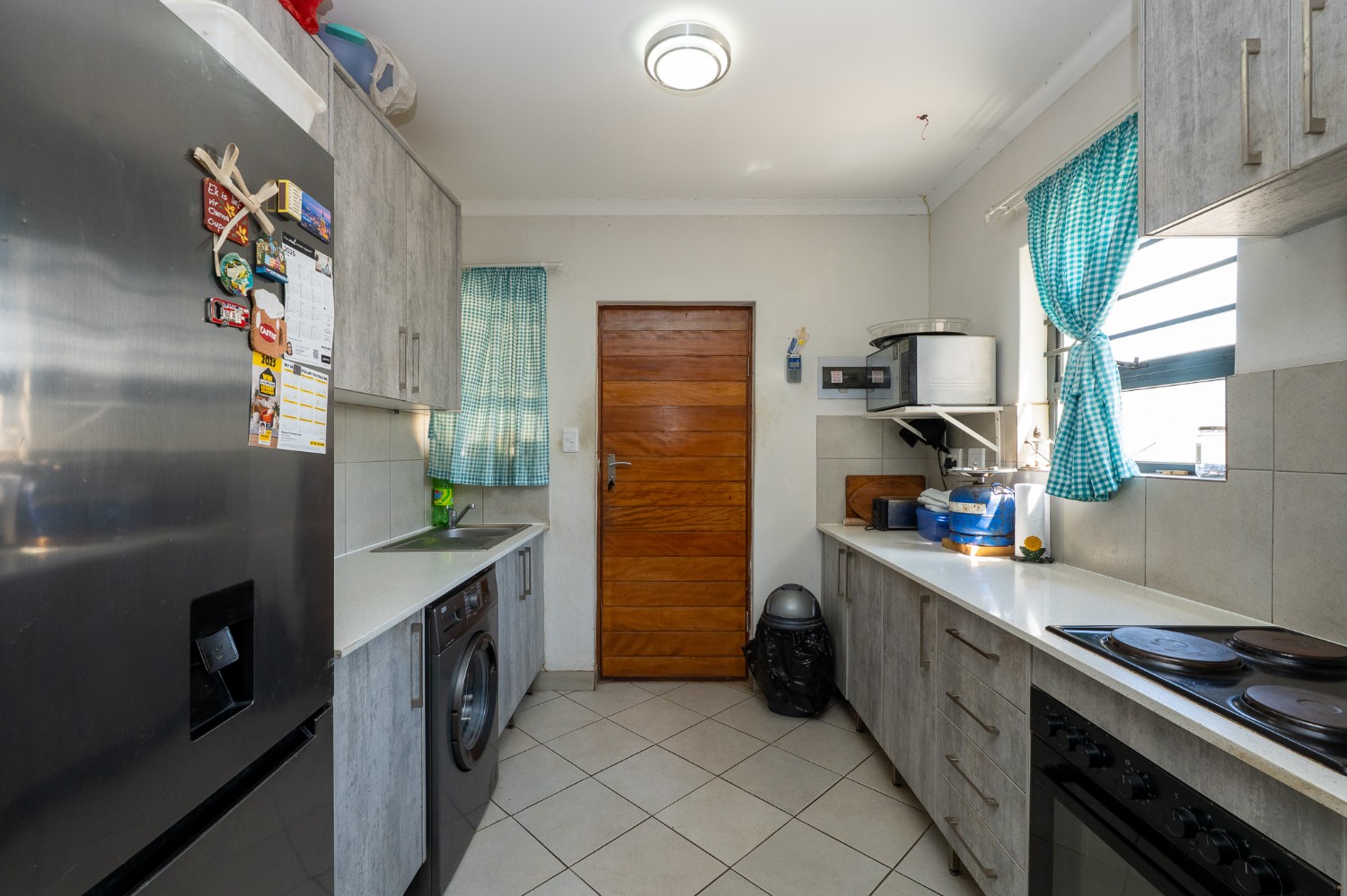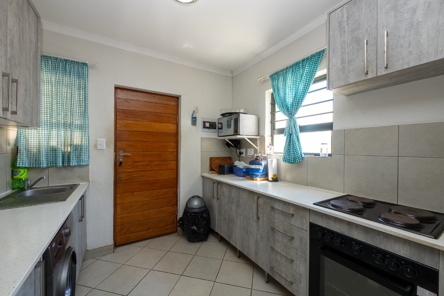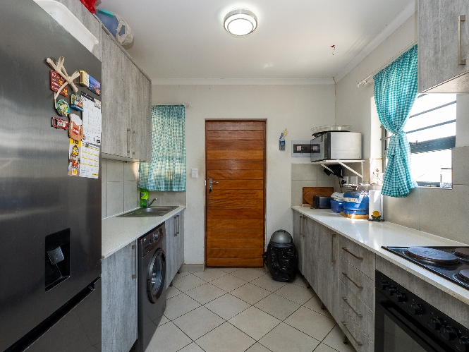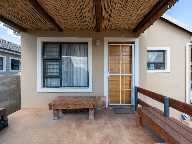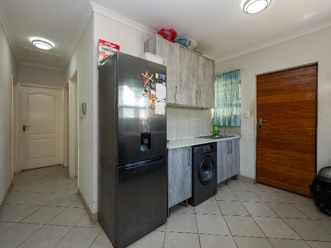 The front door opens into a fully tiled lounge area, creating a warm and welcoming atmosphere. From here, you move into the modern kitchen, which features lovely countertops, a 4-plate electric stove and oven, a single sink, built-in cupboards, and a plumbing point with space for a washing machine. A back door leads conveniently into the driveway, enhancing both practicality and security.