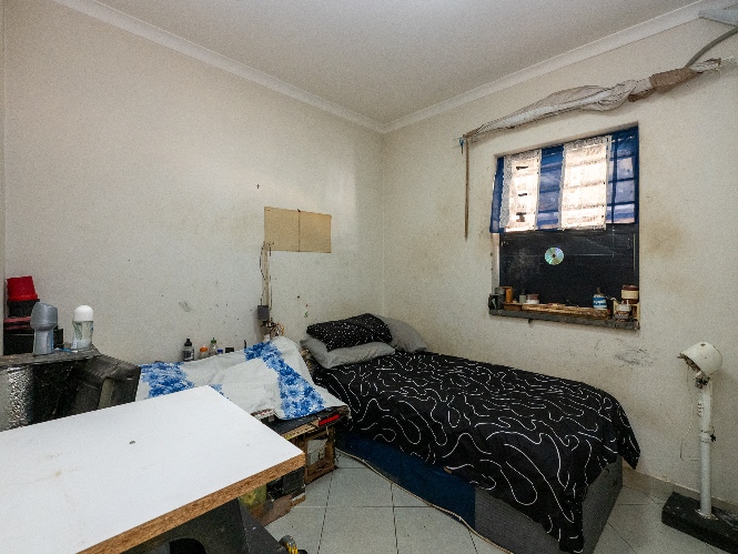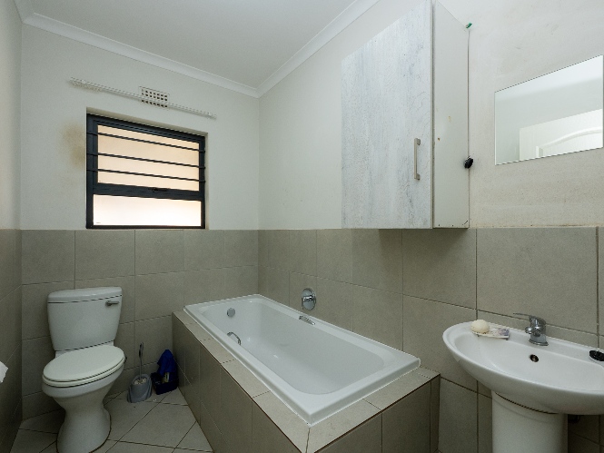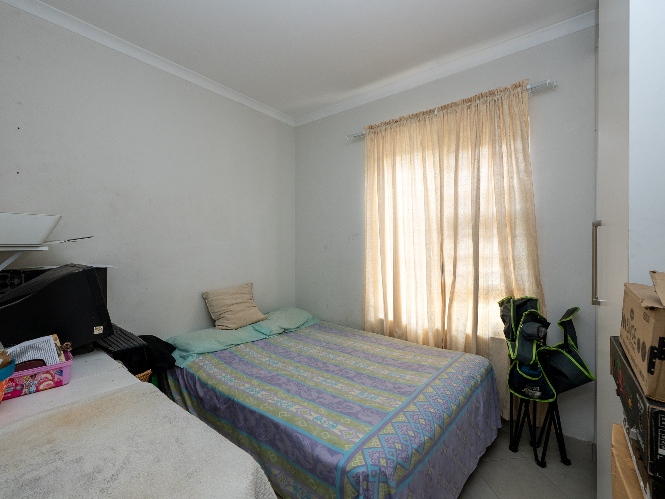 The passage leads to the family bathroom, fitted with a bath, basin, and toilet, all neatly tiled and complemented by aluminum windows. Two bedrooms are fully tiled with built-in cupboards and aluminum windows, while the main bedroom offers an en-suite bathroom with a shower, basin, and toilet.