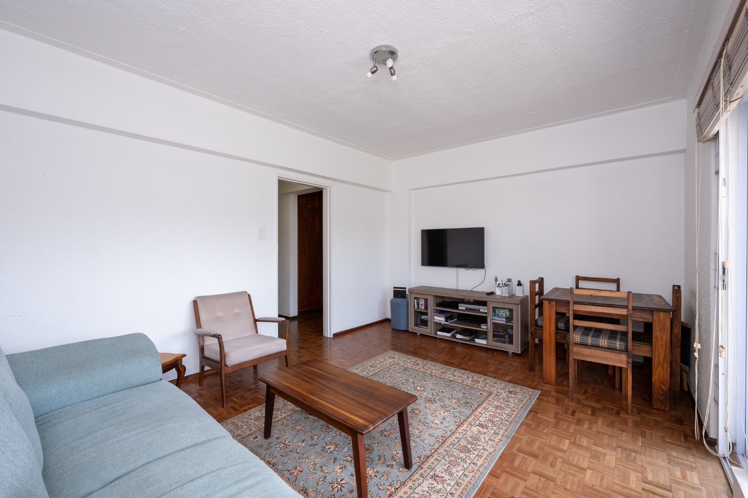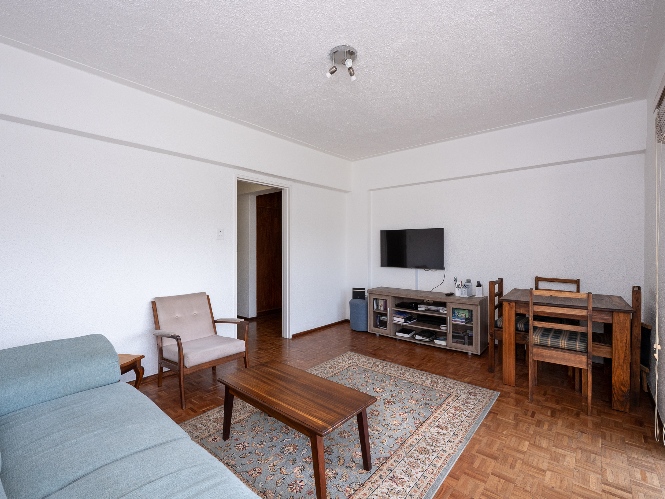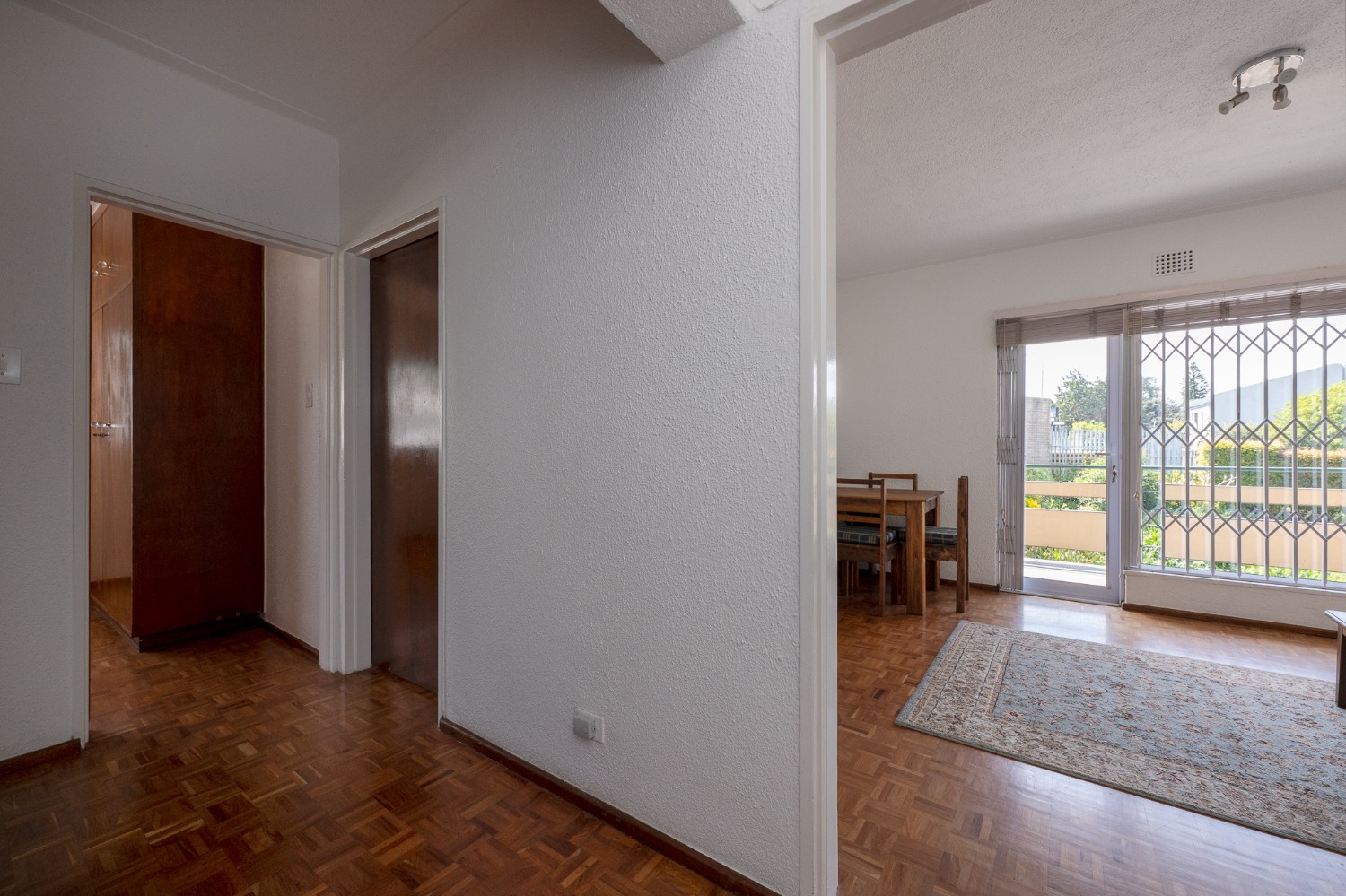The apartment features a generously sized lounge with beautiful parquet flooring and a door leading out to a balcony that showcases lovely views of the surrounding area, the perfect spot to relax and unwind. The kitchen is well-appointed with light wood cupboards, ample countertop space, an under-counter oven and hob, a plumbing point, and space for a fridge.