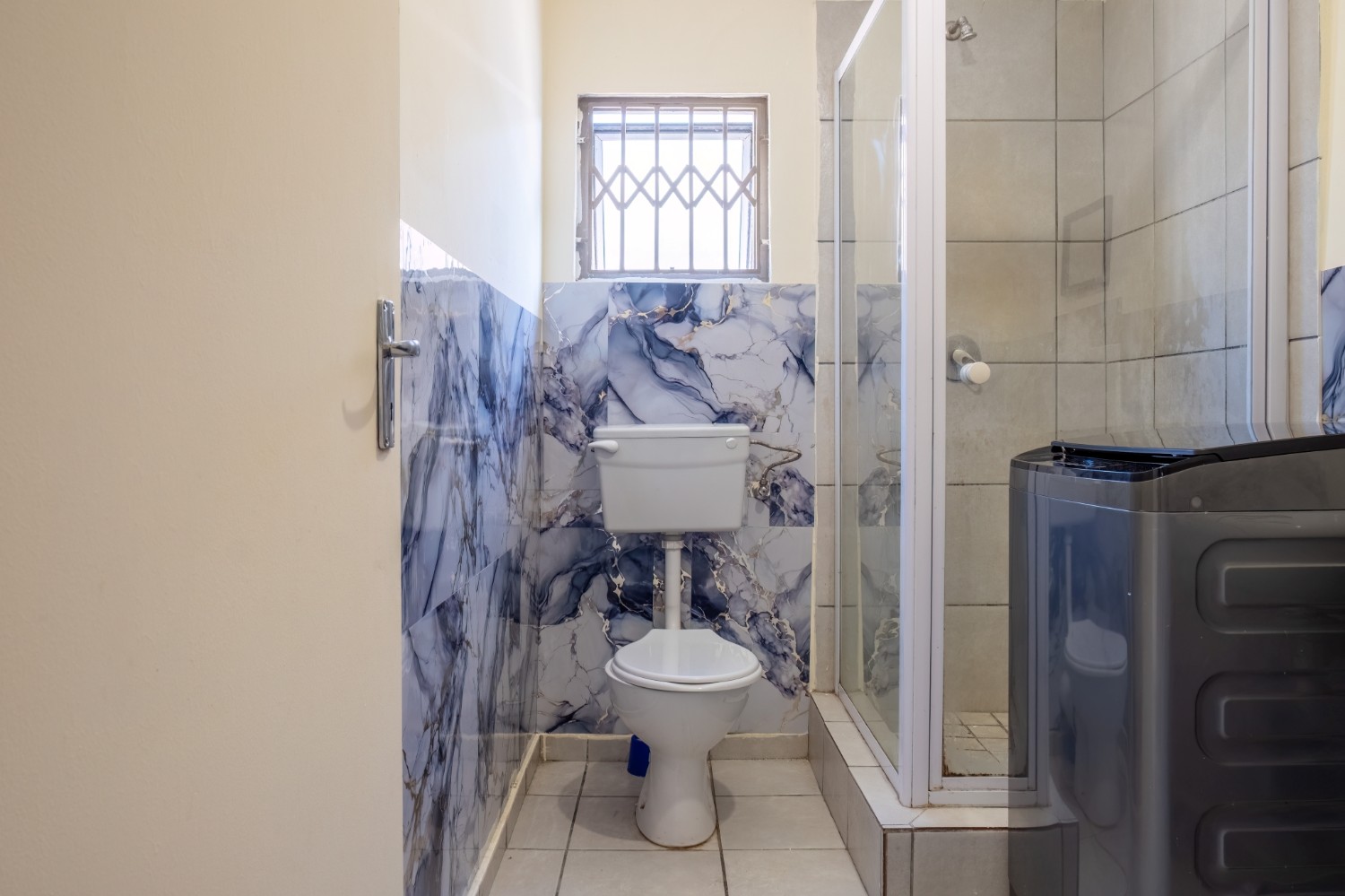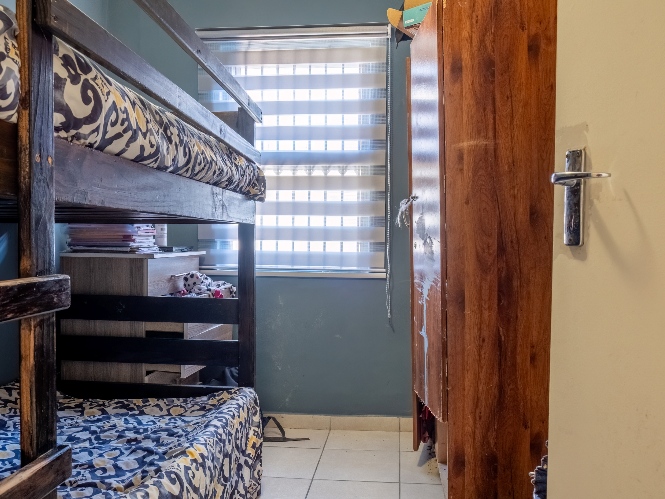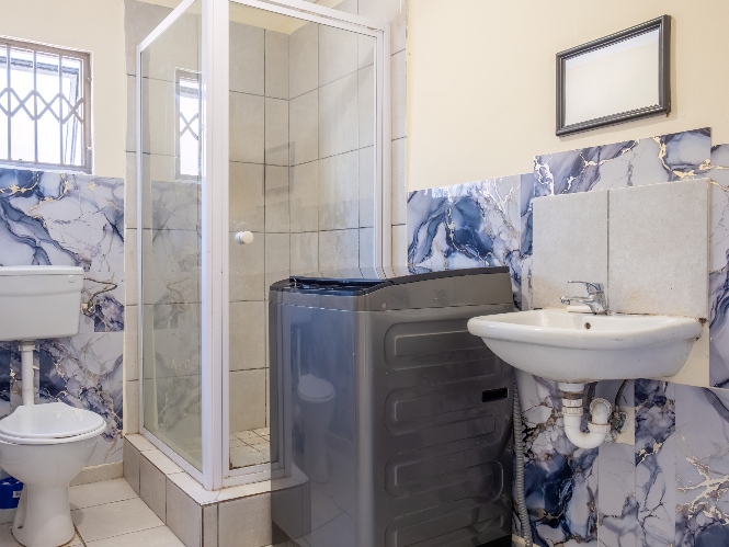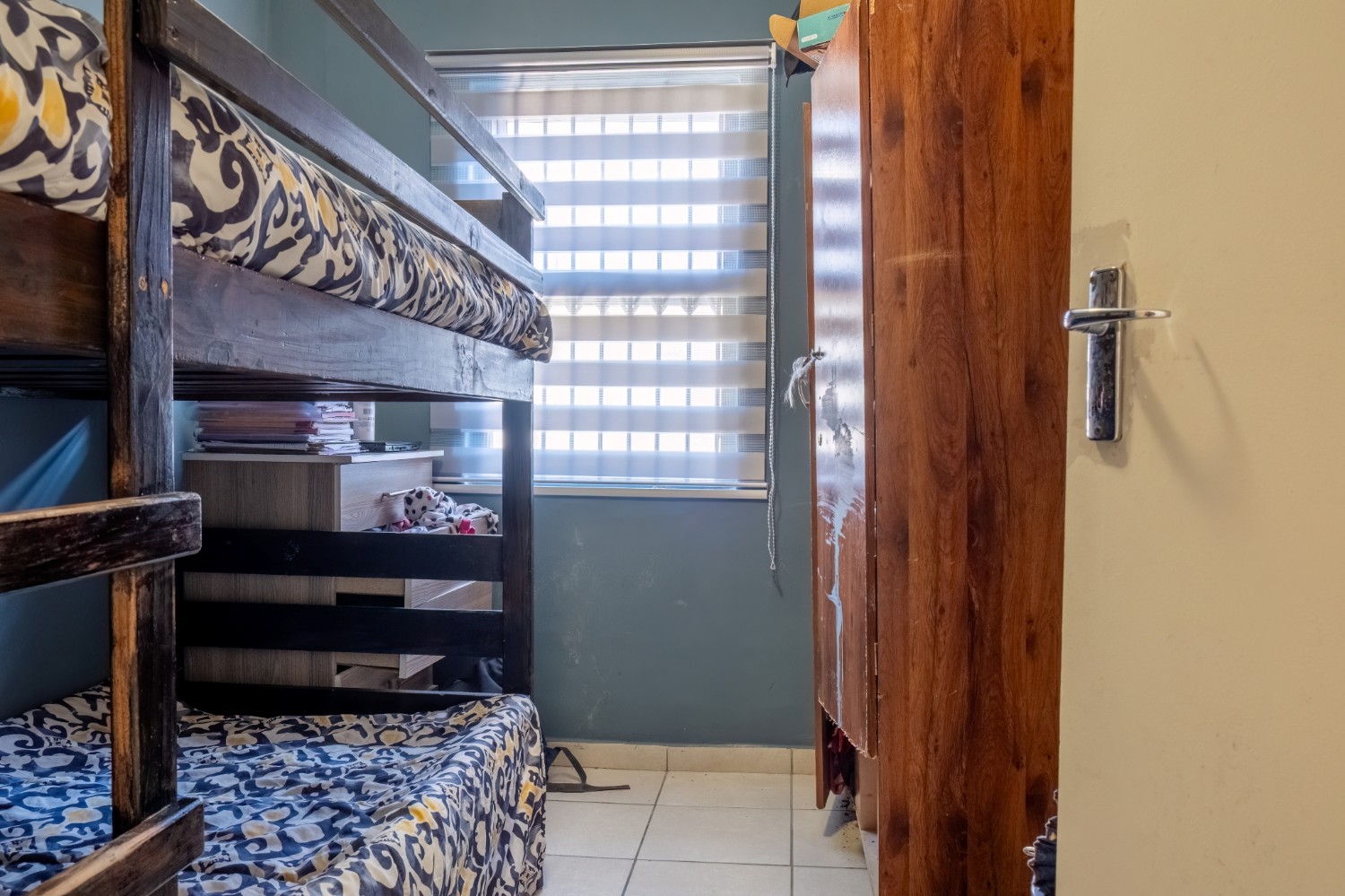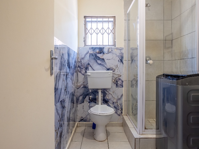 Both bedrooms are neatly finished with tiled flooring and offer space for potential built-in cupboards. The bathroom is fitted with a shower, basin, and toilet for your everyday convenience.