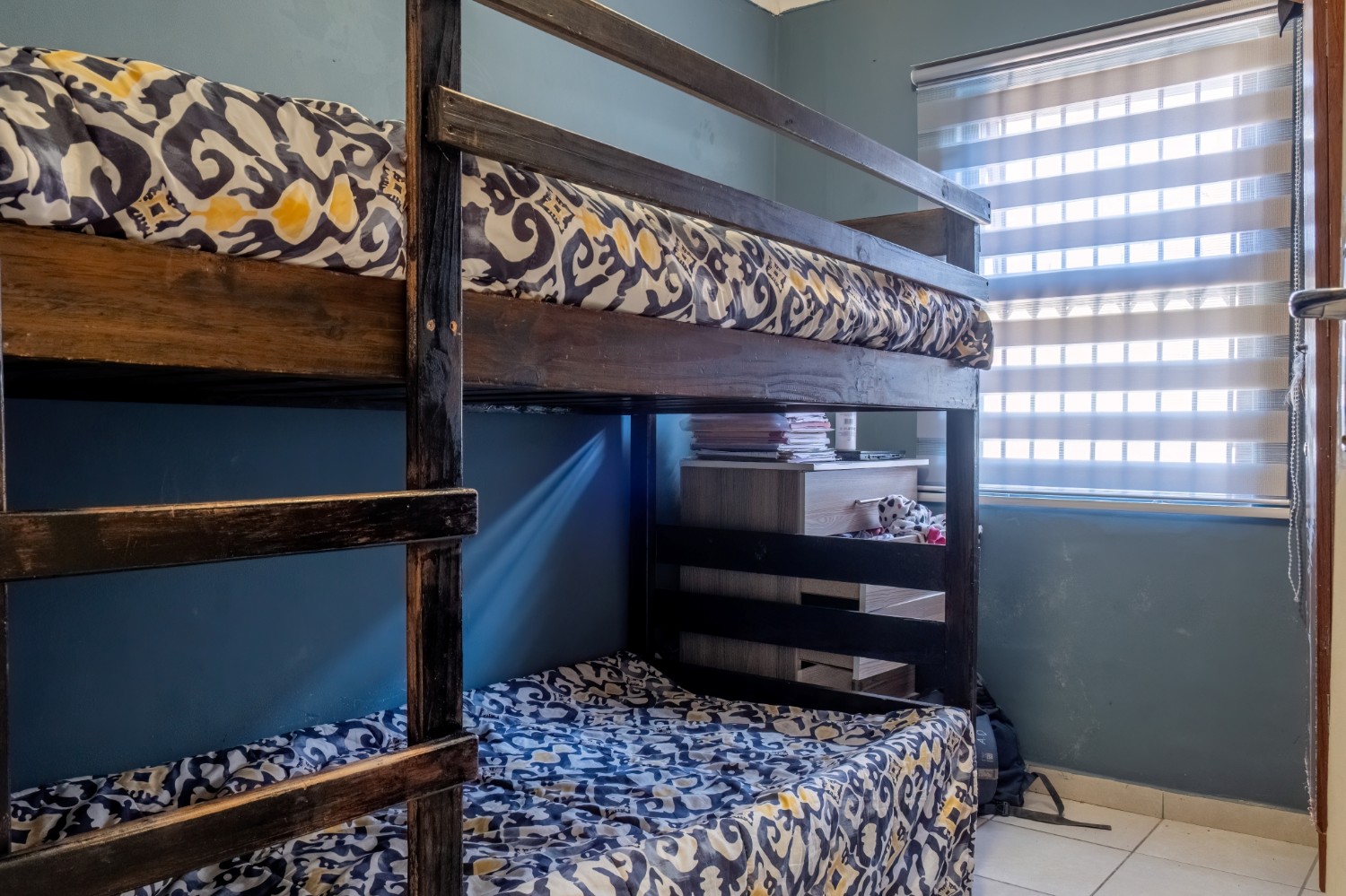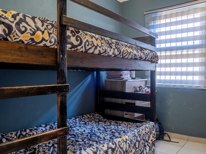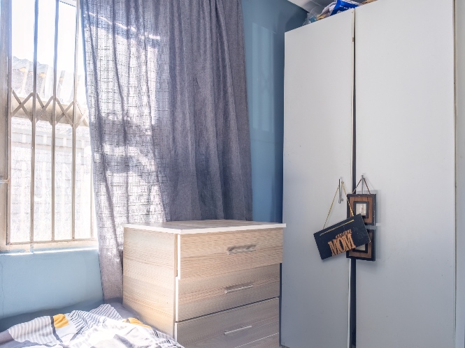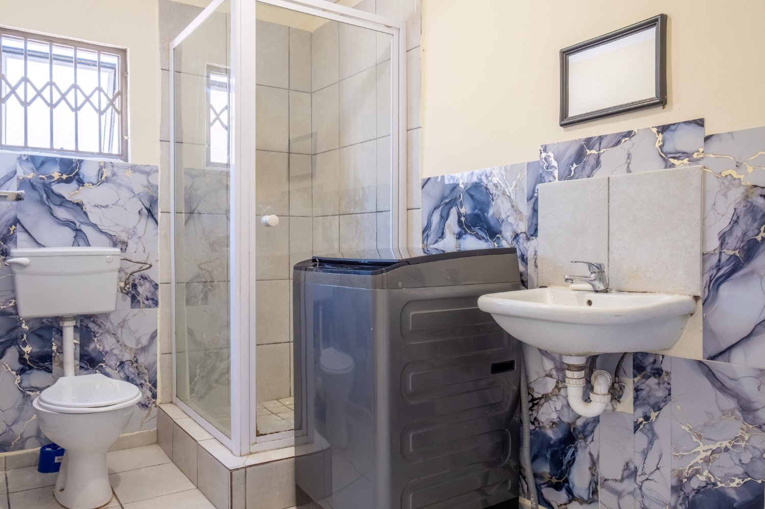 Both bedrooms are neatly finished with tiled flooring and offer space for potential built-in cupboards. The bathroom is fitted with a shower, basin, and toilet for your everyday convenience.