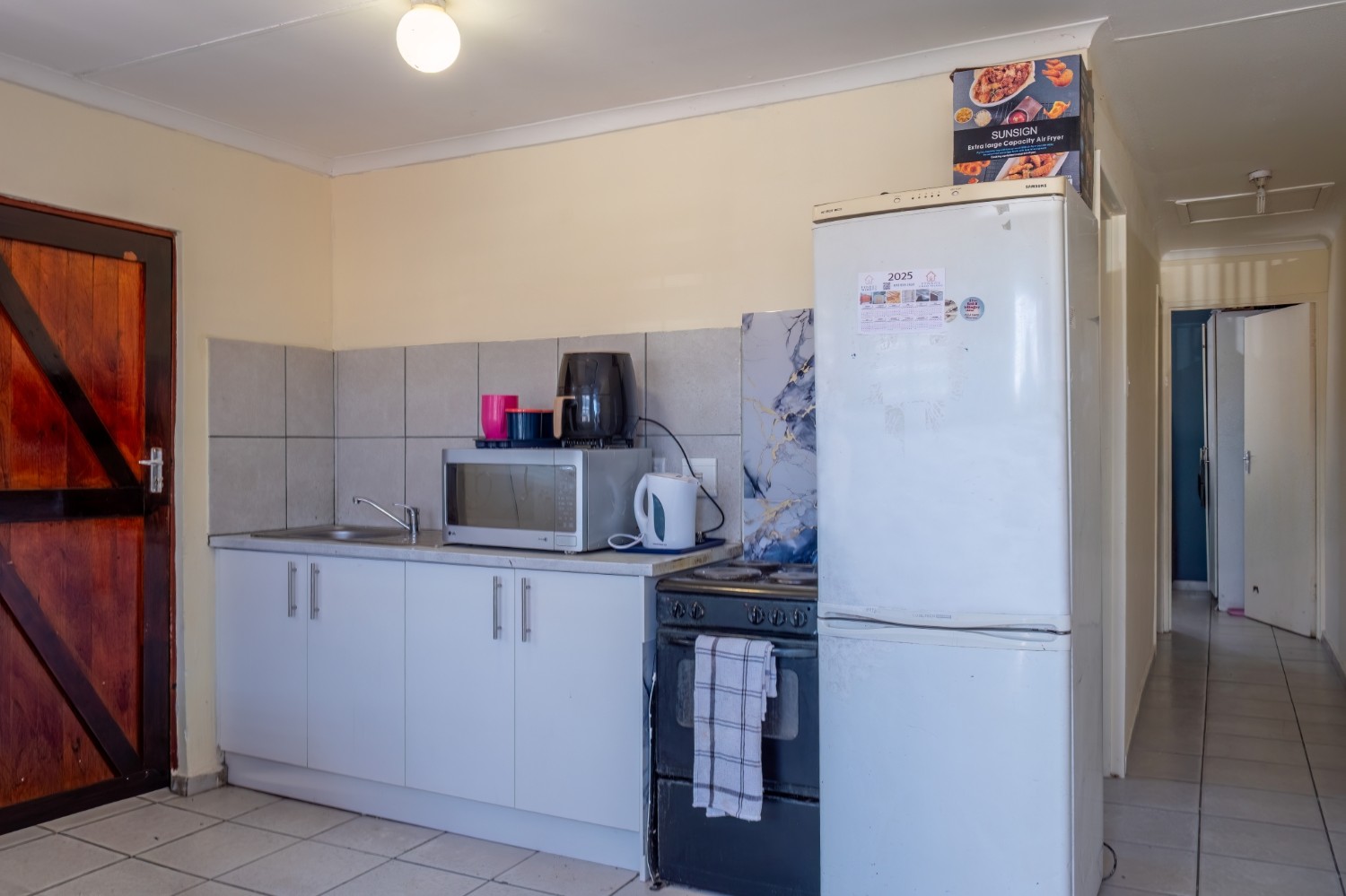 The home features a well-sized lounge with tiled flooring and large windows that allow plenty of natural sunlight to create a bright and welcoming atmosphere. The kitchen offers light wood cupboards and space for a fridge, providing the perfect foundation to design your ideal cooking area.
