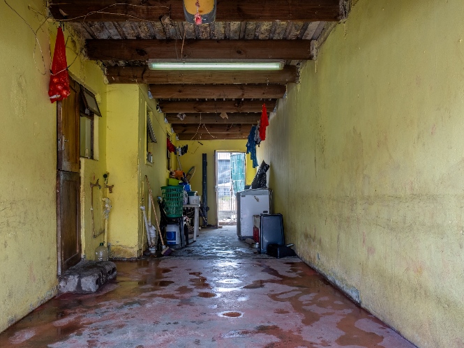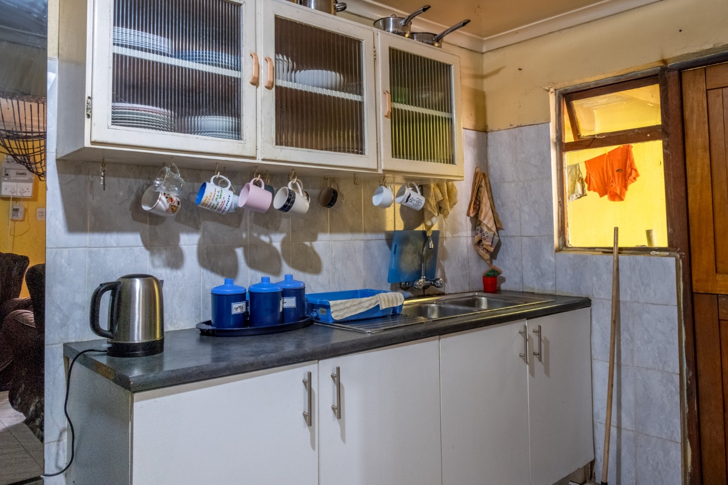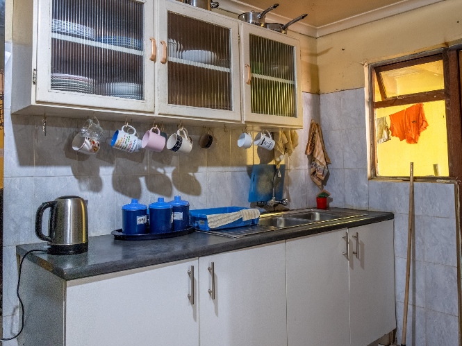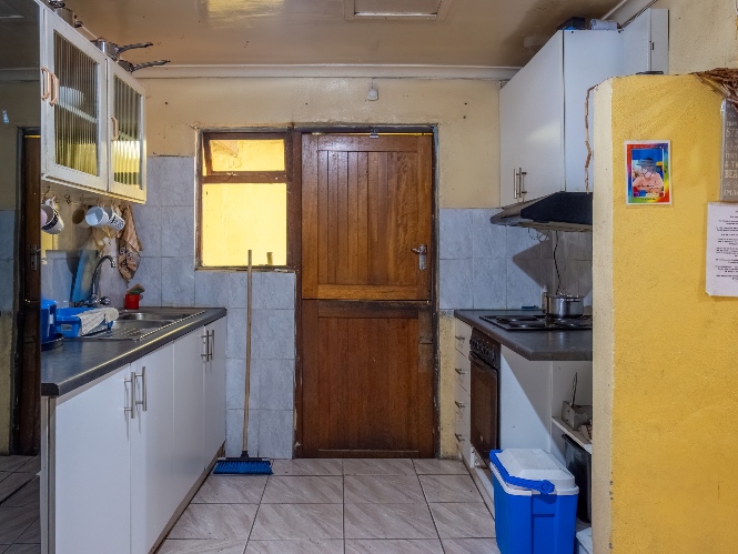 The fully enclosed property features a welcoming lounge with tiled flooring and large windows that allow plenty of natural light to fill the space. The charming kitchen offers light wood cupboards, an under-counter oven and hob, a double sink, as well as ample space for a fridge, making it both functional and inviting.