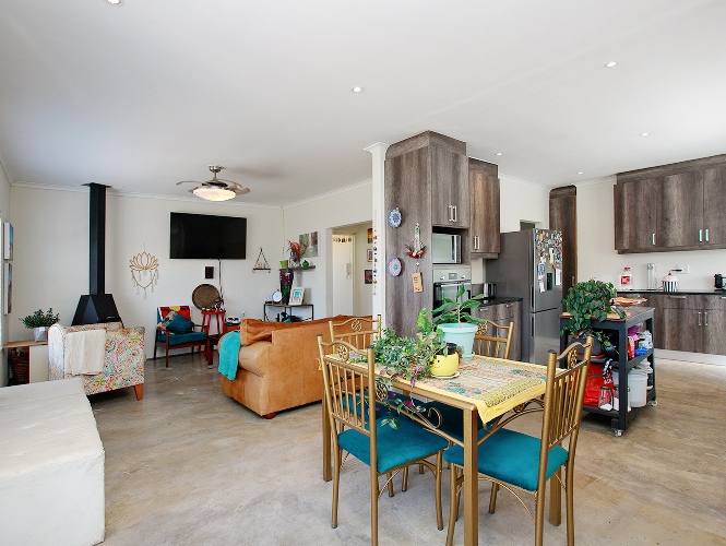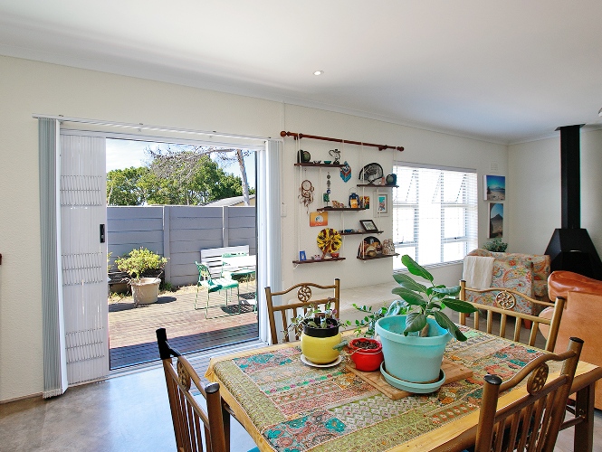 Open plan lounge and dining room with a fireplace and stacking doors onto the deck.