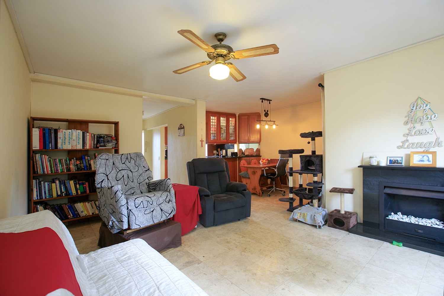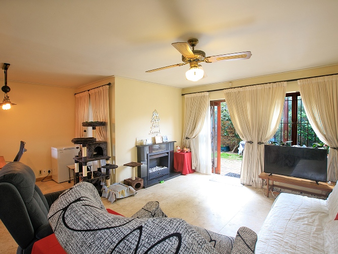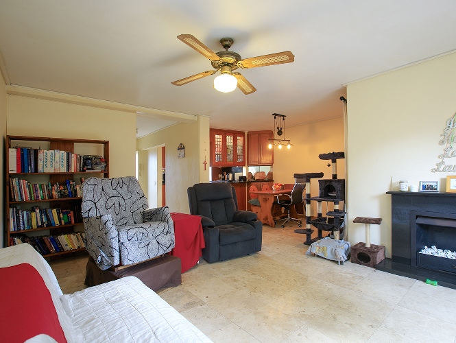 Open plan lounge and dining room with travertine tiles and gas fireplace and patio doors opening onto a pleasant pet-friendly garden.