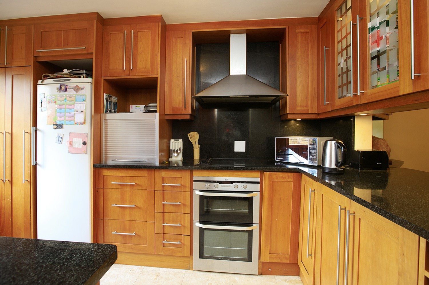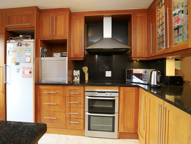 The bespoke Cherry wood and the soft-close kitchen were specially crafted with many details for convenience and storage. It has a double oven and electric hob and extractor and two plumbing points and pantry cupboard.