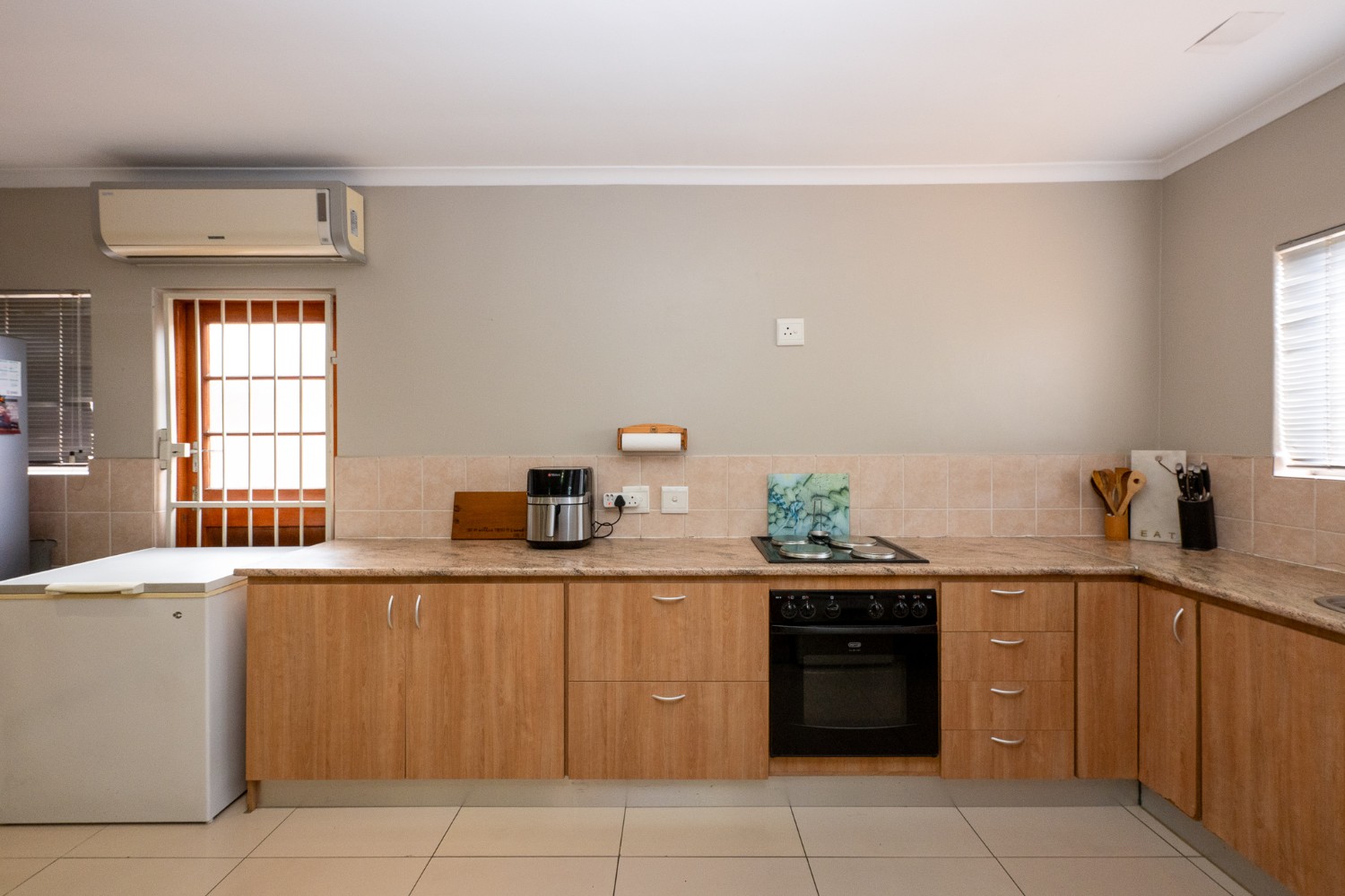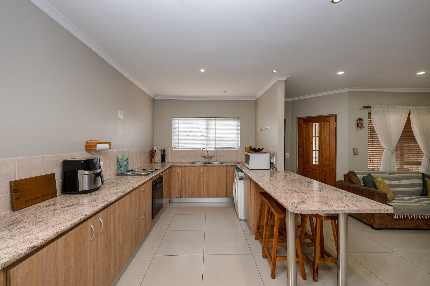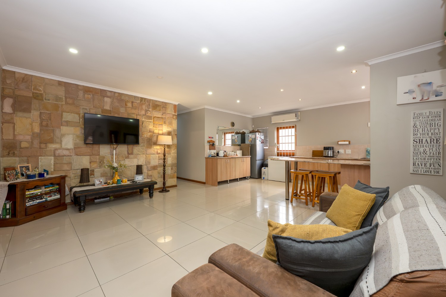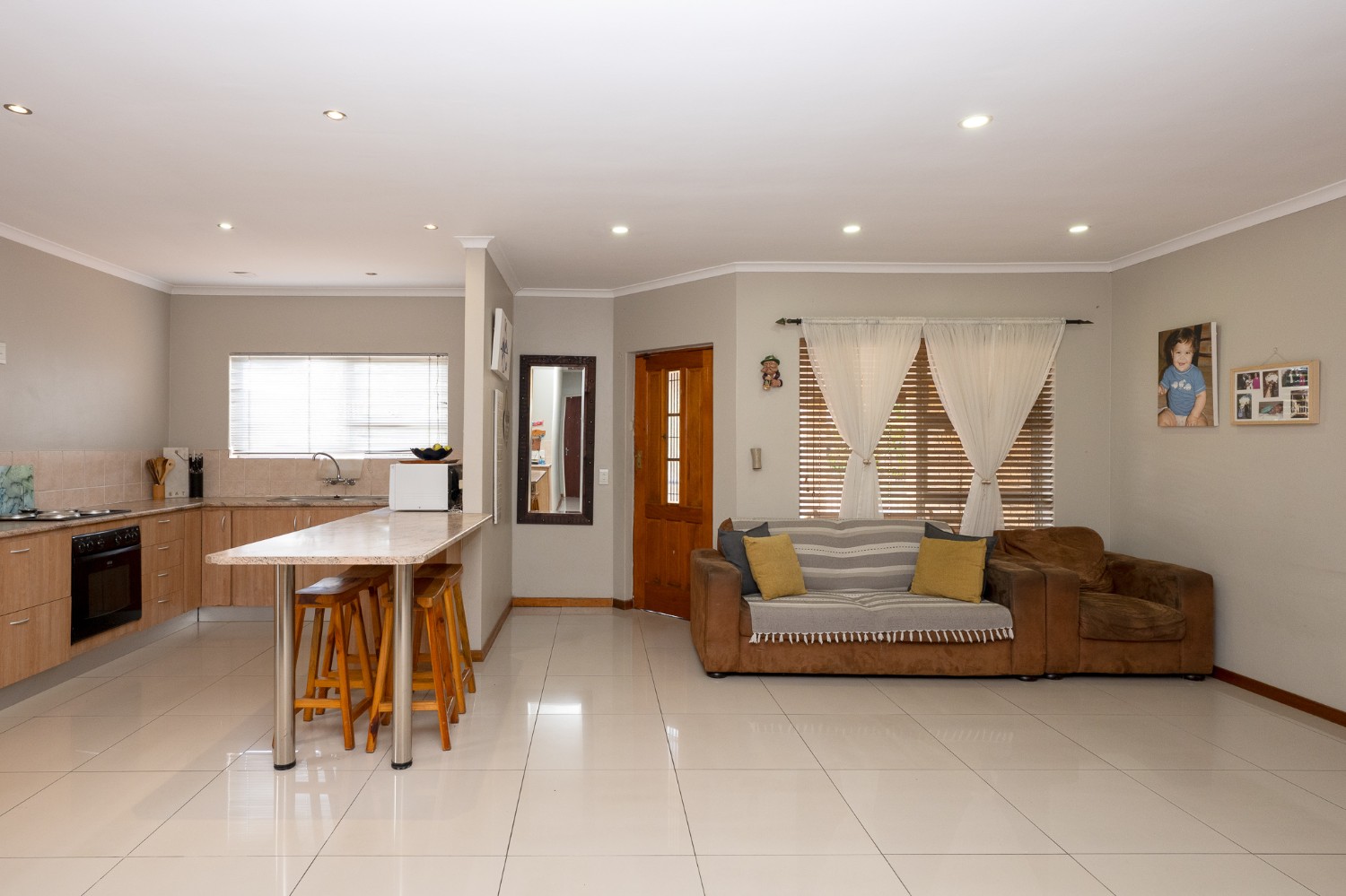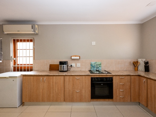 The home features an open-plan lounge and dining room complete with tiled flooring, downlights, and large windows that fill the space with natural light. The tastefully designed kitchen is both functional and stylish, offering ample cupboard space, an under-counter oven, a plumbing point, and space for a fridge, perfect for everyday family living.