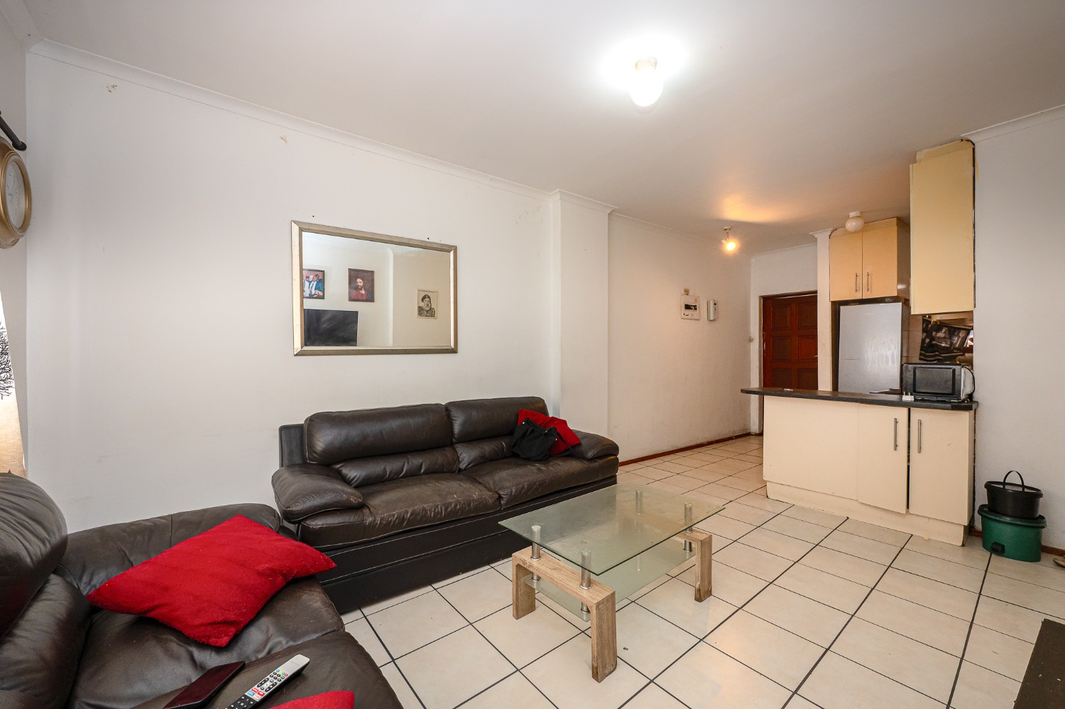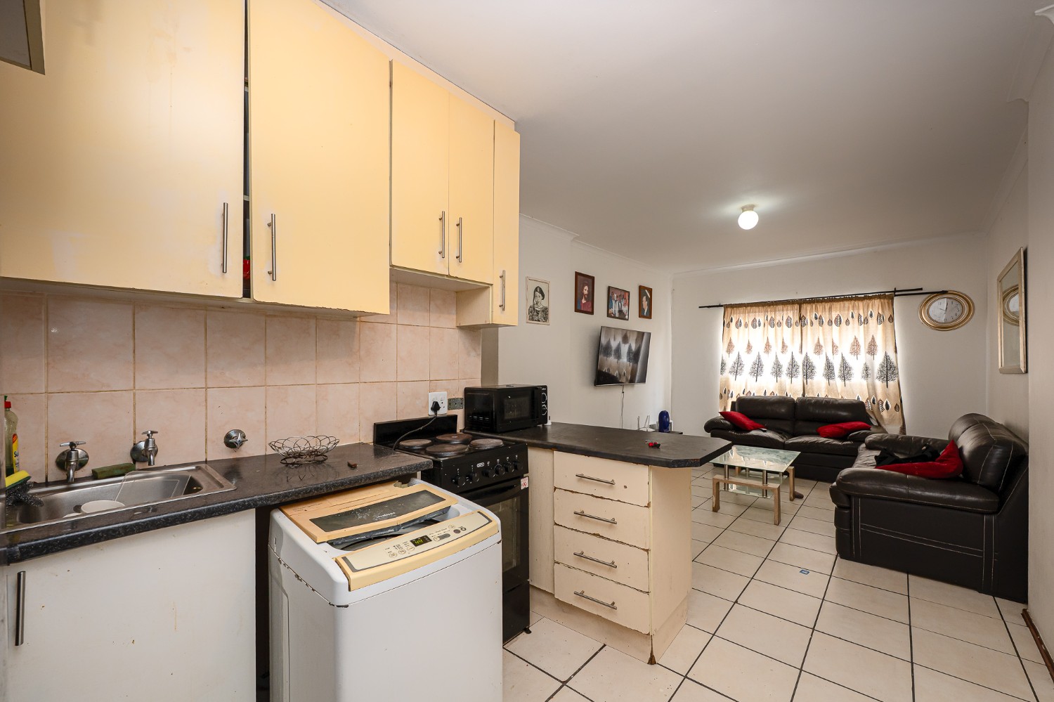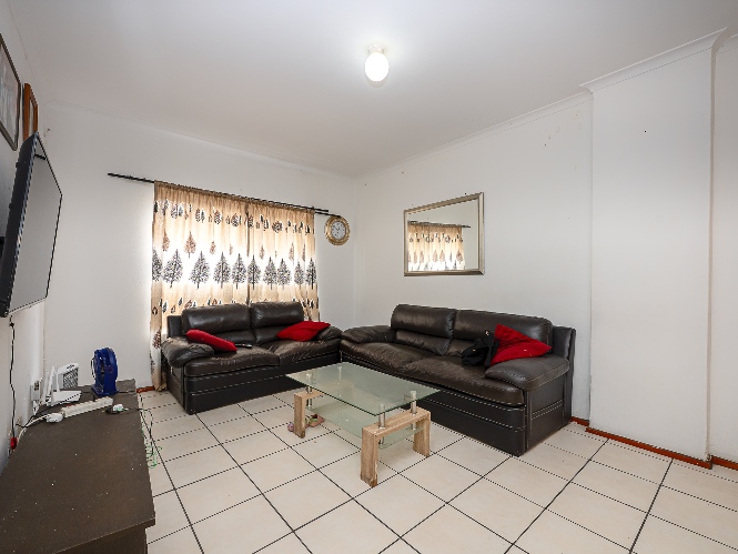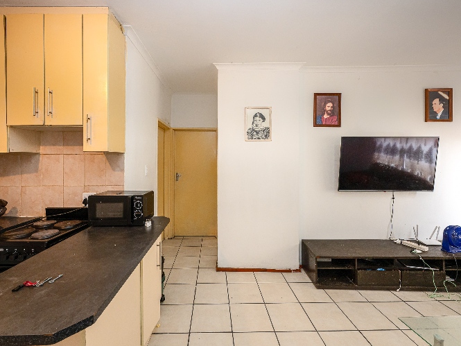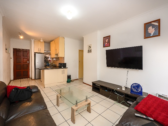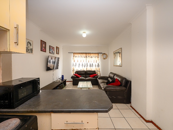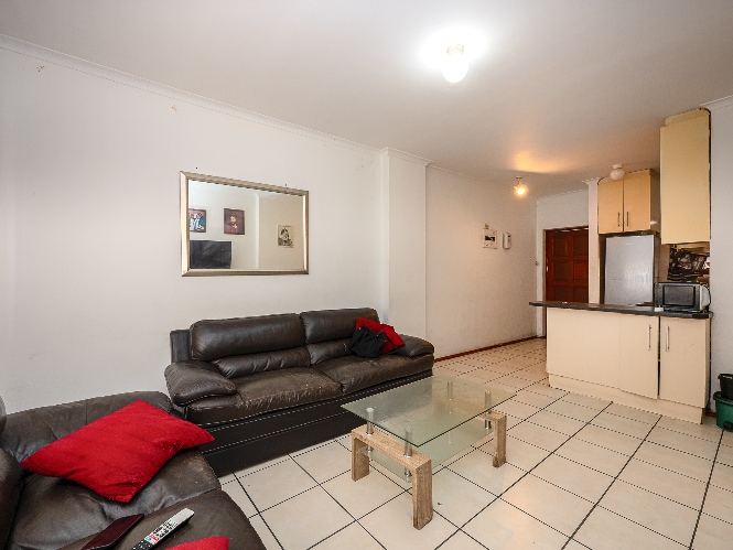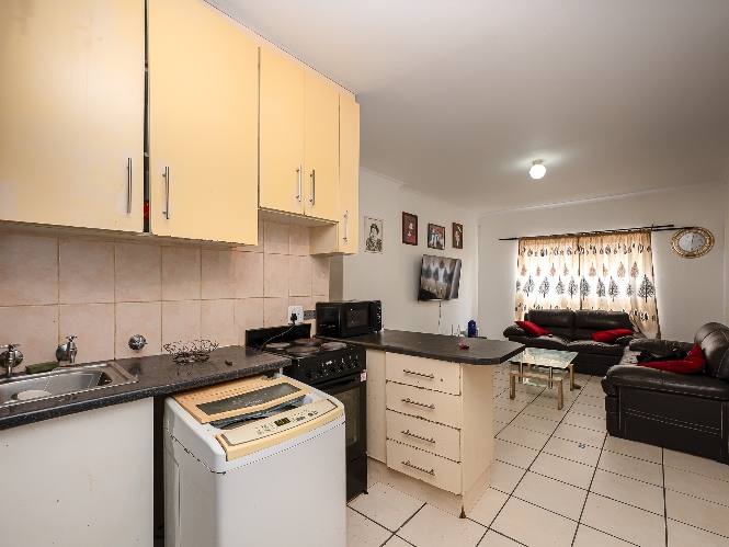 The apartment features a spacious lounge that flows seamlessly into the kitchen, creating a welcoming open-plan living space perfect for relaxing and entertaining. The kitchen offers ample cupboard space, a plumbing point, and space for a fridge.